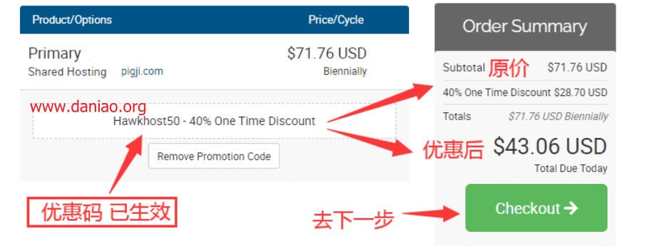 3)在Apply Promo Code那输入优惠码,点Validate Code 确认优惠码,右侧会显示优惠后的价格: