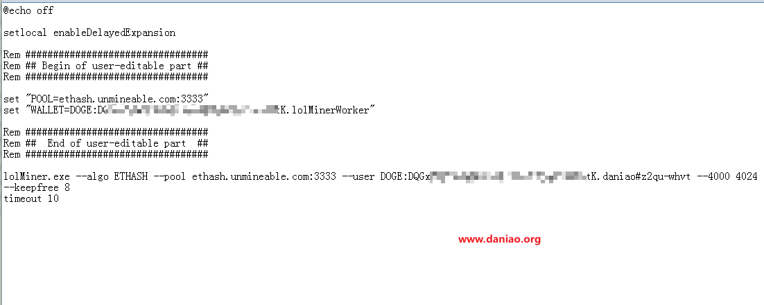 注意:仅修改上面的“钱包地址”这几个字,前面的 DOGE: 以及后面的 .lolMinerWoekr 等都不要改。看图: