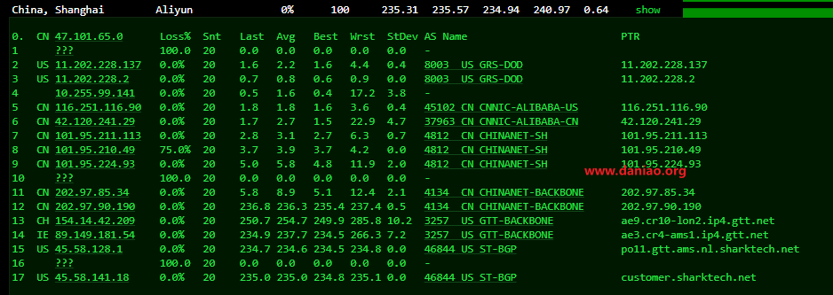 Traceroute to China, Shanghai CT (TCP Mode, Max 30 Hop) ============================================================ traceroute to 180.153.28.5 (180.153.28.5), 30 hops max, 32 byte packets 1 45.58.141.1 0.58 ms AS46844 Netherlands, North Holland, Amsterdam, sharktech.net 2 10.0.0.5 0.51 ms * LAN Address 3 77.67.81.193 1.01 ms AS3257 Germany, gtt.net 4 213.200.117.58 0.73 ms AS3257 Germany, gtt.net 5 81.173.18.33 8.32 ms AS4134 Europe Regions, cteurope.net 6 202.97.15.93 207.02 ms AS4134 China, ChinaTelecom 7 202.97.12.193 226.11 ms AS4134 China, ChinaTelecom 8 202.97.57.158 208.68 ms AS4134 China, ChinaTelecom 9 101.95.88.105 202.63 ms AS4812 China, Shanghai, ChinaTelecom 10 101.95.207.234 209.80 ms AS4812 China, Shanghai, ChinaTelecom 11 124.74.232.54 227.28 ms AS4811 China, Shanghai, ChinaTelecom 12 101.227.255.46 196.38 ms AS4812 China, Shanghai, ChinaTelecom 13 180.153.28.5 195.86 ms AS4812 China, Shanghai, ChinaTelecom