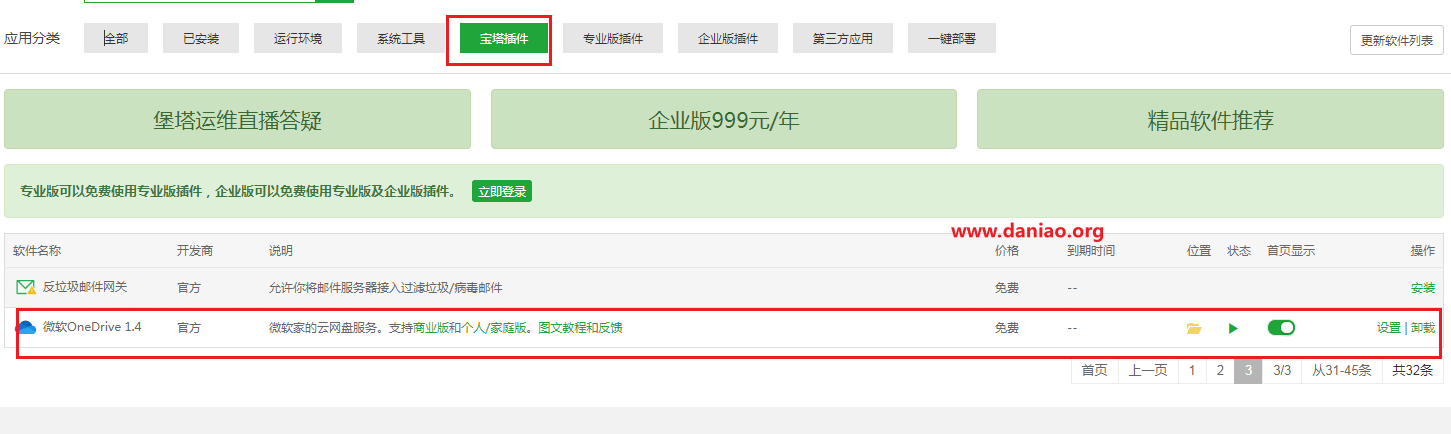 2)宝塔面板安装好后,我们在软件商店安装微软OneDrive插件。