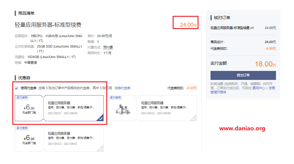 2)如果你领取了一张30的代金券那么可以续费轻量香港的一个月时间,或者用来购买也可以。因为腾讯轻量香港是24个月。也就是8毛钱一天。图示,6块钱的代金券续费,还需要额外支付18,如果你30元的,你就不需要出钱了。所以代金券的面值,拼一下人品了。