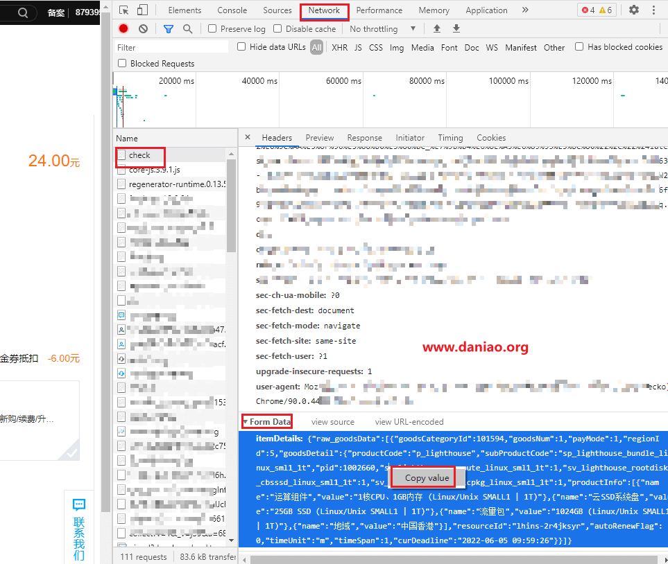 2)此时按下F12,切换到network,刷新页面,找到check,往下来,找到form data,复制包括花括号在内的所有内容。点击右键选择copy value即可。看图: