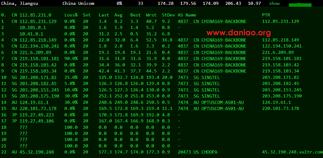 联通:回程走ntt,绕日本,国内走联通骨干线路。去程,走新加坡singtel线路,直奔悉尼!