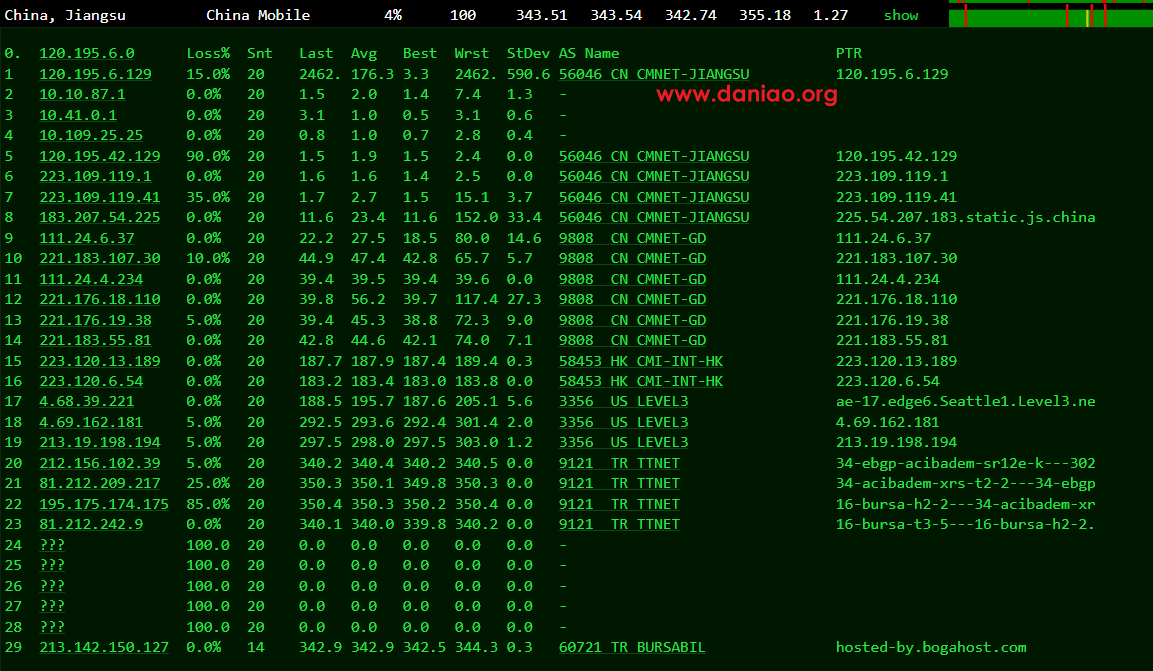 Traceroute to China, Guangzhou CM (TCP Mode, Max 30 Hop) ============================================================ traceroute to 120.196.212.25 (120.196.212.25), 30 hops max, 32 byte packets 1 91.151.83.1 1.38 ms AS60707 Turkey, Istanbul Province, Istanbul, adeox.com 2 10.50.50.9 0.83 ms * LAN Address 3 10.0.3.1 0.90 ms * LAN Address 4 10.0.2.5 2.75 ms * LAN Address 5 10.0.2.13 1.09 ms * LAN Address 6 * 7 * 8 * 9 * 10 * 11 * 12 4.69.167.114 50.38 ms AS3356 Hungary, Budapest, level3.com 13 4.68.110.26 44.14 ms AS3356 Germany, Hesse, Frankfurt, level3.com 14 223.120.10.41 47.84 ms AS58453 Germany, Hesse, Frankfurt, ChinaMobile 15 * 16 * 17 221.183.25.122 287.30 ms AS9808 China, Guangdong, Guangzhou, ChinaMobile 18 221.176.22.157 300.34 ms AS9808 China, Guangdong, Guangzhou, ChinaMobile 19 111.24.5.185 301.23 ms AS9808 China, Guangdong, Guangzhou, ChinaMobile 20 111.24.5.22 290.35 ms AS9808 China, Guangdong, Guangzhou, ChinaMobile 21 211.136.249.13 299.62 ms AS56040 China, Guangdong, Guangzhou, ChinaMobile 22 211.136.249.129 300.85 ms AS56040 China, Guangdong, Guangzhou, ChinaMobile 23 211.139.180.106 247.07 ms AS56040 China, Guangdong, Guangzhou, ChinaMobile 24 * 25 * 26 120.196.212.25 289.71 ms AS56040 China, Guangdong, Guangzhou, ChinaMobile Traceroute to China, Shanghai CM (TCP Mode, Max 30 Hop) ============================================================ traceroute to 221.183.55.22 (221.183.55.22), 30 hops max, 32 byte packets 1 91.151.83.1 1.40 ms AS60707 Turkey, Istanbul Province, Istanbul, adeox.com 2 10.50.50.9 0.98 ms * LAN Address 3 10.0.3.1 0.83 ms * LAN Address 4 10.0.2.5 0.93 ms * LAN Address 5 10.0.2.13 0.84 ms * LAN Address 6 * 7 * 8 * 9 * 10 * 11 * 12 62.115.121.0 43.81 ms AS1299 Germany, Hesse, Frankfurt, telia.com 13 129.250.7.34 52.15 ms AS2914 ntt.com 14 223.120.10.85 49.32 ms AS58453 Germany, Hesse, Frankfurt, ChinaMobile 15 223.120.10.85 47.94 ms AS58453 Germany, Hesse, Frankfurt, ChinaMobile 16 * 17 * 18 * 19 * 20 * 21 * 22 * 23 * 24 * 25 * 26 * 27 * 28 * 29 * 30 * Traceroute to China, Beijing CM (TCP Mode, Max 30 Hop) ============================================================ traceroute to 211.136.25.153 (211.136.25.153), 30 hops max, 32 byte packets 1 91.151.83.1 1.79 ms AS60707 Turkey, Istanbul Province, Istanbul, adeox.com 2 10.50.50.9 1.67 ms * LAN Address 3 10.0.3.1 1.04 ms * LAN Address 4 10.0.2.5 0.87 ms * LAN Address 5 10.0.2.13 1.64 ms * LAN Address 6 * 7 * 8 * 9 * 10 * 11 62.115.38.34 42.80 ms AS1299 Germany, Hesse, Frankfurt, telia.com 12 62.115.121.0 188.28 ms AS1299 Germany, Hesse, Frankfurt, telia.com 13 4.68.110.26 44.16 ms AS3356 Germany, Hesse, Frankfurt, level3.com 14 62.115.112.242 137.32 ms AS1299 United States, Virginia, Ashburn, telia.com 15 * 16 62.115.171.219 204.48 ms AS1299 United States, California, Los Angeles, telia.com 17 223.120.6.22 205.09 ms AS58453 United States, California, Los Angeles, ChinaMobile 18 62.115.171.219 206.19 ms AS1299 United States, California, Los Angeles, telia.com 19 * 20 * 21 221.176.27.253 275.55 ms AS9808 China, Beijing, ChinaMobile 22 211.136.67.166 179.39 ms AS56048 China, Beijing, ChinaMobile 23 211.136.63.66 276.61 ms AS56048 China, Beijing, ChinaMobile 24 * 25 * 26 211.136.63.66 379.29 ms AS56048 China, Beijing, ChinaMobile 27 211.136.25.153 178.73 ms AS56048 China, Beijing, ChinaMobile