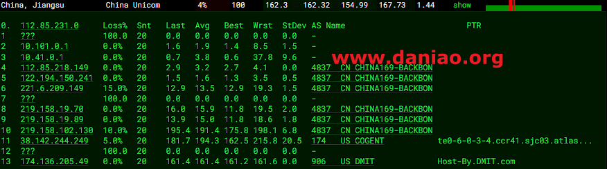 联通去程:联通骨干对接cogent,直连到圣何塞。