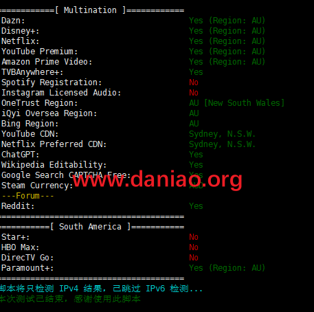 ---------------------------------------------------------------------- 北京电信 traceroute to 219.141.147.210 (219.141.147.210), 30 hops max, 32 byte packets 1 38.55.104.1 50.27 ms AS8888 Australia, New South Wales, Sydney, cogentco.com 2 cr01-2.wallabie.syd05.xtom.au (91.200.241.238) 3.81 ms * Australia, New South Wales, Sydney, xtom.com 3 43.252.87.69 3.01 ms AS10099 China, Hong Kong, ChinaUnicom 4 61.14.201.113 124.08 ms * China, Hong Kong, ChinaUnicom 5 202.77.23.157 113.26 ms AS10099 China, Hong Kong, ChinaUnicom 6 218.105.11.89 119.52 ms AS9929 China, Guangdong, Guangzhou, ChinaUnicom 7 218.105.2.241 123.79 ms AS9929 China, Guangdong, Guangzhou, ChinaUnicom 8 218.105.131.145 150.70 ms AS9929 China, Beijing, ChinaUnicom 9 210.78.30.166 157.79 ms * China, Beijing, ChinaUnicom 10 * 11 * 12 * 13 6.254.120.106.static.bjtelecom.net (106.120.254.6) 152.30 ms AS4847 China, Beijing, ChinaTelecom 14 * 15 * 16 * 17 * 18 * 19 bj141-147-210.bjtelecom.net (219.141.147.210) 212.47 ms AS4847 China, Beijing, ChinaTelecom ---------------------------------------------------------------------- 上海电信 traceroute to 202.96.209.133 (202.96.209.133), 30 hops max, 32 byte packets 1 38.55.104.1 3.20 ms AS8888 Australia, New South Wales, Sydney, cogentco.com 2 cr01-2.wallabie.syd05.xtom.au (91.200.241.238) 0.42 ms * Australia, New South Wales, Sydney, xtom.com 3 43.252.87.69 7.09 ms AS10099 China, Hong Kong, ChinaUnicom 4 61.14.201.113 120.49 ms * China, Hong Kong, ChinaUnicom 5 202.77.23.157 112.95 ms AS10099 China, Hong Kong, ChinaUnicom 6 218.105.7.213 115.51 ms AS9929 China, Guangdong, Guangzhou, ChinaUnicom 7 218.105.2.109 121.84 ms AS9929 China, Guangdong, Guangzhou, ChinaUnicom 8 218.105.131.182 145.09 ms AS9929 China, Shanghai, ChinaUnicom 9 218.105.2.150 142.00 ms AS9929 China, Shanghai, ChinaUnicom 10 202.97.16.65 205.65 ms AS4134 China, Shanghai, ChinaTelecom 11 202.97.62.77 137.35 ms AS4134 China, Shanghai, ChinaTelecom 12 * 13 180.169.255.122 159.63 ms AS4812 China, Shanghai, ChinaTelecom 14 * 15 * 16 * 17 * 18 * 19 * 20 * 21 * 22 * 23 * 24 * 25 * 26 * 27 * 28 * 29 * 30 * ---------------------------------------------------------------------- 深圳电信 traceroute to 58.60.188.222 (58.60.188.222), 30 hops max, 32 byte packets 1 38.55.104.1 8.30 ms AS8888 Australia, New South Wales, Sydney, cogentco.com 2 cr01-2.wallabie.syd05.xtom.au (91.200.241.238) 2.07 ms * Australia, New South Wales, Sydney, xtom.com 3 43.252.87.69 8.87 ms AS10099 China, Hong Kong, ChinaUnicom 4 61.14.201.113 112.97 ms * China, Hong Kong, ChinaUnicom 5 202.77.23.157 113.16 ms AS10099 China, Hong Kong, ChinaUnicom 6 218.105.7.217 122.27 ms AS9929 China, Guangdong, Guangzhou, ChinaUnicom 7 218.105.2.157 122.78 ms AS9929 China, Guangdong, Guangzhou, ChinaUnicom 8 210.14.161.150 124.79 ms * China, Guangdong, Guangzhou, ChinaUnicom 9 * 10 202.97.55.133 144.50 ms AS4134 China, Guangdong, Guangzhou, ChinaTelecom 11 14.147.127.70 147.58 ms AS4134 China, Guangdong, Shenzhen, ChinaTelecom 12 * 13 58.60.188.222 146.94 ms AS4134 China, Guangdong, Shenzhen, ChinaTelecom