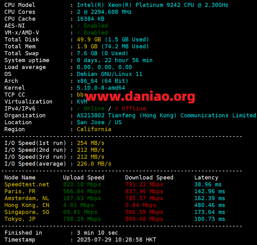 Xeon(R) Platinum 9242 CPU @ 2.30GHz,磁盘io当前测试为226MB/s