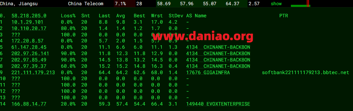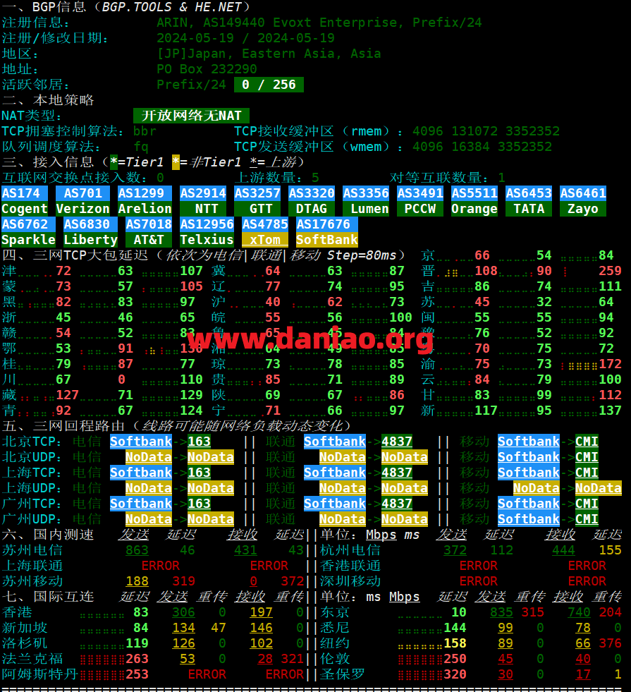 北京电信 NextTrace v1.4.2 2025-07-26T12:51:39Z cefed2a [NextTrace API] preferred API IP - [2606:4700:20::681a:d97] - 360.70ms - Misaka.LAX IP Geo Data Provider: LeoMoeAPI traceroute to 219.141.147.210, 30 hops max, 52 bytes payload, ICMP mode 1 23.27.11.1 AS149440 美国 加利福尼亚 圣克拉拉 evoxt.com 1.62 ms / 1.68 ms / 1.70 ms 2 203.96.239.240 AS4785 日本 大阪府 大阪市 xtom.com 203.96.239.240.static.xtom.com 13.31 ms / 17.93 ms / 11.70 ms 3 203.96.236.1 AS4785 [OWL-JP] 日本 大阪府 大阪 xtom.com 0.35 ms / 0.45 ms / 0.36 ms 4 203.96.236.9 AS4785 [OWL-JP] 日本 大阪府 大阪 xtom.com 203.96.236.9.static.xtom.com 4.69 ms / 8.56 ms / 1.78 ms 5 203.96.236.6 AS4785 [OWL-JP] 日本 大阪府 大阪 xtom.com 203.96.236.6.static.xtom.com 0.51 ms / 1.50 ms / 1.09 ms 6 211.15.42.254 AS17676 [JPNIC-NET] 日本 大阪府 大阪 softbank.jp 0.39 ms / 0.58 ms / 0.44 ms 7 211.15.42.253 AS17676 [JPNIC-NET] 日本 大阪府 大阪 softbank.jp 1.45 ms / 1.60 ms / 1.78 ms 8 * 9 * 10 * 11 * 12 * 13 * 14 202.97.83.34 AS4134 [CHINANET-BB] 中国 上海 www.chinatelecom.com.cn 电信 87.87 ms / 88.12 ms / * ms 15 * 16 * 17 106.120.254.2 AS4847 [CHINANET-GD] 中国 北京 chinatelecom.cn 112.23 ms / * ms / * ms 18 219.141.147.210 AS4847 [CHINATELECOM-BJ] 中国 北京 chinatelecom.cn 61.03 ms / 61.26 ms / 61.21 ms ---------------------------------------------------------------------- 上海电信 NextTrace v1.4.2 2025-07-26T12:51:39Z cefed2a [NextTrace API] preferred API IP - [2606:4700:20::681a:c97] - 135.19ms - Misaka.LAX IP Geo Data Provider: LeoMoeAPI traceroute to 202.96.209.133, 30 hops max, 52 bytes payload, ICMP mode 1 23.27.11.1 AS149440 美国 加利福尼亚 圣克拉拉 evoxt.com 9.17 ms / 2.24 ms / 2.19 ms 2 203.96.239.240 AS4785 日本 大阪府 大阪市 xtom.com 203.96.239.240.static.xtom.com 12.80 ms / 17.95 ms / 18.59 ms 3 203.96.236.1 AS4785 [OWL-JP] 日本 大阪府 大阪 xtom.com 203.96.236.1.static.xtom.com 0.39 ms / 0.52 ms / 0.45 ms 4 203.96.236.0 AS4785 [OWL-JP] 日本 大阪府 大阪市 xtom.com 0.68 ms / 0.53 ms / 1.83 ms 5 203.96.236.63 AS4785 [OWL-JP] 日本 大阪府 大阪 xtom.com cs1708.q51.os1.xtom.jp 8.45 ms / 3.73 ms / 46.36 ms 6 211.15.42.254 AS17676 [JPNIC-NET] 日本 大阪府 大阪 softbank.jp 0.54 ms / 0.65 ms / 0.61 ms 7 211.15.42.253 AS17676 [JPNIC-NET] 日本 大阪府 大阪 softbank.jp 1.50 ms / 1.52 ms / 1.92 ms 8 * 9 * 10 * 11 * 12 * 13 * 14 * 15 61.152.26.77 AS4812 [CHINANET-SH] 中国 上海 chinatelecom.cn 电信 43.58 ms / 41.09 ms / 37.82 ms 16 61.152.1.166 AS4812 [CHINANET-SH] 中国 上海 chinatelecom.cn 38.83 ms / 182.80 ms / 132.61 ms 17 202.96.209.133 AS4812 [CHINANET-SH] 中国 上海 chinatelecom.cn 电信 ns-pd.online.sh.cn 39.97 ms / 40.97 ms / 40.01 ms ---------------------------------------------------------------------- 深圳电信 NextTrace v1.4.2 2025-07-26T12:51:39Z cefed2a [NextTrace API] preferred API IP - [2606:4700:20::ac43:45a3] - 148.00ms - Misaka.LAX IP Geo Data Provider: LeoMoeAPI traceroute to 58.60.188.222, 30 hops max, 52 bytes payload, ICMP mode 1 23.27.11.1 AS149440 美国 加利福尼亚 圣克拉拉 evoxt.com 1.83 ms / 5.13 ms / 3.05 ms 2 203.96.239.240 AS4785 日本 大阪府 大阪市 xtom.com 203.96.239.240.static.xtom.com 12.51 ms / 16.69 ms / 20.79 ms 3 203.96.236.1 AS4785 [OWL-JP] 日本 大阪府 大阪 xtom.com 0.33 ms / 0.41 ms / 0.39 ms 4 203.96.236.0 AS4785 [OWL-JP] 日本 大阪府 大阪市 xtom.com 0.51 ms / 0.62 ms / 0.52 ms 5 203.96.236.63 AS4785 [OWL-JP] 日本 大阪府 大阪 xtom.com cs1708.q51.os1.xtom.jp 18.13 ms / 4.06 ms / 8.82 ms 6 211.15.42.254 AS17676 [JPNIC-NET] 日本 大阪府 大阪 softbank.jp 0.33 ms / 0.60 ms / 0.39 ms 7 211.15.42.253 AS17676 [JPNIC-NET] 日本 大阪府 大阪 softbank.jp 1.44 ms / 1.50 ms / 1.48 ms 8 * 9 * 10 * 11 * 12 221.111.202.18 AS17676 [BBTEC] 中国 上海 softbank.jp softbank221111202018.bbtec.net 27.17 ms / 27.41 ms / 27.11 ms 13 202.97.39.174 AS4134 [CHINANET-BB] 中国 上海 www.chinatelecom.com.cn 电信 85.56 ms / * ms / * ms 14 202.97.71.29 AS4134 [CHINANET-BB] 中国 上海 www.chinatelecom.com.cn 电信 138.27 ms / * ms / * ms 15 * 16 * 17 * 18 * 19 * 20 * 21 * 22 * 23 * 24 * 25 * 26 * 27 * 28 * 29 * 30 *