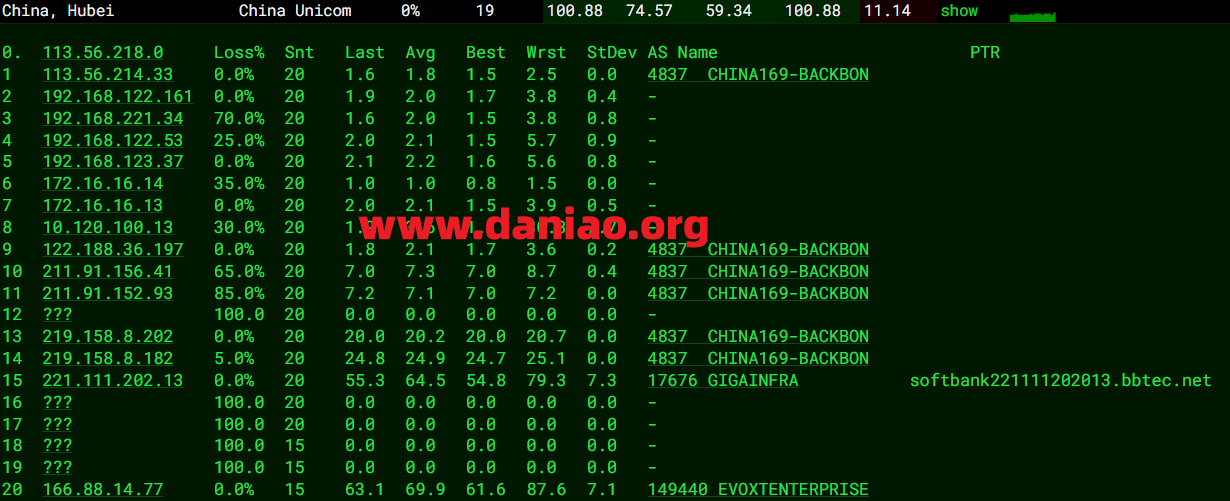 北京联通 NextTrace v1.4.2 2025-07-26T12:51:39Z cefed2a [NextTrace API] preferred API IP - 104.26.13.151 - 139.64ms - Misaka.LAX IP Geo Data Provider: LeoMoeAPI traceroute to 202.106.50.1, 30 hops max, 52 bytes payload, ICMP mode 1 23.27.11.1 AS149440 美国 加利福尼亚 圣克拉拉 evoxt.com 10.60 ms / 2.77 ms / 1.98 ms 2 203.96.239.240 AS4785 日本 大阪府 大阪市 xtom.com 203.96.239.240.static.xtom.com 21.20 ms / 15.99 ms / 20.62 ms 3 203.96.236.1 AS4785 [OWL-JP] 日本 大阪府 大阪 xtom.com 203.96.236.1.static.xtom.com 0.36 ms / 0.54 ms / 0.39 ms 4 203.96.236.0 AS4785 [OWL-JP] 日本 大阪府 大阪市 xtom.com 0.73 ms / 0.69 ms / 0.64 ms 5 203.96.236.63 AS4785 [OWL-JP] 日本 大阪府 大阪 xtom.com cs1708.q51.os1.xtom.jp 8.38 ms / 20.87 ms / 71.19 ms 6 211.15.42.254 AS17676 [JPNIC-NET] 日本 大阪府 大阪 softbank.jp 0.57 ms / 0.42 ms / 0.43 ms 7 211.15.42.253 AS17676 [JPNIC-NET] 日本 大阪府 大阪 softbank.jp 1.77 ms / 1.47 ms / 1.53 ms 8 * 9 * 10 * 11 * 12 * 13 221.111.202.70 AS17676 [BBTEC] 中国 北京 BBTEC-CU-Peer softbank.jp softbank221111202070.bbtec.net 113.10 ms / 109.42 ms / * ms 14 219.158.9.113 AS4837 [CU169-BACKBONE] 中国 北京 chinaunicom.cn 50.25 ms / 49.91 ms / * ms 15 * 16 * 17 202.106.50.1 AS4808 [UNICOM-BJ] 中国 北京 丰台区 中国联通 联通 54.88 ms / 54.76 ms / 54.91 ms ---------------------------------------------------------------------- 上海联通 NextTrace v1.4.2 2025-07-26T12:51:39Z cefed2a [NextTrace API] preferred API IP - 104.26.13.151 - 134.67ms - Misaka.LAX IP Geo Data Provider: LeoMoeAPI traceroute to 210.22.97.1, 30 hops max, 52 bytes payload, ICMP mode 1 23.27.11.1 AS149440 美国 加利福尼亚 圣克拉拉 evoxt.com 12.44 ms / 3.47 ms / 1.76 ms 2 203.96.239.240 AS4785 日本 大阪府 大阪市 xtom.com 203.96.239.240.static.xtom.com 22.41 ms / 72.80 ms / 10.86 ms 3 203.96.236.1 AS4785 [OWL-JP] 日本 大阪府 大阪 xtom.com 203.96.236.1.static.xtom.com 0.58 ms / 0.43 ms / 0.48 ms 4 203.96.236.9 AS4785 [OWL-JP] 日本 大阪府 大阪 xtom.com 203.96.236.9.static.xtom.com 7.27 ms / 4.36 ms / 8.66 ms 5 203.96.236.6 AS4785 [OWL-JP] 日本 大阪府 大阪 xtom.com 203.96.236.6.static.xtom.com 0.65 ms / 0.52 ms / 0.75 ms 6 211.15.42.254 AS17676 [JPNIC-NET] 日本 大阪府 大阪 softbank.jp 0.50 ms / 0.51 ms / 0.39 ms 7 211.15.42.253 AS17676 [JPNIC-NET] 日本 大阪府 大阪 softbank.jp 1.49 ms / 1.52 ms / 1.62 ms 8 * 9 * 10 * 11 * 12 * 13 * 14 219.158.9.214 AS4837 [CU169-BACKBONE] 中国 北京 chinaunicom.cn 联通 108.42 ms / * ms / * ms 15 * 16 * 17 * 18 112.64.250.202 AS17621 [APNIC-AP] 中国 上海 chinaunicom.cn 联通 49.76 ms / * ms / * ms 19 210.22.97.1 AS17621 [CNCNET-SH] 中国 上海 闵行区 chinaunicom.cn 联通 55.82 ms / 55.77 ms / 55.94 ms ---------------------------------------------------------------------- 深圳联通 NextTrace v1.4.2 2025-07-26T12:51:39Z cefed2a [NextTrace API] preferred API IP - 172.67.69.163 - 133.13ms - Misaka.LAX IP Geo Data Provider: LeoMoeAPI traceroute to 210.21.196.6, 30 hops max, 52 bytes payload, ICMP mode 1 23.27.11.1 AS149440 美国 加利福尼亚 圣克拉拉 evoxt.com 3.54 ms / 2.77 ms / 8.23 ms 2 203.96.239.240 AS4785 日本 大阪府 大阪市 xtom.com 203.96.239.240.static.xtom.com 15.95 ms / 20.35 ms / 42.85 ms 3 203.96.236.1 AS4785 [OWL-JP] 日本 大阪府 大阪 xtom.com 203.96.236.1.static.xtom.com 0.66 ms / 0.52 ms / 0.42 ms 4 203.96.236.5 AS4785 [OWL-JP] 日本 大阪府 大阪 xtom.com 203.96.236.5.static.xtom.com 2.58 ms / 7.19 ms / 0.70 ms 5 203.96.236.2 AS4785 [OWL-JP] 日本 大阪府 大阪 xtom.com 203.96.236.2.static.xtom.com 0.69 ms / 0.56 ms / 0.46 ms 6 211.15.42.254 AS17676 [JPNIC-NET] 日本 大阪府 大阪 softbank.jp 0.53 ms / 0.43 ms / 0.34 ms 7 211.15.42.253 AS17676 [JPNIC-NET] 日本 大阪府 大阪 softbank.jp 1.73 ms / 1.42 ms / 1.51 ms 8 * 9 * 10 * 11 * 12 * 13 221.111.202.70 AS17676 [BBTEC] 中国 北京 BBTEC-CU-Peer softbank.jp softbank221111202070.bbtec.net 57.54 ms / 56.13 ms / 56.04 ms 14 * 15 219.158.4.173 AS4837 [CU169-BACKBONE] 中国 北京 chinaunicom.cn 联通 152.84 ms / * ms / * ms 16 * 17 * 18 120.80.144.38 AS17623 [APNIC-AP] 中国 广东 深圳 chinaunicom.cn 联通 79.60 ms / 79.40 ms / 81.21 ms 19 210.21.196.6 AS17623 中国 广东 深圳 宝安区 chinaunicom.cn 联通