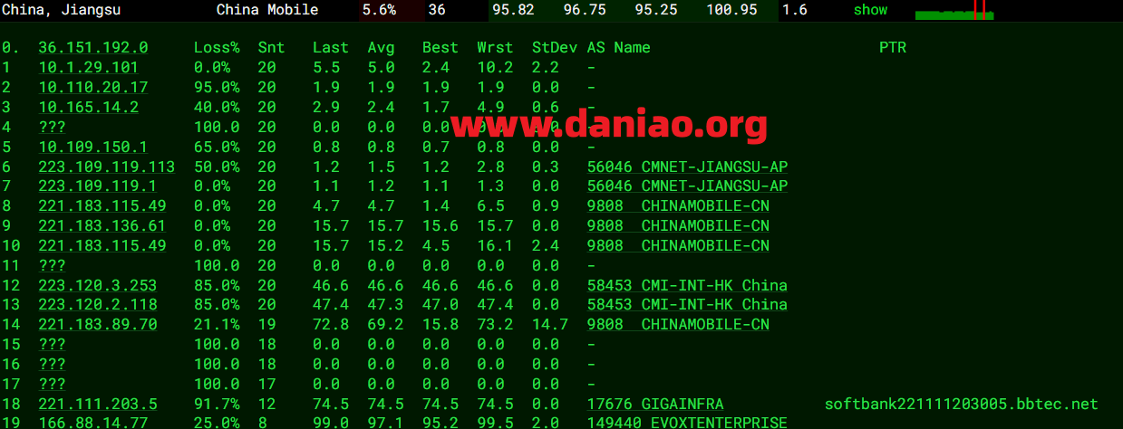 北京移动 NextTrace v1.4.2 2025-07-26T12:51:39Z cefed2a [NextTrace API] preferred API IP - 104.26.13.151 - 133.47ms - Misaka.LAX IP Geo Data Provider: LeoMoeAPI traceroute to 221.179.155.161, 30 hops max, 52 bytes payload, ICMP mode 1 23.27.11.1 AS149440 美国 加利福尼亚 圣克拉拉 evoxt.com 1.62 ms / 2.76 ms / 2.78 ms 2 203.96.239.240 AS4785 日本 大阪府 大阪市 xtom.com 15.34 ms / 15.23 ms / 19.84 ms 3 203.96.236.1 AS4785 [OWL-JP] 日本 大阪府 大阪 xtom.com 203.96.236.1.static.xtom.com 0.47 ms / 0.53 ms / 1.39 ms 4 203.96.236.0 AS4785 [OWL-JP] 日本 大阪府 大阪市 xtom.com 0.50 ms / 0.52 ms / 1.52 ms 5 203.96.236.63 AS4785 [OWL-JP] 日本 大阪府 大阪 xtom.com cs1708.q51.os1.xtom.jp 8.63 ms / 2.23 ms / 2.74 ms 6 211.15.42.254 AS17676 [JPNIC-NET] 日本 大阪府 大阪 softbank.jp 0.50 ms / 0.76 ms / 0.62 ms 7 211.15.42.253 AS17676 [JPNIC-NET] 日本 大阪府 大阪 softbank.jp 1.56 ms / 1.55 ms / 1.50 ms 8 * 9 * 10 * 11 * 12 221.111.202.238 AS17676 [BBTEC] 日本 东京都 东京 softbank.jp softbank221111202238.bbtec.net 7.63 ms / 7.63 ms / 8.02 ms 13 223.120.14.182 AS58453 [CMI-INT] 中国 北京 cmi.chinamobile.com 移动 75.85 ms / 75.61 ms / 75.98 ms 14 221.183.55.110 AS9808 [CMNET] 中国 北京 X-I chinamobileltd.com 移动 124.79 ms / 125.13 ms / * ms 15 221.183.25.201 AS9808 [CMNET] 中国 北京 I-C chinamobileltd.com 移动 184.31 ms / * ms / * ms 16 * 17 221.183.46.178 AS9808 [CMNET] 中国 北京 chinamobileltd.com 移动 76.08 ms / 76.10 ms / 76.00 ms 18 * 19 221.179.155.161 AS56048 [CMNET] 中国 北京 bj.10086.cn 移动 86.36 ms / 86.41 ms / 86.39 ms ---------------------------------------------------------------------- 上海移动 NextTrace v1.4.2 2025-07-26T12:51:39Z cefed2a [NextTrace API] preferred API IP - 172.67.69.163 - 129.07ms - Misaka.LAX IP Geo Data Provider: LeoMoeAPI traceroute to 211.136.112.200, 30 hops max, 52 bytes payload, ICMP mode 1 23.27.11.1 AS149440 美国 加利福尼亚 圣克拉拉 evoxt.com 1.73 ms / 1.88 ms / 1.63 ms 2 203.96.239.240 AS4785 日本 大阪府 大阪市 xtom.com 203.96.239.240.static.xtom.com 13.46 ms / 17.18 ms / 17.86 ms 3 203.96.236.1 AS4785 [OWL-JP] 日本 大阪府 大阪 xtom.com 203.96.236.1.static.xtom.com 0.99 ms / 0.57 ms / 0.41 ms 4 203.96.236.0 AS4785 [OWL-JP] 日本 大阪府 大阪市 xtom.com 0.51 ms / 3.83 ms / 1.12 ms 5 203.96.236.65 AS4785 [OWL-JP] 日本 大阪府 大阪 xtom.com cs1708.q511.os1.xtom.jp 14.92 ms / 14.74 ms / 14.34 ms 6 211.15.42.254 AS17676 [JPNIC-NET] 日本 大阪府 大阪 softbank.jp 0.51 ms / 0.39 ms / 0.58 ms 7 211.15.42.253 AS17676 [JPNIC-NET] 日本 大阪府 大阪 softbank.jp 1.46 ms / 1.47 ms / 1.50 ms 8 * 9 * 10 * 11 * 12 221.111.202.238 AS17676 [BBTEC] 日本 东京都 东京 softbank.jp softbank221111202238.bbtec.net 8.03 ms / 8.47 ms / 7.98 ms 13 223.120.2.230 AS58453 [CMI-INT] 中国 香港 cmi.chinamobile.com 82.51 ms / 82.45 ms / 82.47 ms 14 221.183.89.178 AS9808 [CMNET] 中国 上海 X-I chinamobileltd.com 移动 84.38 ms / 84.57 ms / 84.37 ms 15 * 16 221.183.89.14 AS9808 [CMNET] 中国 上海 chinamobileltd.com 移动 81.75 ms / * ms / * ms 17 221.183.144.78 AS9808 [CMNET] 中国 上海 chinamobileltd.com 179.36 ms / * ms / * ms 18 * 19 211.136.112.252 AS24400 [CMNET] 中国 上海 sh.10086.cn 移动 88.38 ms / 88.47 ms / 88.35 ms 20 211.136.112.200 AS24400 [CMNET] 中国 上海 浦东新区 sh.10086.cn 移动 88.46 ms / 88.53 ms / 88.37 ms ---------------------------------------------------------------------- 深圳移动 NextTrace v1.4.2 2025-07-26T12:51:39Z cefed2a [NextTrace API] preferred API IP - [2606:4700:20::681a:d97] - 145.18ms - Misaka.LAX IP Geo Data Provider: LeoMoeAPI traceroute to 120.196.165.24, 30 hops max, 52 bytes payload, ICMP mode 1 23.27.11.1 AS149440 美国 加利福尼亚 圣克拉拉 evoxt.com 2.47 ms / 6.40 ms / 4.72 ms 2 203.96.239.240 AS4785 日本 大阪府 大阪市 xtom.com 203.96.239.240.static.xtom.com 20.68 ms / 14.18 ms / 15.76 ms 3 203.96.236.1 AS4785 [OWL-JP] 日本 大阪府 大阪 xtom.com 203.96.236.1.static.xtom.com 0.37 ms / 14.05 ms / 0.36 ms 4 203.96.236.0 AS4785 [OWL-JP] 日本 大阪府 大阪市 xtom.com 0.76 ms / 0.72 ms / 0.58 ms 5 203.96.236.63 AS4785 [OWL-JP] 日本 大阪府 大阪 xtom.com cs1708.q51.os1.xtom.jp 2.63 ms / 6.97 ms / 9.85 ms 6 211.15.42.254 AS17676 [JPNIC-NET] 日本 大阪府 大阪 softbank.jp 0.55 ms / 0.42 ms / 0.57 ms 7 211.15.42.253 AS17676 [JPNIC-NET] 日本 大阪府 大阪 softbank.jp 1.55 ms / 1.86 ms / 1.85 ms 8 * 9 * 10 * 11 * 12 221.111.202.238 AS17676 [BBTEC] 日本 东京都 东京 softbank.jp softbank221111202238.bbtec.net 7.56 ms / 7.57 ms / 8.24 ms 13 223.120.2.26 AS58453 [CMI-INT] 中国 香港 cmi.chinamobile.com 106.09 ms / 106.29 ms / * ms 14 221.183.55.82 AS9808 [CMNET] 中国 广东 广州 chinamobileltd.com 移动 158.37 ms / * ms / * ms 15 221.183.92.17 AS9808 [CMNET] 中国 广东 广州 I-C chinamobileltd.com 移动 64.56 ms / 64.31 ms / 64.61 ms 16 * 17 221.183.71.78 AS9808 [CMNET] 中国 广东 广州 chinamobileltd.com 移动 68.63 ms / 68.39 ms / 68.34 ms 18 221.183.110.166 AS9808 [CMNET] 中国 广东 广州 chinamobileltd.com 移动 69.28 ms / 69.51 ms / 69.34 ms 19 120.196.165.24 AS56040 [APNIC-AP] 中国 广东 深圳 gd.10086.cn 移动 69.74 ms / 69.73 ms / 69.87 ms ----------------------------------------------------------------------