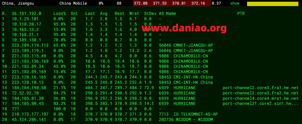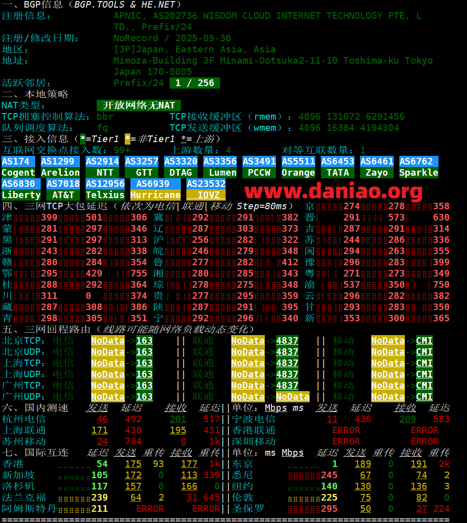 北京移动 NextTrace v1.4.2 2025-07-26T12:51:39Z cefed2a [NextTrace API] preferred API IP - 104.26.13.151 - 136.01ms - Misaka.LAX IP Geo Data Provider: LeoMoeAPI traceroute to 221.179.155.161, 30 hops max, 52 bytes payload, ICMP mode 1 45.124.206.1 AS202736 中国 中国台湾 台北市 0.61 ms / 0.42 ms / 0.30 ms 2 * 3 184.104.199.10 AS6939 [HURRICANE-11] 日本 东京都 东京 he.net port-channel1.core3.tyo1.he.net 51.32 ms / 51.74 ms / * ms 4 * 5 223.121.6.45 AS58453 [CMI-INT] 美国 加利福尼亚 洛杉矶 cmi.chinamobile.com 82.01 ms / 82.15 ms / 82.34 ms 6 223.120.6.53 AS58453 [CMI-INT] 美国 华盛顿州 西雅图 cmi.chinamobile.com 移动 108.01 ms / 107.96 ms / 107.98 ms 7 223.120.12.34 AS58453 [CMI-INT] 中国 北京 cmi.chinamobile.com 移动 291.99 ms / 292.16 ms / 291.73 ms 8 221.183.55.110 AS9808 [CMNET] 中国 北京 X-I chinamobileltd.com 移动 316.65 ms / 316.76 ms / 316.63 ms 9 221.183.25.201 AS9808 [CMNET] 中国 北京 I-C chinamobileltd.com 移动 * ms / 301.57 ms / 301.48 ms 10 * 11 221.183.46.178 AS9808 [CMNET] 中国 北京 chinamobileltd.com 移动 295.02 ms / 294.80 ms / 294.99 ms 12 221.183.130.142 AS9808 [CMNET] 中国 北京 chinamobileltd.com 移动 * ms / * ms / 461.04 ms 13 221.179.155.161 AS56048 [CMNET] 中国 北京 bj.10086.cn 移动 cachedns03.bj.chinamobile.com 294.11 ms / 294.13 ms / 294.17 ms ---------------------------------------------------------------------- 上海移动 NextTrace v1.4.2 2025-07-26T12:51:39Z cefed2a [NextTrace API] preferred API IP - 172.67.69.163 - 140.09ms - Misaka.LAX IP Geo Data Provider: LeoMoeAPI traceroute to 211.136.112.200, 30 hops max, 52 bytes payload, ICMP mode 1 45.124.206.1 AS202736 中国 中国台湾 台北市 Global Network Agency Inc. 0.49 ms / 0.45 ms / 0.44 ms 2 210.173.176.106 AS6939 [JPNIC-NET] 日本 东京都 东京 JPNAP Tokyo - Hurricane Electric - 100Gbps he.net gigabitethernet2-8.core1.tyo1.he.net 51.40 ms / * ms / * ms 3 210.171.224.198 AS7527 [JPNIC-NET] 日本 东京都 东京 jpix.ad.jp 0.87 ms / 0.65 ms / 1.15 ms 4 223.120.3.246 AS58453 [CMI-INT] 中国 上海 CMI-CM-Peer cmi.chinamobile.com 移动 163.40 ms / 162.85 ms / * ms 5 221.183.89.174 AS9808 [CMNET] 中国 上海 X-I chinamobileltd.com 移动 209.09 ms / 208.98 ms / 209.13 ms 6 221.183.89.69 AS9808 [CMNET] 中国 上海 I-C chinamobileltd.com 移动 291.60 ms / 291.50 ms / * ms 7 221.183.89.46 AS9808 [CMNET] 中国 上海 chinamobileltd.com 移动 235.21 ms / 235.53 ms / 235.18 ms 8 221.183.144.82 AS9808 [CMNET] 中国 上海 chinamobileltd.com 239.76 ms / * ms / * ms 9 * 10 211.136.112.252 AS24400 [CMNET] 中国 上海 sh.10086.cn 移动 237.75 ms / 237.82 ms / 237.74 ms 11 211.136.112.200 AS24400 [CMNET] 中国 上海 浦东新区 sh.10086.cn 移动 237.98 ms / 237.33 ms / 237.10 ms ---------------------------------------------------------------------- 深圳移动 NextTrace v1.4.2 2025-07-26T12:51:39Z cefed2a [NextTrace API] preferred API IP - 104.26.12.151 - 143.14ms - Misaka.LAX IP Geo Data Provider: LeoMoeAPI traceroute to 120.196.165.24, 30 hops max, 52 bytes payload, ICMP mode 1 45.124.206.1 AS202736 中国 中国台湾 台北市 Global Network Agency Inc. 0.58 ms / 0.45 ms / 0.56 ms 2 * 3 210.171.224.198 AS7527 [JPNIC-NET] 日本 东京都 东京 jpix.ad.jp 1.04 ms / 1.05 ms / 0.70 ms 4 223.118.2.238 AS58453 [CMI-INT] 日本 东京都 东京 cmi.chinamobile.com 移动 0.81 ms / 1.07 ms / 0.78 ms 5 223.120.2.26 AS58453 [CMI-INT] 中国 香港 cmi.chinamobile.com 234.91 ms / 233.11 ms / 232.87 ms 6 221.183.55.82 AS9808 [CMNET] 中国 广东 广州 chinamobileltd.com 移动 166.45 ms / 167.30 ms / 166.53 ms 7 221.183.92.21 AS9808 [CMNET] 中国 广东 广州 I-C chinamobileltd.com 移动 237.37 ms / 237.35 ms / 238.96 ms 8 * 9 221.183.71.82 AS9808 [CMNET] 中国 广东 广州 chinamobileltd.com 移动 240.11 ms / 240.12 ms / 240.11 ms 10 221.183.110.170 AS9808 [CMNET] 中国 广东 广州 chinamobileltd.com 移动 246.13 ms / 246.16 ms / 246.34 ms 11 120.196.165.24 AS56040 [APNIC-AP] 中国 广东 深圳 gd.10086.cn 移动 248.79 ms / 248.81 ms / 248.64 ms