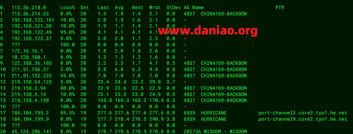 北京联通 NextTrace v1.4.2 2025-07-26T12:51:39Z cefed2a [NextTrace API] preferred API IP - 104.26.13.151 - 144.02ms - Misaka.LAX IP Geo Data Provider: LeoMoeAPI traceroute to 202.106.50.1, 30 hops max, 52 bytes payload, ICMP mode 1 45.124.206.1 AS202736 中国 中国台湾 台北市 Global Network Agency Inc. 0.29 ms / 0.56 ms / 0.36 ms 2 * 3 * 4 184.104.195.1 AS6939 [HURRICANE-11] 美国 加利福尼亚 洛杉矶 he.net port-channel20.core4.lax2.he.net 158.37 ms / 158.94 ms / * ms 5 72.52.93.38 AS6939 美国 加利福尼亚 洛杉矶 HE-CU-POP-100GE he.net china169-backbone-as4837.e0-72.core4.lax2.he.net 109.56 ms / 108.45 ms / 109.67 ms 6 219.158.96.29 AS4837 [CU169-BACKBONE] 中国 广东 广州 chinaunicom.cn 联通 265.64 ms / 265.69 ms / 265.49 ms 7 219.158.103.25 AS4837 [CU169-BACKBONE] 中国 广东 广州 chinaunicom.cn 联通 266.69 ms / 266.53 ms / 266.56 ms 8 * 9 219.158.112.25 AS4837 [CU169-BACKBONE] 中国 北京 chinaunicom.cn 联通 421.38 ms / * ms / * ms 10 * 11 202.106.50.1 AS4808 [UNICOM-BJ] 中国 北京 丰台区 中国联通 联通 306.98 ms / 307.09 ms / 307.09 ms ---------------------------------------------------------------------- 上海联通 NextTrace v1.4.2 2025-07-26T12:51:39Z cefed2a [NextTrace API] preferred API IP - 104.26.13.151 - 137.84ms - Misaka.LAX IP Geo Data Provider: LeoMoeAPI traceroute to 210.22.97.1, 30 hops max, 52 bytes payload, ICMP mode 1 45.124.206.1 AS202736 中国 中国台湾 台北市 Global Network Agency Inc. 0.49 ms / 0.59 ms / 0.36 ms 2 210.173.176.106 AS6939 [JPNIC-NET] 日本 东京都 东京 JPNAP Tokyo - Hurricane Electric - 100Gbps he.net gigabitethernet2-8.core1.tyo1.he.net 51.28 ms / * ms / * ms 3 * 4 184.104.195.1 AS6939 [HURRICANE-11] 美国 加利福尼亚 洛杉矶 he.net port-channel20.core4.lax2.he.net 108.13 ms / 158.69 ms / * ms 5 72.52.93.38 AS6939 美国 加利福尼亚 洛杉矶 HE-CU-POP-100GE he.net china169-backbone-as4837.e0-72.core4.lax2.he.net 109.98 ms / 107.98 ms / 108.07 ms 6 219.158.97.205 AS4837 [CU169-BACKBONE] 中国 广东 广州 chinaunicom.cn 联通 269.75 ms / 269.48 ms / 269.70 ms 7 219.158.4.13 AS4837 [CU169-BACKBONE] 中国 广东 广州 chinaunicom.cn 联通 273.68 ms / 274.09 ms / 279.03 ms 8 * 9 * 10 * 11 112.64.250.202 AS17621 [APNIC-AP] 中国 上海 chinaunicom.cn 联通 297.77 ms / 298.06 ms / 297.86 ms 12 210.22.97.1 AS17621 [CNCNET-SH] 中国 上海 闵行区 chinaunicom.cn 联通 300.12 ms / 300.38 ms / 300.32 ms ---------------------------------------------------------------------- 深圳联通 NextTrace v1.4.2 2025-07-26T12:51:39Z cefed2a [NextTrace API] preferred API IP - 104.26.12.151 - 142.93ms - Misaka.LAX IP Geo Data Provider: LeoMoeAPI traceroute to 210.21.196.6, 30 hops max, 52 bytes payload, ICMP mode 1 45.124.206.1 AS202736 中国 中国台湾 台北市 Global Network Agency Inc. 0.28 ms / 0.46 ms / 0.36 ms 2 210.173.176.106 AS6939 [JPNIC-NET] 日本 东京都 东京 JPNAP Tokyo - Hurricane Electric - 100Gbps he.net gigabitethernet2-8.core1.tyo1.he.net 103.31 ms / * ms / * ms 3 184.104.199.10 AS6939 [HURRICANE-11] 日本 东京都 东京 he.net port-channel1.core3.tyo1.he.net 1.05 ms / 0.73 ms / * ms 4 184.104.195.1 AS6939 [HURRICANE-11] 美国 加利福尼亚 洛杉矶 he.net port-channel20.core4.lax2.he.net 215.96 ms / * ms / * ms 5 72.52.93.38 AS6939 美国 加利福尼亚 洛杉矶 HE-CU-POP-100GE he.net china169-backbone-as4837.e0-72.core4.lax2.he.net 108.34 ms / 108.94 ms / 108.54 ms 6 * 7 * 8 219.158.19.65 AS4837 [CU169-BACKBONE] 中国 广东 广州 chinaunicom.cn 联通 372.75 ms / * ms / * ms 9 157.18.0.242 AS17816 [UNICOM-GD] 中国 广东 广州 chinaunicom.cn 332.97 ms / 316.91 ms / * ms 10 120.80.147.254 AS17623 [APNIC-AP] 中国 广东 深圳 chinaunicom.cn 联通 284.10 ms / 267.65 ms / 267.00 ms 11 210.21.196.6 AS17623 中国 广东 深圳 宝安区 chinaunicom.cn 联通 269.50 ms / 269.56 ms / 269.47 ms