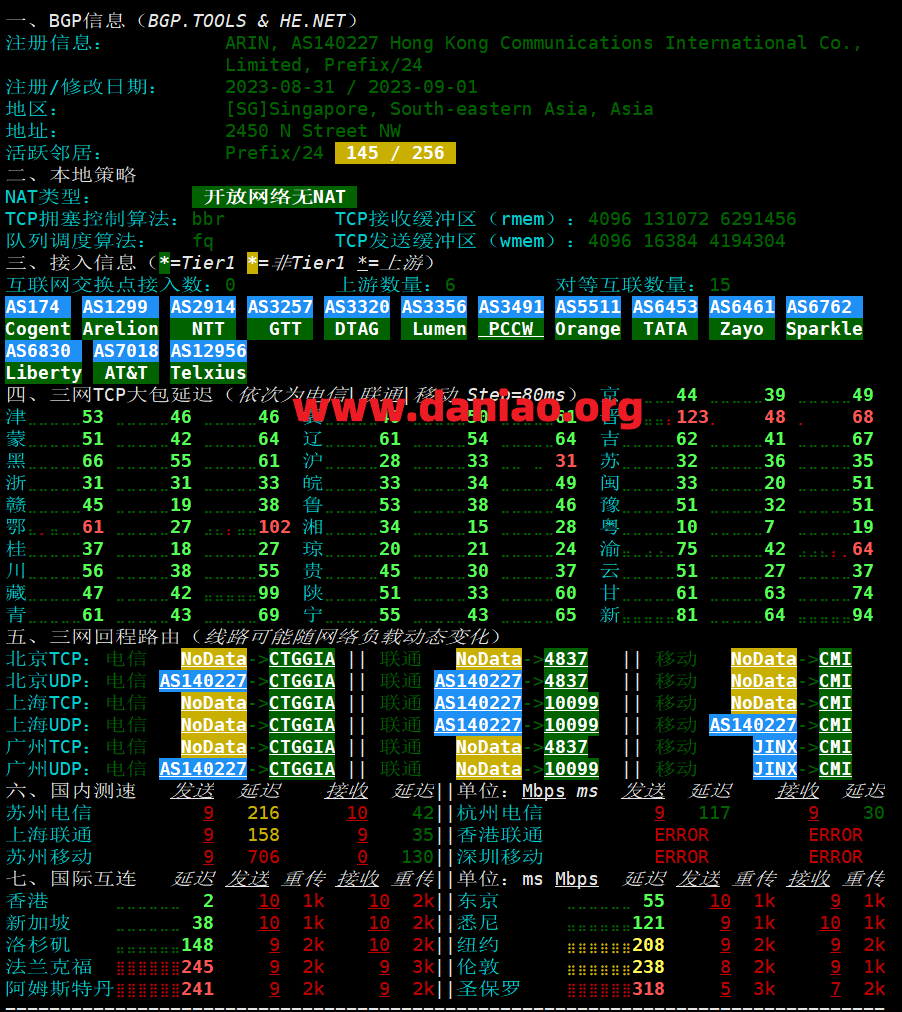 五、三网回程路由(线路可能随网络负载动态变化) 北京TCP:电信 NoData->CTGGIA || 联通 NoData->4837 || 移动 NoData->CMI 北京UDP:电信 AS140227->CTGGIA || 联通 AS140227->4837 || 移动 NoData->CMI 上海TCP:电信 NoData->CTGGIA || 联通 AS140227->10099 || 移动 NoData->CMI 上海UDP:电信 NoData->CTGGIA || 联通 AS140227->10099 || 移动 AS140227->CMI 广州TCP:电信 NoData->CTGGIA || 联通 NoData->4837 || 移动 JINX->CMI 广州UDP:电信 AS140227->CTGGIA || 联通 NoData->10099 || 移动 JINX->CMI