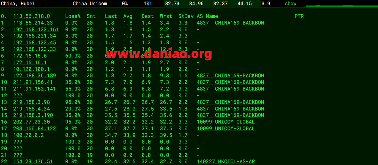 北京联通 NextTrace v1.4.2 2025-07-26T12:51:39Z cefed2a [NextTrace API] preferred API IP - 104.26.12.151 - 46.97ms - Misaka.HKG IP Geo Data Provider: LeoMoeAPI traceroute to 202.106.50.1, 30 hops max, 52 bytes payload, ICMP mode 1 154.23.176.254 AS140227 中国 香港 udc.hk 12.64 ms / 4.40 ms / 3.21 ms 2 * 3 10.1.210.5 * RFC1918 0.51 ms / 0.53 ms / 0.53 ms 4 10.0.161.1 * RFC1918 4.35 ms / 9.63 ms / 2.65 ms 5 61.14.203.85 * [CUG-ASIA] 中国 香港 1.36 ms / 1.35 ms / 1.27 ms 6 * 7 103.239.176.121 AS10099 中国 香港 chinaunicomglobal.com 5.17 ms / 5.15 ms / 5.18 ms 8 219.158.6.105 AS4837 [CU169-BACKBONE] 中国 广东 广州 chinaunicom.cn 4.91 ms / 4.94 ms / 5.49 ms 9 219.158.3.185 AS4837 [CU169-BACKBONE] 中国 广东 广州 chinaunicom.cn 联通 5.29 ms / 5.04 ms / 5.01 ms 10 * 11 * 12 124.65.194.18 AS4808 [UNICOM-BJ] 中国 北京 中国联通 联通 37.81 ms / * ms / * ms 13 202.106.50.1 AS4808 [UNICOM-BJ] 中国 北京 丰台区 中国联通 联通 36.40 ms / 36.40 ms / 36.42 ms ---------------------------------------------------------------------- 上海联通 NextTrace v1.4.2 2025-07-26T12:51:39Z cefed2a [NextTrace API] preferred API IP - 172.67.69.163 - 43.52ms - Misaka.HKG IP Geo Data Provider: LeoMoeAPI traceroute to 210.22.97.1, 30 hops max, 52 bytes payload, ICMP mode 1 * 2 10.2.131.1 * RFC1918 4.62 ms / 1.98 ms / 2.41 ms 3 10.1.210.5 * RFC1918 0.47 ms / 0.48 ms / 0.58 ms 4 10.0.161.1 * RFC1918 2.79 ms / 3.04 ms / 2.13 ms 5 61.14.203.85 * [CUG-ASIA] 中国 香港 1.31 ms / 1.35 ms / 1.29 ms 6 * 7 202.77.23.29 AS10099 [CUG-BACKBONE] 中国 香港 chinaunicomglobal.com 联通 1.52 ms / 1.69 ms / 1.83 ms 8 * 9 219.158.4.129 AS4837 [CU169-BACKBONE] 中国 广东 广州 chinaunicom.cn 联通 106.43 ms / * ms / * ms 10 219.158.3.125 AS4837 [CU169-BACKBONE] 中国 广东 广州 I-C chinaunicom.cn 联通 56.95 ms / 57.34 ms / * ms 11 * 12 * 13 112.64.250.202 AS17621 [APNIC-AP] 中国 上海 chinaunicom.cn 联通 34.69 ms / 34.62 ms / 48.17 ms 14 210.22.97.1 AS17621 [CNCNET-SH] 中国 上海 闵行区 chinaunicom.cn 联通 34.51 ms / 34.47 ms / 34.51 ms ---------------------------------------------------------------------- 深圳联通 NextTrace v1.4.2 2025-07-26T12:51:39Z cefed2a [NextTrace API] preferred API IP - 104.26.13.151 - 53.04ms - Misaka.HKG IP Geo Data Provider: LeoMoeAPI traceroute to 210.21.196.6, 30 hops max, 52 bytes payload, ICMP mode 1 * 2 * 3 10.1.210.5 * RFC1918 0.50 ms / 0.56 ms / 0.43 ms 4 10.0.161.1 * RFC1918 2.96 ms / 2.81 ms / 2.99 ms 5 61.14.203.85 * [CUG-ASIA] 中国 香港 1.38 ms / 1.34 ms / 1.24 ms 6 * 7 103.239.176.121 AS10099 中国 香港 chinaunicomglobal.com 55.93 ms / 55.33 ms / * ms 8 219.158.20.97 AS4837 [CU169-BACKBONE] 中国 广东 广州 chinaunicom.cn 联通 5.67 ms / * ms / * ms 9 * 10 219.158.3.93 AS4837 [CU169-BACKBONE] 中国 广东 广州 chinaunicom.cn 联通 5.81 ms / * ms / * ms 11 * 12 120.80.144.34 AS17623 [APNIC-AP] 中国 广东 深圳 chinaunicom.cn 联通 17.92 ms / 19.42 ms / 19.92 ms 13 210.21.196.6 AS17623 中国 广东 深圳 宝安区 chinaunicom.cn 联通 dns2-ftcg.gdsz.cncnet.net 10.03 ms / 10.80 ms / 11.68 ms