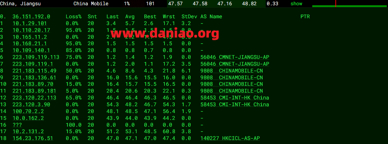 ---------------------------------------------------------------------- 北京移动 NextTrace v1.4.2 2025-07-26T12:51:39Z cefed2a [NextTrace API] preferred API IP - 104.26.12.151 - 46.89ms - Misaka.HKG IP Geo Data Provider: LeoMoeAPI traceroute to 221.179.155.161, 30 hops max, 52 bytes payload, ICMP mode 1 * 2 * 3 10.1.210.5 * RFC1918 0.59 ms / 0.47 ms / 0.40 ms 4 10.0.162.1 * RFC1918 8.89 ms / 3.27 ms / 7.17 ms 5 223.119.19.189 AS58453 [CMI-INT] 中国 香港 cmi.chinamobile.com 移动 5.44 ms / 1.83 ms / 9.80 ms 6 223.120.3.89 AS58453 [CMI-INT] 中国 香港 cmi.chinamobile.com 移动 104.04 ms / * ms / * ms 7 223.120.22.142 AS58453 [CMI-INT] 中国 香港 cmi.chinamobile.com 移动 38.31 ms / 38.61 ms / 38.43 ms 8 221.183.55.106 AS9808 [CMNET] 中国 北京 X-I chinamobileltd.com 移动 40.59 ms / 40.73 ms / 40.58 ms 9 221.183.46.250 AS9808 [CMNET] 中国 北京 I-C chinamobileltd.com 移动 45.41 ms / 48.53 ms / 45.06 ms 10 * 11 221.183.46.178 AS9808 [CMNET] 中国 北京 chinamobileltd.com 移动 45.51 ms / 45.37 ms / 45.37 ms 12 221.183.130.142 AS9808 [CMNET] 中国 北京 chinamobileltd.com 移动 48.47 ms / * ms / * ms 13 221.179.155.161 AS56048 [CMNET] 中国 北京 bj.10086.cn 移动 48.62 ms / 48.60 ms / 48.55 ms ---------------------------------------------------------------------- 上海移动 NextTrace v1.4.2 2025-07-26T12:51:39Z cefed2a [NextTrace API] preferred API IP - 104.26.13.151 - 43.22ms - Misaka.HKG IP Geo Data Provider: LeoMoeAPI traceroute to 211.136.112.200, 30 hops max, 52 bytes payload, ICMP mode 1 154.23.176.254 AS140227 中国 香港 udc.hk 29.83 ms / 130.84 ms / 80.41 ms 2 * 3 10.1.210.5 * RFC1918 0.58 ms / 0.48 ms / 0.48 ms 4 10.0.162.1 * RFC1918 2.92 ms / 3.32 ms / 3.90 ms 5 223.119.19.189 AS58453 [CMI-INT] 中国 香港 cmi.chinamobile.com 移动 1.86 ms / 2.43 ms / 4.08 ms 6 223.120.3.89 AS58453 [CMI-INT] 中国 香港 cmi.chinamobile.com 移动 107.72 ms / * ms / * ms 7 * 8 221.183.89.178 AS9808 [CMNET] 中国 上海 X-I chinamobileltd.com 移动 27.60 ms / 27.73 ms / 27.62 ms 9 221.183.89.33 AS9808 [CMNET] 中国 上海 I-C chinamobileltd.com 移动 28.24 ms / 27.93 ms / 27.91 ms 10 221.183.89.10 AS9808 [CMNET] 中国 上海 chinamobileltd.com 移动 79.74 ms / 80.10 ms / * ms 11 * 12 * 13 211.136.112.252 AS24400 [CMNET] 中国 上海 sh.10086.cn 移动 31.41 ms / 31.30 ms / 31.27 ms 14 211.136.112.200 AS24400 [CMNET] 中国 上海 浦东新区 sh.10086.cn 移动 32.04 ms / 31.87 ms / 32.06 ms ---------------------------------------------------------------------- 深圳移动 NextTrace v1.4.2 2025-07-26T12:51:39Z cefed2a [NextTrace API] preferred API IP - 172.67.69.163 - 51.14ms - Misaka.HKG IP Geo Data Provider: LeoMoeAPI traceroute to 120.196.165.24, 30 hops max, 52 bytes payload, ICMP mode 1 * 2 * 3 10.1.210.5 * RFC1918 0.45 ms / 0.43 ms / 0.44 ms 4 103.55.5.54 AS140096 中国 香港 jinx.cloud 2.32 ms / 2.28 ms / 2.24 ms 5 * 6 * 7 * 8 223.119.6.218 AS58453 [CMI-INT] 中国 香港 cmi.chinamobile.com 移动 1.78 ms / 1.73 ms / 1.72 ms 9 * 10 * 11 223.120.2.78 AS58453 [CMI-INT] 中国 广东 广州 X-I cmi.chinamobile.com 移动 7.87 ms / 7.71 ms / 7.73 ms 12 221.183.55.82 AS9808 [CMNET] 中国 广东 广州 chinamobileltd.com 移动 9.00 ms / 9.05 ms / 8.94 ms 13 221.183.92.17 AS9808 [CMNET] 中国 广东 广州 I-C chinamobileltd.com 移动 9.00 ms / 9.01 ms / 9.07 ms 14 221.183.55.82 AS9808 [CMNET] 中国 广东 广州 chinamobileltd.com 移动 9.36 ms / 9.32 ms / 9.62 ms 15 221.183.92.17 AS9808 [CMNET] 中国 广东 广州 I-C chinamobileltd.com 移动 9.65 ms / 9.38 ms / 9.37 ms 16 * 17 221.183.71.78 AS9808 [CMNET] 中国 广东 广州 chinamobileltd.com 移动 13.42 ms / 17.57 ms / 11.29 ms 18 221.183.110.166 AS9808 [CMNET] 中国 广东 广州 chinamobileltd.com 移动 13.34 ms / * ms / * ms 19 120.196.165.24 AS56040 [APNIC-AP] 中国 广东 深圳 gd.10086.cn 移动 ns6.gd.cnmobile.net 11.75 ms / 11.90 ms / 11.79 ms ---------------------------------------------------------------------- 成都教育网 NextTrace v1.4.2 2025-07-26T12:51:39Z cefed2a [NextTrace API] preferred API IP - 104.26.12.151 - 47.46ms - Misaka.HKG IP Geo Data Provider: LeoMoeAPI traceroute to 202.112.14.151, 30 hops max, 52 bytes payload, ICMP mode 1 154.23.176.254 AS140227 中国 香港 udc.hk 15.69 ms / 3.37 ms / 4.90 ms 2 * 3 10.1.210.5 * RFC1918 0.44 ms / 0.45 ms / 0.49 ms 4 10.0.160.1 * RFC1918 3.04 ms / 3.67 ms / 2.99 ms 5 63.140.5.141 AS4809 中国 香港 www.chinatelecom.com.cn 电信 1.15 ms / 1.21 ms / 1.16 ms 6 69.194.165.37 * 中国 香港 电信/CTGNet CN.HKG.CTGNet 52.56 ms / * ms / * ms 7 69.194.169.194 * 中国 香港 CN.HKG.CTGNet 1.89 ms / 1.90 ms / 1.82 ms 8 * 9 59.43.180.241 * [CN2-BackBone] 中国 广东 广州 chinatelecom.cn 电信 108.16 ms / * ms / * ms 10 59.43.22.42 * [CN2-BackBone] 中国 广东 广州 chinatelecom.cn 电信 12.66 ms / 9.51 ms / 15.00 ms 11 * 12 * 13 * 14 * 15 101.4.115.122 AS4538 [BJR-CERNET] 中国 上海 edu.cn 62.36 ms / 112.57 ms / * ms 16 101.4.116.242 AS4538 [BJR-CERNET] 中国 四川 成都 edu.cn 教育网 61.60 ms / 64.64 ms / 60.94 ms 17 * 18 * 19 * 20 202.112.14.151 AS24355 [CERNET-CN] 中国 四川 成都 教育网 61.45 ms / 61.50 ms / 62.20 ms