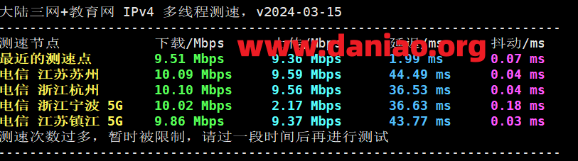 --------------------自动更新测速节点列表--本脚本原创-------------------- 位置 上传速度 下载速度 延迟 Speedtest.net 9.70Mbps 9.43Mbps 1.49ms 中国香港 9.59Mbps 9.31Mbps 2.20ms 新加坡 8.49Mbps 9.28Mbps 33.46ms 联通上海5G 8.80Mbps 9.32Mbps 77.32ms 电信浙江 8.94Mbps 9.42Mbps 32.63ms 移动Suzhou 9.37Mbps 5.85Mbps 113.58ms ------------------------------------------------------------------------