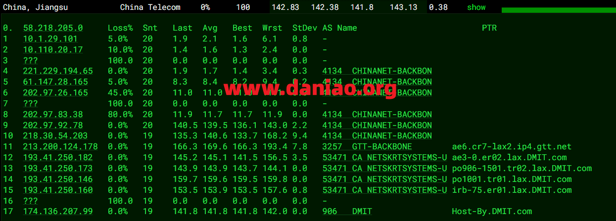 北京电信 NextTrace v1.4.2 2025-07-26T12:51:39Z cefed2a [NextTrace API] preferred API IP - [2606:4700:20::681a:c97] - 37.75ms - Misaka.LAX IP Geo Data Provider: LeoMoeAPI traceroute to 219.141.147.210, 30 hops max, 52 bytes payload, ICMP mode 1 193.41.250.250 AS906 [DMIT-BB] Anycast Anycast gateway DMIT.com Anycast.Gateway.DMIT.com 0.15 ms / 0.13 ms / 0.16 ms 2 193.41.250.160 AS906 [DMIT-BB] DMIT骨干网 DMIT.com irb-75.er01.lax.DMIT.com 0.61 ms / 0.38 ms / 0.48 ms 3 62.115.149.105 AS1299 [ARELION-NET] 美国 加利福尼亚 洛杉矶 arelion.com lax-b23-link.ip.twelve99.net 0.92 ms / 0.98 ms / 0.93 ms 4 62.115.140.228 AS1299 [ARELION-NET] 美国 加利福尼亚 洛杉矶 arelion.com lax-bb2-link.ip.twelve99.net 0.87 ms / 0.88 ms / 0.74 ms 5 62.115.140.157 AS1299 [ARELION-NET] 美国 加利福尼亚 洛杉矶 arelion.com 0.74 ms / * ms / * ms 6 62.115.185.213 AS1299 [ARELION-NET] 美国 加利福尼亚 洛杉矶 Telia-CT-Peer arelion.com chinatelecom-ic-368151.ip.twelve99-cust.net 1.91 ms / 3.00 ms / 1.19 ms 7 * 8 202.97.55.201 AS4134 [CHINANET-BB] 中国 北京 www.chinatelecom.com.cn 电信 156.16 ms / * ms / * ms 9 202.97.61.145 AS4134 [CHINANET-BB] 中国 北京 www.chinatelecom.com.cn 260.24 ms / * ms / * ms 10 * 11 106.120.254.2 AS4847 [CHINANET-GD] 中国 北京 chinatelecom.cn 158.25 ms / 158.65 ms / 280.87 ms 12 219.141.147.210 AS4847 [CHINATELECOM-BJ] 中国 北京 chinatelecom.cn 157.77 ms / 157.82 ms / 157.86 ms ---------------------------------------------------------------------- 上海电信 NextTrace v1.4.2 2025-07-26T12:51:39Z cefed2a [NextTrace API] preferred API IP - [2606:4700:20::ac43:45a3] - 33.07ms - Misaka.LAX IP Geo Data Provider: LeoMoeAPI traceroute to 202.96.209.133, 30 hops max, 52 bytes payload, ICMP mode 1 193.41.250.250 AS906 [DMIT-BB] Anycast Anycast gateway DMIT.com Anycast.Gateway.DMIT.com 0.26 ms / 0.15 ms / 0.12 ms 2 193.41.250.160 AS906 [DMIT-BB] DMIT骨干网 DMIT.com irb-75.er01.lax.DMIT.com 0.60 ms / 0.67 ms / 0.45 ms 3 62.115.149.105 AS1299 [ARELION-NET] 美国 加利福尼亚 洛杉矶 arelion.com 0.58 ms / 0.70 ms / 0.69 ms 4 62.115.137.62 AS1299 [ARELION-NET] 美国 加利福尼亚 洛杉矶 arelion.com lax-bb1-link.ip.twelve99.net 0.54 ms / 0.60 ms / 0.71 ms 5 62.115.139.151 AS1299 [ARELION-NET] 美国 纽约州 纽约 arelion.com sjo-bb1-link.ip.twelve99.net 11.87 ms / 11.75 ms / 12.29 ms 6 * 7 218.30.54.181 AS4134 [CHINANET-US] 美国 加利福尼亚 圣何塞 Cogent/Telia-CT-PoP www.chinatelecom.com.cn 电信 10.35 ms / 9.78 ms / 9.43 ms 8 202.97.92.73 AS4134 [CHINANET-BB] 中国 上海 www.chinatelecom.com.cn 131.18 ms / 131.26 ms / 131.24 ms 9 202.97.39.182 AS4134 [CHINANET-BB] 中国 上海 www.chinatelecom.com.cn 电信 134.35 ms / * ms / * ms 10 202.97.71.29 AS4134 [CHINANET-BB] 中国 上海 www.chinatelecom.com.cn 电信 182.63 ms / 182.60 ms / * ms 11 61.152.25.17 AS4812 [CHINANET-SH] 中国 上海 chinatelecom.cn 电信 132.39 ms / 132.23 ms / * ms 12 61.152.51.142 AS4812 [CHINANET-SH] 中国 上海 闵行 chinatelecom.cn 139.93 ms / 134.18 ms / 135.95 ms 13 202.96.209.133 AS4812 [CHINANET-SH] 中国 上海 chinatelecom.cn 电信 132.10 ms / 132.24 ms / 132.17 ms ---------------------------------------------------------------------- 深圳电信 NextTrace v1.4.2 2025-07-26T12:51:39Z cefed2a [NextTrace API] preferred API IP - [2606:4700:20::681a:d97] - 34.29ms - Misaka.LAX IP Geo Data Provider: LeoMoeAPI traceroute to 58.60.188.222, 30 hops max, 52 bytes payload, ICMP mode 1 193.41.250.250 AS906 [DMIT-BB] Anycast Anycast gateway DMIT.com Anycast.Gateway.DMIT.com 0.12 ms / 0.13 ms / 0.16 ms 2 193.41.250.160 AS906 [DMIT-BB] DMIT骨干网 DMIT.com irb-75.er01.lax.DMIT.com 0.42 ms / 0.48 ms / 0.31 ms 3 62.115.149.105 AS1299 [ARELION-NET] 美国 加利福尼亚 洛杉矶 arelion.com 0.59 ms / 0.72 ms / 0.81 ms 4 62.115.137.62 AS1299 [ARELION-NET] 美国 加利福尼亚 洛杉矶 arelion.com lax-bb1-link.ip.twelve99.net 0.61 ms / 0.58 ms / 0.56 ms 5 * 6 62.115.185.213 AS1299 [ARELION-NET] 美国 加利福尼亚 洛杉矶 Telia-CT-Peer arelion.com 1.73 ms / 1.66 ms / 1.81 ms 7 * 8 202.97.12.38 AS4134 [CHINANET-BB] 中国 广东 广州 www.chinatelecom.com.cn 电信 161.01 ms / 160.93 ms / * ms 9 * 10 14.147.127.86 AS134774 [CHINANET-GD] 中国 广东 深圳 chinatelecom.cn 电信 164.73 ms / 164.82 ms / 164.73 ms 11 * 12 * 13 * 14 * 15 * 16 * 17 * 18 * 19 * 20 * 21 * 22 * 23 * 24 * 25 * 26 * 27 * 28 * 29 *
