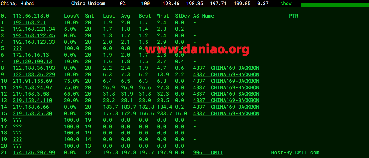 北京联通 NextTrace v1.4.2 2025-07-26T12:51:39Z cefed2a [NextTrace API] preferred API IP - 172.67.69.163 - 38.30ms - Misaka.LAX IP Geo Data Provider: LeoMoeAPI traceroute to 202.106.50.1, 30 hops max, 52 bytes payload, ICMP mode 1 193.41.250.250 AS906 [DMIT-BB] Anycast Anycast gateway DMIT.com Anycast.Gateway.DMIT.com 0.11 ms / 0.11 ms / 0.15 ms 2 193.41.250.160 AS906 [DMIT-BB] DMIT骨干网 DMIT.com irb-75.er01.lax.DMIT.com 0.36 ms / 18.17 ms / 0.56 ms 3 62.115.149.105 AS1299 [ARELION-NET] 美国 加利福尼亚 洛杉矶 arelion.com 0.59 ms / 0.63 ms / 0.87 ms 4 62.115.140.228 AS1299 [ARELION-NET] 美国 加利福尼亚 洛杉矶 arelion.com lax-bb2-link.ip.twelve99.net 0.63 ms / 0.66 ms / 0.69 ms 5 62.115.140.157 AS1299 [ARELION-NET] 美国 加利福尼亚 洛杉矶 arelion.com lax-b22-link.ip.twelve99.net 200.96 ms / 201.00 ms / * ms 6 62.115.121.221 AS1299 [ARELION-NET] 美国 弗吉尼亚 阿什本 arelion.com ash-bb2-link.ip.twelve99.net 61.00 ms / 60.86 ms / 61.16 ms 7 62.115.140.106 AS1299 [ARELION-NET] 法国 法兰西岛大区 巴黎 arelion.com prs-bb2-link.ip.twelve99.net 139.54 ms / 139.71 ms / 139.51 ms 8 62.115.122.139 AS1299 [ARELION-NET] 德国 黑森州 美因河畔法兰克福 arelion.com ffm-bb2-link.ip.twelve99.net 144.96 ms / 144.93 ms / 145.18 ms 9 62.115.124.119 AS1299 [ARELION-NET] 德国 黑森州 美因河畔法兰克福 arelion.com 144.95 ms / 144.84 ms / 144.82 ms 10 219.158.43.25 AS4837 [CU169-BACKBONE] 德国 黑森 美因河畔法兰克福 chinaunicom.cn 联通 233.28 ms / 233.25 ms / 236.93 ms 11 219.158.98.33 AS4837 [CU169-BACKBONE] 中国 广东 广州 chinaunicom.cn 联通 224.13 ms / 224.09 ms / 223.99 ms 12 * 13 219.158.97.1 AS4837 [CU169-BACKBONE] 中国 广东 广州 chinaunicom.cn 联通 228.99 ms / * ms / * ms 14 219.158.7.17 AS4837 [CU169-BACKBONE] 中国 北京 chinaunicom.cn 联通 249.83 ms / * ms / * ms 15 * 16 202.106.50.1 AS4808 [UNICOM-BJ] 中国 北京 丰台区 中国联通 联通 255.90 ms / 255.95 ms / 255.92 ms ---------------------------------------------------------------------- 上海联通 NextTrace v1.4.2 2025-07-26T12:51:39Z cefed2a [NextTrace API] preferred API IP - [2606:4700:20::ac43:45a3] - 32.08ms - Misaka.LAX IP Geo Data Provider: LeoMoeAPI traceroute to 210.22.97.1, 30 hops max, 52 bytes payload, ICMP mode 1 193.41.250.250 AS906 [DMIT-BB] Anycast Anycast gateway DMIT.com Anycast.Gateway.DMIT.com 0.10 ms / 0.13 ms / 0.16 ms 2 193.41.250.160 AS906 [DMIT-BB] DMIT骨干网 DMIT.com irb-75.er01.lax.DMIT.com 8.83 ms / 0.50 ms / 0.35 ms 3 62.115.149.105 AS1299 [ARELION-NET] 美国 加利福尼亚 洛杉矶 arelion.com 0.67 ms / 0.62 ms / 0.59 ms 4 62.115.137.62 AS1299 [ARELION-NET] 美国 加利福尼亚 洛杉矶 arelion.com lax-bb1-link.ip.twelve99.net 0.61 ms / 0.65 ms / 0.83 ms 5 * 6 80.239.134.247 AS1299 美国 加利福尼亚 洛杉矶 arelion.com 175.23 ms / 176.67 ms / 175.93 ms 7 219.158.6.81 AS4837 [CU169-BACKBONE] 中国 广东省 广州市 chinaunicom.cn 169.31 ms / 169.42 ms / 169.23 ms 8 * 9 * 10 * 11 * 12 112.64.250.202 AS17621 [APNIC-AP] 中国 上海 chinaunicom.cn 联通 169.95 ms / 179.59 ms / 169.48 ms 13 210.22.97.1 AS17621 [CNCNET-SH] 中国 上海 闵行区 chinaunicom.cn 联通 182.27 ms / 182.12 ms / 182.04 ms ---------------------------------------------------------------------- 深圳联通 NextTrace v1.4.2 2025-07-26T12:51:39Z cefed2a [NextTrace API] preferred API IP - 172.67.69.163 - 31.81ms - Misaka.LAX IP Geo Data Provider: LeoMoeAPI traceroute to 210.21.196.6, 30 hops max, 52 bytes payload, ICMP mode 1 193.41.250.250 AS906 [DMIT-BB] Anycast Anycast gateway DMIT.com Anycast.Gateway.DMIT.com 0.10 ms / 0.17 ms / 0.14 ms 2 193.41.250.160 AS906 [DMIT-BB] DMIT骨干网 DMIT.com irb-75.er01.lax.DMIT.com 0.44 ms / 0.39 ms / 0.38 ms 3 62.115.149.105 AS1299 [ARELION-NET] 美国 加利福尼亚 洛杉矶 arelion.com 0.57 ms / 0.75 ms / 0.62 ms 4 62.115.137.62 AS1299 [ARELION-NET] 美国 加利福尼亚 洛杉矶 arelion.com lax-bb1-link.ip.twelve99.net 0.63 ms / 0.58 ms / 0.77 ms 5 * 6 80.239.134.247 AS1299 美国 加利福尼亚 洛杉矶 arelion.com 176.94 ms / 175.15 ms / 176.24 ms 7 219.158.16.93 AS4837 [CU169-BACKBONE] 中国 北京 chinaunicom.cn 联通 212.75 ms / 212.56 ms / * ms 8 219.158.9.185 AS4837 [CU169-BACKBONE] 中国 北京 chinaunicom.cn 270.82 ms / * ms / * ms 9 219.158.8.69 AS4837 [CU169-BACKBONE] 中国 北京 chinaunicom.cn 221.29 ms / * ms / * ms 10 * 11 221.4.0.126 AS17816 [UNICOM-GD] 中国 广东 深圳 chinaunicom.cn 联通 272.19 ms / * ms / * ms 12 120.80.144.38 AS17623 [APNIC-AP] 中国 广东 深圳 chinaunicom.cn 联通 167.87 ms / 168.79 ms / 167.94 ms 13 210.21.196.6 AS17623 中国 广东 深圳 宝安区 chinaunicom.cn 联通 175.05 ms / 175.00 ms / 175.09 ms