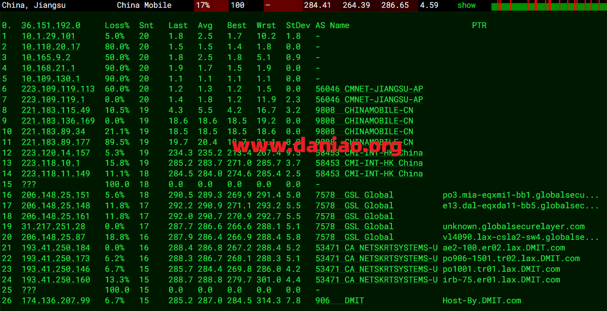 北京移动 NextTrace v1.4.2 2025-07-26T12:51:39Z cefed2a [NextTrace API] preferred API IP - 104.26.12.151 - 37.64ms - Misaka.LAX IP Geo Data Provider: LeoMoeAPI traceroute to 221.179.155.161, 30 hops max, 52 bytes payload, ICMP mode 1 193.41.250.250 AS906 [DMIT-BB] Anycast Anycast gateway DMIT.com Anycast.Gateway.DMIT.com 0.12 ms / 0.17 ms / 0.18 ms 2 193.41.250.160 AS906 [DMIT-BB] DMIT骨干网 DMIT.com irb-75.er01.lax.DMIT.com 0.60 ms / 0.57 ms / 0.60 ms 3 193.41.250.193 AS906 [DMIT-BB] 美国 加利福尼亚 洛杉矶 DMIT.com po906-1501.tr01.lax.DMIT.com 0.56 ms / 0.53 ms / 0.58 ms 4 193.41.250.147 AS906 [DMIT-BB] 美国 加利福尼亚 洛杉矶 DMIT.com po1001.tr02.lax.DMIT.com 0.58 ms / 0.72 ms / 0.64 ms 5 193.41.250.184 AS906 [DMIT-BB] 美国 加利福尼亚 洛杉矶 DMIT.com ae2-100.er02.lax.DMIT.com 12.74 ms / 0.52 ms / 0.52 ms 6 103.137.13.130 AS7578 [STREAMLINESERVERS-AU] 美国 加利福尼亚 洛杉矶 globalsecurelayer.com 0.52 ms / 0.51 ms / 0.58 ms 7 206.148.25.154 AS7578 美国 加利福尼亚 洛杉矶 globalsecurelayer.com po3.lax-csla2-cr3.globalsecurelayer.com 0.52 ms / 0.45 ms / 0.49 ms 8 64.124.129.52 AS6461 美国 加利福尼亚 洛杉矶 zayo.com 0.61 ms / 0.64 ms / 0.74 ms 9 208.184.12.95 AS6461 [ABOVENET-6] 美国 加利福尼亚 洛杉矶 zayo.com 54.29 ms / 54.26 ms / 54.42 ms 10 223.118.10.249 AS58453 [CMI-INT] 美国 加利福尼亚 洛杉矶 cmi.chinamobile.com 移动 54.66 ms / 54.50 ms / 54.39 ms 11 223.120.13.50 AS58453 [CMI-INT] 美国 加利福尼亚 旧金山 cmi.chinamobile.com 移动 230.80 ms / 230.90 ms / 230.83 ms 12 221.183.55.102 AS9808 [CMNET] 中国 北京 X-I chinamobileltd.com 移动 230.29 ms / 230.30 ms / 230.28 ms 13 221.183.46.250 AS9808 [CMNET] 中国 北京 I-C chinamobileltd.com 移动 238.31 ms / 238.27 ms / 238.26 ms 14 * 15 221.183.46.174 AS9808 [CMNET] 中国 北京 chinamobileltd.com 移动 240.26 ms / 240.12 ms / 240.19 ms 16 221.183.130.134 AS9808 [CMNET] 中国 北京 chinamobileltd.com 移动 292.60 ms / * ms / * ms 17 221.179.155.161 AS56048 [CMNET] 中国 北京 bj.10086.cn 移动 242.00 ms / 242.02 ms / 241.99 ms ---------------------------------------------------------------------- 上海移动 NextTrace v1.4.2 2025-07-26T12:51:39Z cefed2a [NextTrace API] preferred API IP - [2606:4700:20::681a:c97] - 28.70ms - Misaka.LAX IP Geo Data Provider: LeoMoeAPI traceroute to 211.136.112.200, 30 hops max, 52 bytes payload, ICMP mode 1 193.41.250.250 AS906 [DMIT-BB] Anycast Anycast gateway DMIT.com 0.12 ms / 0.14 ms / 0.14 ms 2 193.41.250.160 AS906 [DMIT-BB] DMIT骨干网 DMIT.com irb-75.er01.lax.DMIT.com 0.57 ms / 0.45 ms / 0.63 ms 3 62.115.149.105 AS1299 [ARELION-NET] 美国 加利福尼亚 洛杉矶 arelion.com 0.60 ms / 0.76 ms / 0.67 ms 4 62.115.171.217 AS1299 [ARELION-NET] 美国 加利福尼亚 洛杉矶 arelion.com 54.48 ms / 54.12 ms / 54.19 ms 5 223.120.6.217 AS58453 [CMI-INT] 美国 加利福尼亚 洛杉矶 cmi.chinamobile.com 移动 54.23 ms / 54.14 ms / 54.44 ms 6 * 7 221.183.89.178 AS9808 [CMNET] 中国 上海 X-I chinamobileltd.com 移动 321.29 ms / 321.37 ms / * ms 8 221.183.89.33 AS9808 [CMNET] 中国 上海 I-C chinamobileltd.com 移动 270.70 ms / 270.94 ms / 270.83 ms 9 221.183.89.14 AS9808 [CMNET] 中国 上海 chinamobileltd.com 移动 272.29 ms / 272.72 ms / 273.31 ms 10 * 11 * 12 211.136.112.252 AS24400 [CMNET] 中国 上海 sh.10086.cn 移动 273.76 ms / 273.51 ms / * ms 13 211.136.112.200 AS24400 [CMNET] 中国 上海 浦东新区 sh.10086.cn 移动 274.64 ms / 274.21 ms / 274.41 ms ---------------------------------------------------------------------- 深圳移动 NextTrace v1.4.2 2025-07-26T12:51:39Z cefed2a [NextTrace API] preferred API IP - [2606:4700:20::ac43:45a3] - 33.43ms - Misaka.LAX IP Geo Data Provider: LeoMoeAPI traceroute to 120.196.165.24, 30 hops max, 52 bytes payload, ICMP mode 1 193.41.250.250 AS906 [DMIT-BB] Anycast Anycast gateway DMIT.com Anycast.Gateway.DMIT.com 0.12 ms / 0.21 ms / 0.19 ms 2 193.41.250.160 AS906 [DMIT-BB] DMIT骨干网 DMIT.com irb-75.er01.lax.DMIT.com 0.36 ms / 0.36 ms / 0.60 ms 3 62.115.149.105 AS1299 [ARELION-NET] 美国 加利福尼亚 洛杉矶 arelion.com 0.67 ms / 0.59 ms / 0.84 ms 4 62.115.171.217 AS1299 [ARELION-NET] 美国 加利福尼亚 洛杉矶 arelion.com 54.15 ms / 54.23 ms / 54.15 ms 5 223.120.6.217 AS58453 [CMI-INT] 美国 加利福尼亚 洛杉矶 cmi.chinamobile.com 移动 54.15 ms / 54.17 ms / 54.59 ms 6 223.120.12.42 AS58453 [CMI-INT] 中国 广东 广州 cmi.chinamobile.com 移动 218.36 ms / 230.03 ms / 218.78 ms 7 221.183.55.58 AS9808 [CMNET] 中国 广东 广州 X-I chinamobileltd.com 移动 218.05 ms / 218.24 ms / 217.98 ms 8 221.183.92.21 AS9808 [CMNET] 中国 广东 广州 I-C chinamobileltd.com 移动 217.99 ms / 218.10 ms / 218.05 ms 9 221.183.89.242 AS9808 [CMNET] 中国 广东 广州 chinamobileltd.com 移动 216.29 ms / * ms / * ms 10 221.183.71.78 AS9808 [CMNET] 中国 广东 广州 chinamobileltd.com 移动 220.01 ms / 220.23 ms / 222.52 ms 11 221.183.110.166 AS9808 [CMNET] 中国 广东 广州 chinamobileltd.com 移动 219.13 ms / 219.23 ms / 219.12 ms 12 120.196.165.24 AS56040 [APNIC-AP] 中国 广东 深圳 gd.10086.cn 移动 ns6.gd.cnmobile.net 218.32 ms / 218.33 ms / 218.40 ms ----------------------------------------------------------------------