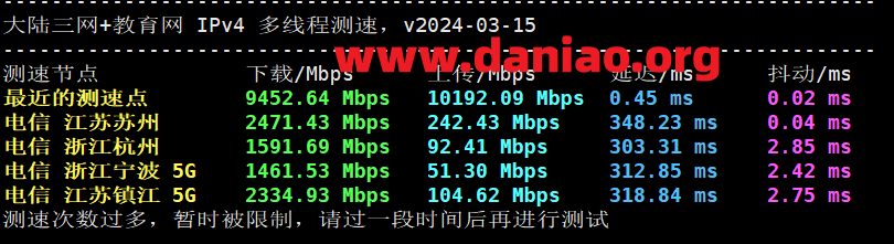 --------------------自动更新测速节点列表-------------------- 位置 上传速度 下载速度 延迟 Speedtest.net 2304.29Mbps 6448.07Mbps 756.08ms 中国香港 1871.04Mbps 4056.77Mbps 2.12ms 新加坡 195.42Mbps 273.78Mbps 38.24ms 联通上海5G 47.43Mbps 132.60Mbps 110.04ms 电信浙江 5.47Mbps 16.71Mbps 339.80ms 移动Suzhou 24.66Mbps 0.12Mbps 144.27ms