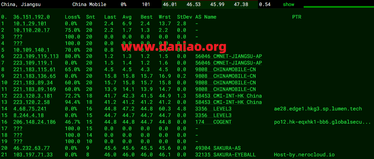 移动去程:移动cmi绕日本接驳lunmen后直连香港~