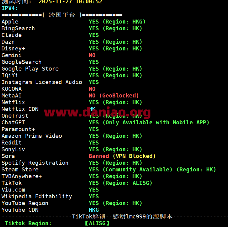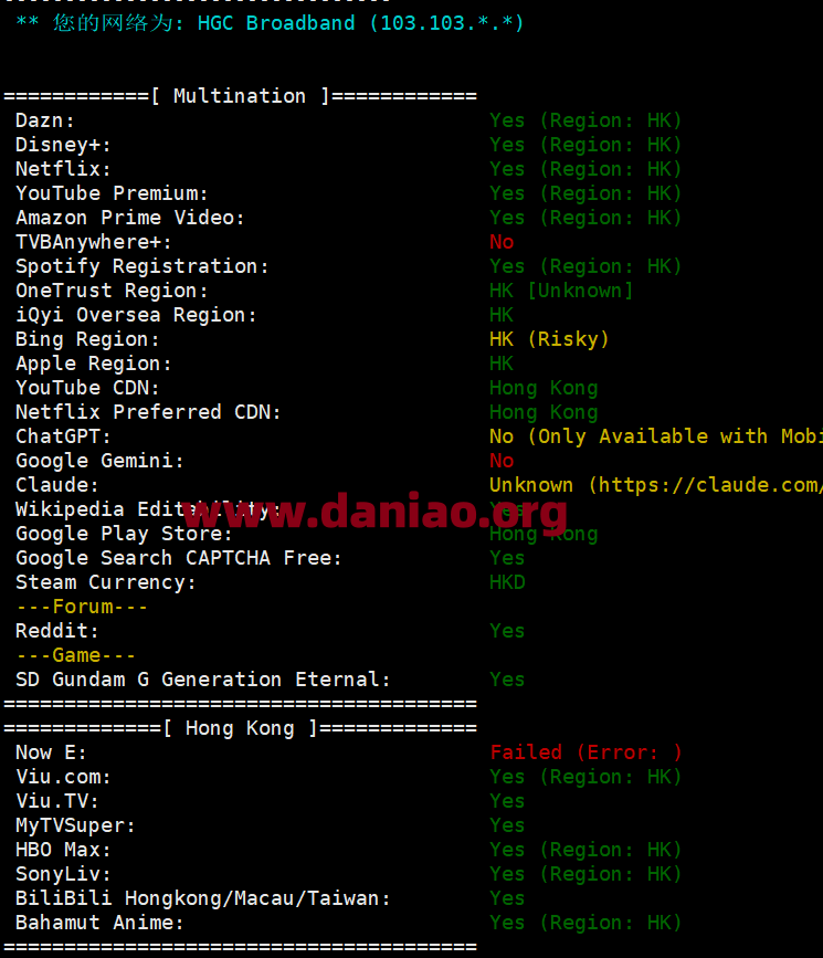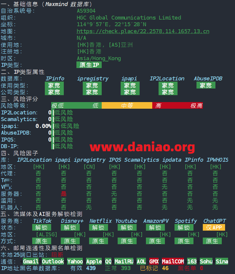 上游运营商为香港HGC(和记环球电讯),IP原生IP,解锁能力优秀,该解锁的都解锁了,tiktok、chatgpt这些不支持香港地区的这就没什么办法了。
