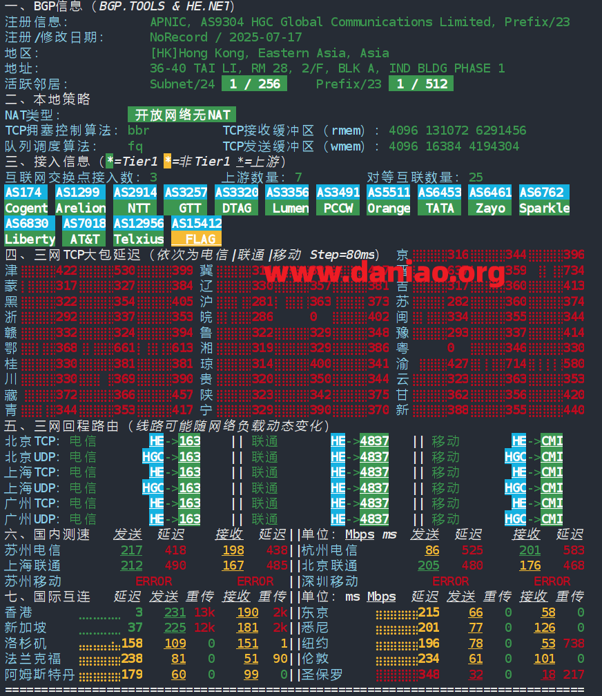五、三网回程路由(线路可能随网络负载动态变化) 北京TCP:电信 HE->163 || 联通 HE->4837 || 移动 HE->CMI 北京UDP:电信 HGC->163 || 联通 HE->4837 || 移动 HGC->CMI 上海TCP:电信 HE->163 || 联通 HE->4837 || 移动 HE->CMI 上海UDP:电信 HGC->163 || 联通 HE->4837 || 移动 HGC->CMI 广州TCP:电信 HE->163 || 联通 HE->4837 || 移动 HE->CMI 广州UDP:电信 HE->163 || 联通 HE->4837 || 移动 HGC->CMI