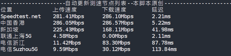 iperf3 Network Speed Tests (IPv4): --------------------------------- Provider | Location (Link) | Send Speed | Recv Speed | Ping ----- | ----- | ---- | ---- | ---- Clouvider | London, UK (10G) | busy | 38.4 Mbits/sec | 216 ms Eranium | Amsterdam, NL (100G) | 225 Mbits/sec | 29.2 Mbits/sec | 251 ms Uztelecom | Tashkent, UZ (10G) | 262 Mbits/sec | 153 Mbits/sec | 123 ms Leaseweb | Singapore, SG (10G) | 277 Mbits/sec | 94.1 Mbits/sec | 42.4 ms Clouvider | Los Angeles, CA, US (10G) | 211 Mbits/sec | 36.9 Mbits/sec | 164 ms Leaseweb | NYC, NY, US (10G) | 240 Mbits/sec | 40.6 Mbits/sec | 205 ms Edgoo | Sao Paulo, BR (1G) | busy | 25.5 Mbits/sec | 320 ms