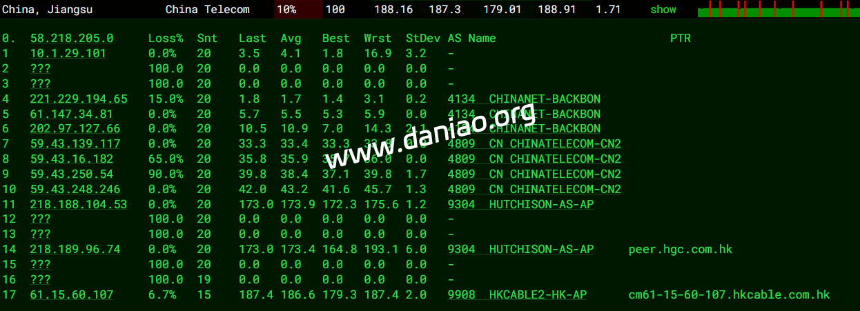 北京电信 NextTrace v1.5.0 2025-11-28T02:24:32Z 82cebb7 [NextTrace API] preferred API IP - 104.26.12.151 - 51.33ms - Misaka.HKG IP Geo Data Provider: LeoMoeAPI traceroute to 219.141.147.210, 30 hops max, 52 bytes payload, ICMP mode 1 * 2 * 3 192.168.64.64 * RFC1918 1.71 ms / 1.64 ms / 1.85 ms 4 192.168.64.30 * RFC1918 2.90 ms / 2.60 ms / 2.68 ms 5 154.18.9.105 AS174 [COGENT-BONE] 中国 香港 cogentco.com 3.66 ms / 3.63 ms / 3.95 ms 6 154.54.0.5 AS174 [COGENT-BONE] 美国 加利福尼亚 洛杉矶 cogentco.com be2327.ccr41.lax01.atlas.cogentco.com 151.50 ms / 151.19 ms / 151.03 ms 7 154.54.40.157 AS174 [COGENT-BONE] 美国 加利福尼亚 圣何塞 cogentco.com 164.56 ms / 163.19 ms / 163.73 ms 8 154.54.169.38 AS174 [COGENT-BONE] 美国 加利福尼亚 圣何塞 cogentco.com 156.69 ms / 156.09 ms / 155.92 ms 9 38.104.138.106 AS174 美国 加利福尼亚 圣克拉拉 cogentco.com 256.47 ms / 218.47 ms / 178.75 ms 10 * 11 202.97.12.53 AS4134 [CHINANET-BB] 中国 北京 chinatelecom.com.cn 电信 195.35 ms / 200.68 ms / 195.38 ms 12 202.97.34.73 AS4134 [CHINANET-BB] 中国 北京 chinatelecom.com.cn 电信 197.32 ms / * ms / * ms 13 * 14 106.120.254.2 AS4847 [CHINANET-GD] 中国 北京 bj.189.cn 199.41 ms / 199.37 ms / * ms 15 219.141.147.210 AS4847 [CHINATELECOM-BJ] 中国 北京 bj.189.cn 199.76 ms / 200.11 ms / 199.98 ms ---------------------------------------------------------------------- 上海电信 NextTrace v1.5.0 2025-11-28T02:24:32Z 82cebb7 [NextTrace API] preferred API IP - 172.67.69.163 - 51.21ms - Misaka.HKG IP Geo Data Provider: LeoMoeAPI traceroute to 202.96.209.133, 30 hops max, 52 bytes payload, ICMP mode 1 * 2 * 3 192.168.64.64 * RFC1918 1.59 ms / 1.67 ms / 20.53 ms 4 192.168.64.34 * RFC1918 2.77 ms / 2.53 ms / 2.77 ms 5 218.213.65.69 AS9293 中国 香港 hello.global.ntt 3.45 ms / 3.29 ms / 3.35 ms 6 121.59.101.29 * [CN2-BB] 中国 香港 3.88 ms / 3.87 ms / 3.91 ms 7 * 8 69.194.166.117 * 中国 香港 电信/CTGNet 4.73 ms / 4.64 ms / * ms 9 * 10 59.43.245.69 * [CN2-BackBone] 中国 上海 CN2→163 chinatelecom.cn 电信 36.61 ms / 28.91 ms / * ms 11 202.97.90.30 AS4134 [CHINANET-BB] 中国 上海 I-C chinatelecom.com.cn 电信 29.39 ms / 29.61 ms / * ms 12 202.97.50.141 AS4134 [CHINANET-BB] 中国 上海 chinatelecom.com.cn 电信 45.41 ms / 45.11 ms / 42.21 ms 13 * 14 180.169.255.122 AS4812 [CHINANET-SH] 中国 上海 chinatelecom.cn 电信 104.31 ms / 54.44 ms / * ms 15 202.96.209.133 AS4812 [CHINANET-SH] 中国 上海 chinatelecom.cn 电信 41.10 ms / 41.26 ms / 41.16 ms ---------------------------------------------------------------------- 深圳电信 NextTrace v1.5.0 2025-11-28T02:24:32Z 82cebb7 [NextTrace API] preferred API IP - 104.26.13.151 - 47.14ms - Misaka.HKG IP Geo Data Provider: LeoMoeAPI traceroute to 58.60.188.222, 30 hops max, 52 bytes payload, ICMP mode 1 * 2 10.254.8.2 * RFC1918 1.53 ms / * ms / * ms 3 192.168.64.64 * RFC1918 1.76 ms / 1.68 ms / 1.56 ms 4 192.168.64.34 * RFC1918 2.69 ms / 2.49 ms / 2.56 ms 5 218.213.65.69 AS9293 中国 香港 hello.global.ntt 4.06 ms / 3.51 ms / 3.18 ms 6 219.158.38.201 AS4837 [CU169-BACKBONE] 中国 香港 chinaunicom.cn 257.69 ms / 257.08 ms / * ms 7 * 8 219.158.103.37 AS4837 [CU169-BACKBONE] 中国 广东 广州 chinaunicom.cn 联通 265.27 ms / * ms / * ms 9 * 10 * 11 * 12 * 13 * 14 * 15 * 16 * 17 * 18 * 19 * 20 * 21 * 22 * 23 * 24 * 25 * 26 * 27 * 28 * 29 *