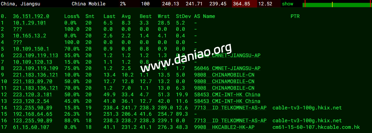 北京移动 NextTrace v1.5.0 2025-11-28T02:24:32Z 82cebb7 [NextTrace API] preferred API IP - 172.67.69.163 - 44.11ms - Misaka.HKG IP Geo Data Provider: LeoMoeAPI traceroute to 221.179.155.161, 30 hops max, 52 bytes payload, ICMP mode 1 * 2 10.254.8.2 * RFC1918 1.55 ms / * ms / * ms 3 192.168.64.64 * RFC1918 1.52 ms / 1.49 ms / 1.50 ms 4 192.168.64.34 * RFC1918 2.40 ms / 2.08 ms / 2.12 ms 5 180.87.160.194 AS6453 [TATA-COMMUNICATIONS] 中国 香港 tatacommunications.com 2.30 ms / 2.04 ms / 2.09 ms 6 180.87.162.194 AS6453 [TATA-COMMUNICATIONS] 中国 香港 tatacommunications.com 2.77 ms / 3.28 ms / 3.39 ms [MPLS: Lbl 85464, TC 0, S 1, TTL 1] 7 180.87.162.27 AS6453 [TATA-COMMUNICATIONS] 中国 香港 tatacommunications.com 4.33 ms / 3.91 ms / * ms [MPLS: Lbl 0, TC 0, S 1, TTL 1] 8 * 9 223.120.2.117 AS58453 [CMI-INT] 中国 香港 cmi.chinamobile.com 移动 4.34 ms / * ms / * ms 10 223.120.22.142 AS58453 [CMI-INT] 中国 香港 cmi.chinamobile.com 移动 40.96 ms / 41.10 ms / 41.03 ms 11 221.183.55.110 AS9808 [CMNET] 中国 北京 X-I chinamobileltd.com 移动 38.54 ms / 38.51 ms / 38.44 ms 12 221.183.25.201 AS9808 [CMNET] 中国 北京 I-C chinamobileltd.com 移动 48.62 ms / * ms / * ms 13 * 14 221.183.46.174 AS9808 [CMNET] 中国 北京 chinamobileltd.com 移动 49.99 ms / 49.82 ms / 50.00 ms 15 221.183.130.134 AS9808 [CMNET] 中国 北京 chinamobileltd.com 移动 49.59 ms / 49.74 ms / 49.72 ms 16 221.179.155.161 AS56048 [CMNET] 中国 北京 bj.10086.cn 移动 43.76 ms / 43.90 ms / * ms ---------------------------------------------------------------------- 上海移动 NextTrace v1.5.0 2025-11-28T02:24:32Z 82cebb7 [NextTrace API] preferred API IP - 104.26.13.151 - 45.14ms - Misaka.HKG IP Geo Data Provider: LeoMoeAPI traceroute to 211.136.112.200, 30 hops max, 52 bytes payload, ICMP mode 1 * 2 10.254.8.2 * RFC1918 1.51 ms / 1.65 ms / 1.64 ms 3 192.168.64.64 * RFC1918 1.54 ms / 1.53 ms / 1.52 ms 4 192.168.64.30 * RFC1918 2.83 ms / 2.67 ms / 2.55 ms 5 154.18.9.105 AS174 [COGENT-BONE] 中国 香港 cogentco.com 4.17 ms / 6.05 ms / 3.72 ms 6 154.54.0.5 AS174 [COGENT-BONE] 美国 加利福尼亚 洛杉矶 cogentco.com be2327.ccr41.lax01.atlas.cogentco.com 153.48 ms / 153.77 ms / 152.94 ms 7 154.54.40.157 AS174 [COGENT-BONE] 美国 加利福尼亚 圣何塞 cogentco.com 200.14 ms / 164.34 ms / 163.98 ms 8 154.54.169.38 AS174 [COGENT-BONE] 美国 加利福尼亚 圣何塞 cogentco.com 157.39 ms / 156.53 ms / 156.05 ms 9 154.54.7.22 AS174 [COGENT-BONE] 美国 加利福尼亚 圣何塞 cogentco.com 162.72 ms / 163.31 ms / 162.65 ms 10 38.88.224.162 AS174 美国 加利福尼亚 帕洛阿尔托 / 圣何塞 cogentco.com 183.31 ms / 183.05 ms / 187.70 ms 11 223.120.6.69 AS58453 [CMI-INT] 美国 加利福尼亚 圣何塞 cmi.chinamobile.com 移动 183.15 ms / 187.70 ms / 188.28 ms 12 223.120.12.26 AS58453 [CMI-INT] 美国 加利福尼亚 圣何塞 cmi.chinamobile.com 移动 210.21 ms / 226.13 ms / 211.16 ms 13 221.183.89.174 AS9808 [CMNET] 中国 上海 X-I chinamobileltd.com 移动 212.87 ms / 217.45 ms / * ms 14 * 15 221.183.89.46 AS9808 [CMNET] 中国 上海 chinamobileltd.com 移动 228.87 ms / * ms / * ms 16 * 17 * 18 211.136.112.252 AS24400 [CMNET] 中国 上海 sh.10086.cn 移动 229.79 ms / 228.07 ms / 223.78 ms 19 211.136.112.200 AS24400 [CMNET] 中国 上海 浦东新区 sh.10086.cn 移动 229.11 ms / 224.76 ms / 224.45 ms ---------------------------------------------------------------------- 深圳移动 NextTrace v1.5.0 2025-11-28T02:24:32Z 82cebb7 [NextTrace API] preferred API IP - 172.67.69.163 - 45.84ms - Misaka.HKG IP Geo Data Provider: LeoMoeAPI traceroute to 120.196.165.24, 30 hops max, 52 bytes payload, ICMP mode 1 * 2 * 3 192.168.64.64 * RFC1918 1.54 ms / 1.59 ms / 1.77 ms 4 192.168.64.30 * RFC1918 3.02 ms / 3.15 ms / 2.65 ms 5 154.18.9.105 AS174 [COGENT-BONE] 中国 香港 cogentco.com 6.24 ms / 4.05 ms / 3.70 ms 6 154.54.0.41 AS174 [COGENT-BONE] 法国 普罗旺斯-阿尔卑斯-蓝色海岸大区 马赛 cogentco.com be2899.ccr31.mrs02.atlas.cogentco.com 171.28 ms / 170.99 ms / 170.99 ms 7 154.54.72.109 AS174 [COGENT-BONE] 法国 法兰西岛大区 巴黎 cogentco.com be2779.ccr41.par01.atlas.cogentco.com 176.37 ms / 176.50 ms / 176.43 ms 8 154.54.75.42 AS174 [COGENT-BONE] 英国 英格兰 斯劳 cogentco.com 186.21 ms / 186.00 ms / 185.90 ms 9 154.54.73.241 AS174 [COGENT-BONE] 英国 英格兰 斯劳 cogentco.com 186.02 ms / 186.05 ms / 185.94 ms 10 149.14.199.194 AS174 [COGENT-149] 英国 伯克郡 斯劳 Cogent-CMI-Peer cogentco.com 168.20 ms / 168.17 ms / 168.28 ms 11 223.120.10.197 AS58453 [CMI-INT] 英国 伯克郡 斯劳 cmi.chinamobile.com 移动 168.18 ms / 168.17 ms / 168.06 ms 12 223.120.15.54 AS58453 [CMI-INT] 英国 英格兰 伦敦 cmi.chinamobile.com 移动 190.83 ms / 190.62 ms / 189.85 ms 13 221.183.55.58 AS9808 [CMNET] 中国 广东 广州 X-I chinamobileltd.com 移动 189.69 ms / 189.93 ms / * ms 14 221.183.92.21 AS9808 [CMNET] 中国 广东 广州 I-C chinamobileltd.com 移动 188.96 ms / 188.92 ms / 188.99 ms 15 221.183.89.246 AS9808 [CMNET] 中国 广东 广州 chinamobileltd.com 移动 190.95 ms / 190.89 ms / * ms 16 221.183.71.82 AS9808 [CMNET] 中国 广东 广州 chinamobileltd.com 移动 190.98 ms / 190.91 ms / 190.93 ms 17 221.183.110.170 AS9808 [CMNET] 中国 广东 广州 chinamobileltd.com 移动 193.73 ms / * ms / * ms 18 120.196.165.24 AS56040 [APNIC-AP] 中国 广东 深圳 gd.10086.cn 移动 196.65 ms / 196.76 ms / 196.74 ms