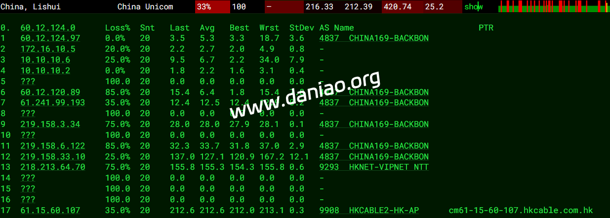 北京联通 NextTrace v1.5.0 2025-11-28T02:24:32Z 82cebb7 [NextTrace API] preferred API IP - 172.67.69.163 - 41.45ms - Misaka.HKG IP Geo Data Provider: LeoMoeAPI traceroute to 202.106.50.1, 30 hops max, 52 bytes payload, ICMP mode 1 * 2 10.254.8.2 * RFC1918 5.62 ms / 1.57 ms / 1.39 ms 3 192.168.64.64 * RFC1918 1.54 ms / 1.63 ms / 1.53 ms 4 192.168.64.30 * RFC1918 2.87 ms / 2.56 ms / 2.46 ms 5 218.213.64.69 AS9293 中国 香港 hello.global.ntt 3.47 ms / 3.43 ms / 3.52 ms 6 219.158.38.201 AS4837 [CU169-BACKBONE] 中国 香港 chinaunicom.cn 255.38 ms / * ms / * ms 7 219.158.3.189 AS4837 [CU169-BACKBONE] 中国 广东 广州 chinaunicom.cn 262.87 ms / * ms / * ms 8 219.158.4.37 AS4837 [CU169-BACKBONE] 中国 广东 广州 X-I chinaunicom.cn 联通 258.98 ms / * ms / * ms 9 * 10 * 11 * 12 202.106.50.1 AS4808 [UNICOM-BJ] 中国 北京 丰台区 www.bbn.com.cn 联通 293.67 ms / 291.34 ms / 286.99 ms ---------------------------------------------------------------------- 上海联通 NextTrace v1.5.0 2025-11-28T02:24:32Z 82cebb7 [NextTrace API] preferred API IP - 104.26.13.151 - 45.86ms - Misaka.HKG IP Geo Data Provider: LeoMoeAPI traceroute to 210.22.97.1, 30 hops max, 52 bytes payload, ICMP mode 1 * 2 10.254.8.2 * RFC1918 1.58 ms / 4.12 ms / 1.40 ms 3 192.168.64.64 * RFC1918 2.36 ms / 3.58 ms / 1.58 ms 4 192.168.64.30 * RFC1918 2.68 ms / 2.65 ms / 3.07 ms 5 218.213.64.69 AS9293 中国 香港 hello.global.ntt 3.55 ms / 3.57 ms / * ms 6 219.158.33.9 AS4837 [CU169-BACKBONE] 中国 北京 chinaunicom.cn 5.26 ms / 5.59 ms / 5.25 ms 7 219.158.6.121 AS4837 [CU169-BACKBONE] 中国 广东 广州 chinaunicom.cn 105.44 ms / 101.10 ms / * ms 8 219.158.4.101 AS4837 [CU169-BACKBONE] 中国 广东 广州 X-I chinaunicom.cn 联通 266.08 ms / 263.47 ms / * ms 9 * 10 * 11 * 12 112.64.250.202 AS17621 [APNIC-AP] 中国 上海 chinaunicom.cn 联通 283.68 ms / 272.06 ms / * ms 13 210.22.97.1 AS17621 [CNCNET-SH] 中国 上海 闵行区 chinaunicom.cn 联通 282.19 ms / 273.49 ms / 270.04 ms ---------------------------------------------------------------------- 深圳联通 NextTrace v1.5.0 2025-11-28T02:24:32Z 82cebb7 [NextTrace API] preferred API IP - 172.67.69.163 - 44.45ms - Misaka.HKG IP Geo Data Provider: LeoMoeAPI traceroute to 210.21.196.6, 30 hops max, 52 bytes payload, ICMP mode 1 10.242.248.189 * RFC1918 16.73 ms / 5.92 ms / 5.02 ms 2 * 3 192.168.64.64 * RFC1918 20.01 ms / 20.88 ms / 1.79 ms 4 192.168.64.30 * RFC1918 2.33 ms / 2.59 ms / 2.49 ms 5 218.213.64.69 AS9293 中国 香港 hello.global.ntt 3.39 ms / 3.34 ms / 3.31 ms 6 219.158.38.201 AS4837 [CU169-BACKBONE] 中国 香港 chinaunicom.cn 255.62 ms / 257.14 ms / * ms 7 219.158.3.209 AS4837 [CU169-BACKBONE] 中国 广东 广州 chinaunicom.cn 258.16 ms / 258.96 ms / * ms 8 219.158.24.137 AS4837 [CU169-BACKBONE] 中国 广东 广州 X-I chinaunicom.cn 联通 252.72 ms / * ms / * ms 9 * 10 * 11 120.80.147.254 AS17623 [APNIC-AP] 中国 广东 深圳 chinaunicom.cn 联通 105.78 ms / 104.91 ms / 106.54 ms 12 210.21.196.6 AS17623 中国 广东 深圳 宝安区 chinaunicom.cn 联通 110.04 ms / 102.32 ms / 101.36 ms