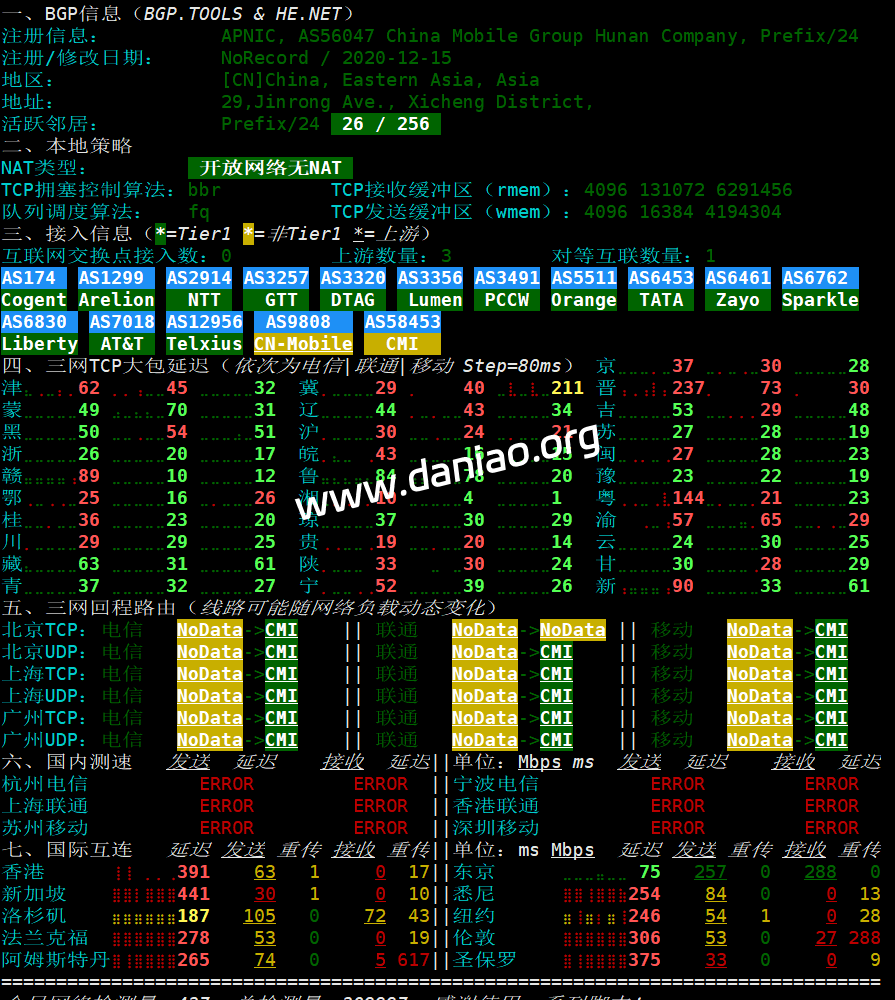 五、三网回程路由(线路可能随网络负载动态变化) 北京TCP:电信 NoData->CMI || 联通 NoData->NoData || 移动 NoData->CMI 北京UDP:电信 NoData->163 || 联通 NoData->4837 || 移动 NoData->CMI 上海TCP:电信 NoData->CMI || 联通 NoData->CMI || 移动 NoData->CMI 上海UDP:电信 NoData->CMI || 联通 NoData->CMI || 移动 NoData->CMI 广州TCP:电信 NoData->CMI || 联通 NoData->4837 || 移动 NoData->CMI 广州UDP:电信 NoData->163 || 联通 NoData->CMI || 移动 NoData->CMI