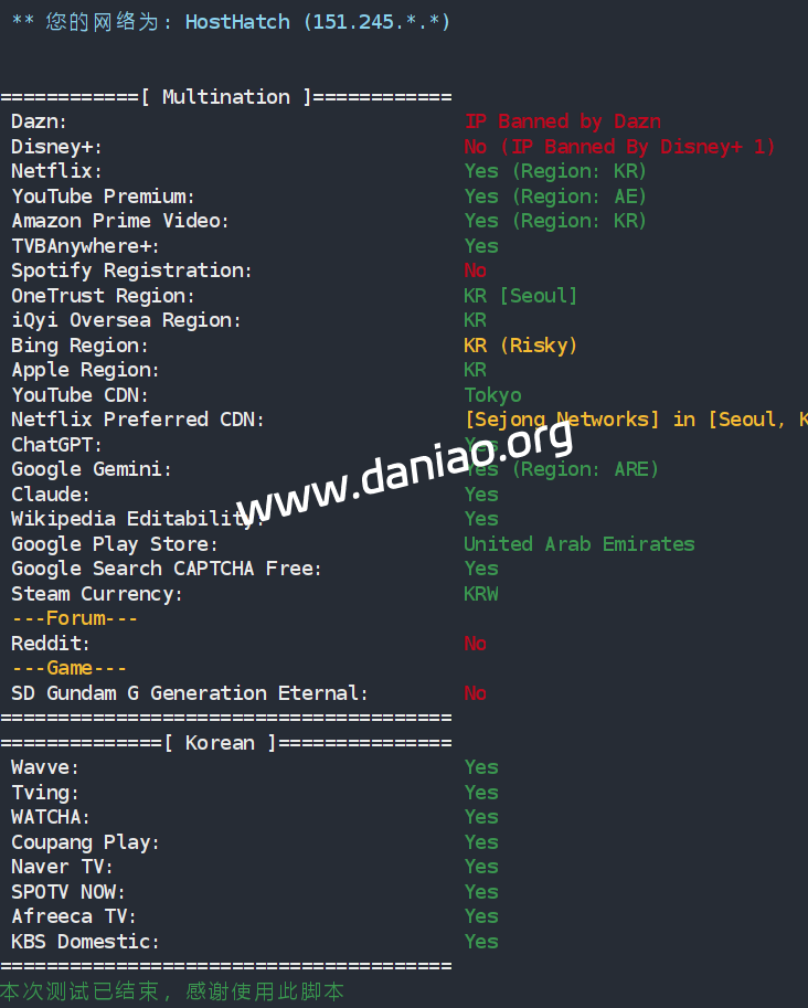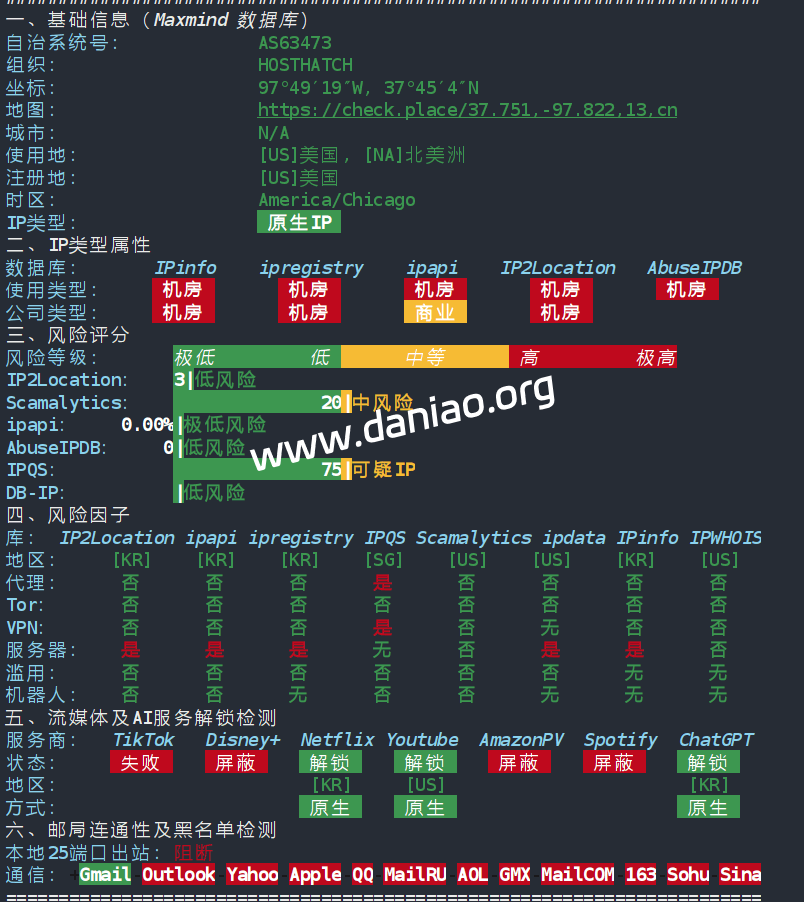 IP质量测试: 被识别为 hosting (托管) 和 数据中心类型。