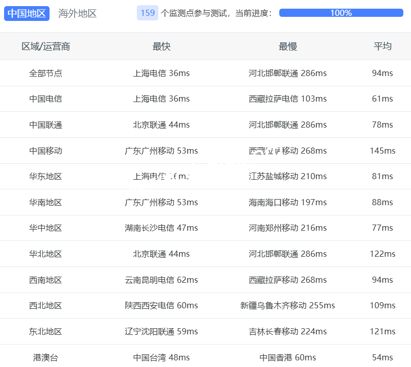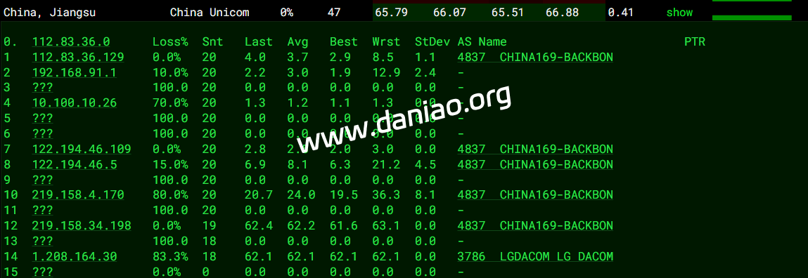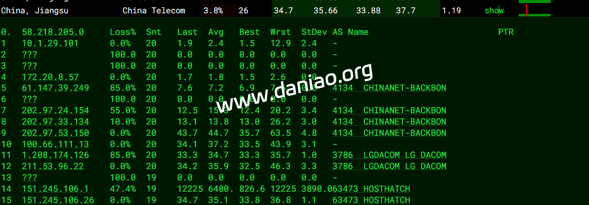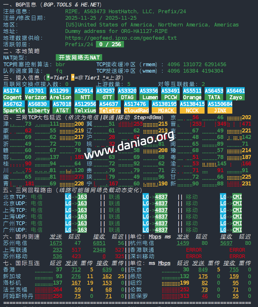 三网回程路由(线路可能随网络负载动态变化) 北京 电信 Telstra -> 163 地理路径:韩国 -> 香港 -> 北京 自治系统路径:AS63473 -> AS4637 -> AS4134 -> AS23724 1 1.09ms 2406:ef80:5:*:*:*:*:* AS63473 韩国 首尔 hosthatch.com 2 0.57ms fd3a:7c25:4b11:*:*:*:*:* * RFC4193 3 1.38ms 2403:e800:9ff:*:*:*:*:* AS4637 韩国 首尔 telstrainternational.com 4 36.26ms 2403:e800:fd20:*:*:*:*:* AS4637 中国 香港 telstrainternational.com 9-11 312.05ms 240e:0:a:*:*:*:*:* AS4134 中国 北京 chinatelecom.com.cn 电信 12-14 310.17ms 240e:0:9000:*:*:*:*:* AS23724 中国 北京 bjtelecom.net 电信 16 306.44ms 240e:904:800:*:*:*:*:* AS23724 中国 北京市 bjtelecom.net 电信 北京 联通 Verizon -> 4837 地理路径:韩国 -> 美国 -> 北京 自治系统路径:AS63473 -> AS4637 -> AS701 -> AS4837 -> AS4808 1 1.07ms 2406:ef80:5:*:*:*:*:* AS63473 韩国 首尔 hosthatch.com 2 0.41ms fd3a:7c25:4b11:*:*:*:*:* * RFC4193 3 1.57ms 2403:e800:9ff:*:*:*:*:* AS4637 韩国 首尔 telstrainternational.com 6 130.38ms 2600:80a::*:*:*:*:* AS701 美国 加利福尼亚 洛杉矶 verizon.com 7 141.08ms 2600:80a:13f:*:*:*:*:* AS701 美国 verizon.com 8-11 337.50ms 2408:8000:2:*:*:*:*:* AS4837 中国 北京 chinaunicom.cn 联通 12-13 328.56ms 2408:8000:1100:*:*:*:*:* AS4808 中国 北京 www.bbn.com.cn 联通 14 335.39ms 2408:8706:0:*:*:*:*:* AS4808 中国 北京市 www.bbn.com.cn 联通 北京 移动 Telstra -> CMI 地理路径:韩国 -> 香港 -> 广东 -> 天津 自治系统路径:AS63473 -> AS4637 -> AS58453 -> AS9808 1 1.07ms 2406:ef80:5:*:*:*:*:* AS63473 韩国 首尔 hosthatch.com 2 0.36ms fd3a:7c25:4b11:*:*:*:*:* * RFC4193 3 1.20ms 2403:e800:9ff:*:*:*:*:* AS4637 韩国 首尔 telstrainternational.com 5 83.62ms 2403:e800:e803:*:*:*:*:* AS4637 中国 香港 telstrainternational.com 6 85.03ms 2402:4f00:100:*:*:*:*:* AS58453 中国 香港 cmi.chinamobile.com 8-10 243.25ms 2409:8080:0:*:*:*:*:* AS9808 中国 广东 广州 chinamobileltd.com 移动 11-14 279.00ms 2409:8080:0:*:*:*:*:* AS9808 中国 天津市 chinamobileltd.com 移动 16 277.15ms 2409:8c02:11c:*:*:*:*:* AS9808 中国 天津市 chinamobileltd.com 移动 上海 电信 Telstra -> 163 地理路径:韩国 -> 香港 -> 上海 自治系统路径:AS63473 -> AS4637 -> AS4134 -> AS4812 1 0.96ms 2406:ef80:5:*:*:*:*:* AS63473 韩国 首尔 hosthatch.com 2 0.57ms fd3a:7c25:4b11:*:*:*:*:* * RFC4193 3 1.26ms 2403:e800:9ff:*:*:*:*:* AS4637 韩国 首尔 telstrainternational.com 4 39.03ms 2403:e800:fd20:*:*:*:*:* AS4637 中国 香港 telstrainternational.com 9-11 309.02ms 240e:0:a:*:*:*:*:* AS4134 中国 上海 chinatelecom.com.cn 电信 12-14 313.52ms 240e:18:10:*:*:*:*:* AS4812 中国 上海 chinatelecom.cn 15 285.90ms 240e:96c:6000:*:*:*:*:* AS4812 中国 上海市 chinatelecom.cn 电信 上海 联通 HE -> 4837 地理路径:韩国 -> 美国 -> 北京 -> 江苏 自治系统路径:AS63473 -> AS4637 -> AS6939 -> AS4837 1 1.28ms 2406:ef80:5:*:*:*:*:* AS63473 韩国 首尔 hosthatch.com 2 0.69ms fd3a:7c25:4b11:*:*:*:*:* * RFC4193 3 1.28ms 2403:e800:9ff:*:*:*:*:* AS4637 韩国 首尔 telstrainternational.com 8 154.12ms 2001:470:0:*:*:*:*:* AS6939 美国 加利福尼亚 洛杉矶 he.net 9 305.80ms 2408:8000:2:*:*:*:*:* AS4837 中国 北京 chinaunicom.cn 联通 10 297.49ms 2408:8000:2:*:*:*:*:* AS4837 中国 广东 广州 chinaunicom.cn 联通 12-14 321.54ms 2408:8000:2:*:*:*:*:* AS4837 中国 江苏 南京 广东-江苏 chinaunicom.cn 联通 16 345.67ms 2408:873c:6810:*:*:*:*:* AS4837 中国 江苏省 泰州市 chinaunicom.cn 联通 上海 移动 Telstra -> CMI 地理路径:韩国 -> 香港 -> 上海 自治系统路径:AS63473 -> AS4637 -> AS58453 -> AS9808 1 1.15ms 2406:ef80:5:*:*:*:*:* AS63473 韩国 首尔 hosthatch.com 2 0.38ms fd3a:7c25:4b11:*:*:*:*:* * RFC4193 3 1.35ms 2403:e800:9ff:*:*:*:*:* AS4637 韩国 首尔 telstrainternational.com 5 82.48ms 2403:e800:e803:*:*:*:*:* AS4637 中国 香港 telstrainternational.com 6-7 79.43ms 2402:4f00:100:*:*:*:*:* AS58453 中国 香港 cmi.chinamobile.com 8-12 243.40ms 2409:8080:0:*:*:*:*:* AS9808 中国 上海 chinamobileltd.com 移动 14 248.17ms 2409:8c1e:75b0:*:*:*:*:* AS9808 中国 上海市 chinamobileltd.com 移动 广东 电信 Telstra -> 163 地理路径:韩国 -> 广东 自治系统路径:AS63473 -> AS4637 -> AS4134 -> AS4816 1 1.24ms 2406:ef80:5:*:*:*:*:* AS63473 韩国 首尔 hosthatch.com 2 0.77ms fd3a:7c25:4b11:*:*:*:*:* * RFC4193 3 1.43ms 2403:e800:9ff:*:*:*:*:* AS4637 韩国 首尔 telstrainternational.com 9-11 305.86ms 240e:0:a:*:*:*:*:* AS4134 中国 广东 广州 chinatelecom.com.cn 电信 12-13 319.78ms 240e:1f:6000:*:*:*:*:* AS4816 中国 广东 深圳 电信 16 315.73ms 240e:97c:4008:*:*:*:*:* AS4816 中国 广东省 深圳市 电信 广东 联通 Telstra -> 4837 地理路径:韩国 -> 香港 -> 广东 自治系统路径:AS63473 -> AS4637 -> AS4837 -> AS135061 -> AS17623 -> AS135061 1 1.93ms 2406:ef80:5:*:*:*:*:* AS63473 韩国 首尔 hosthatch.com 2 0.52ms fd3a:7c25:4b11:*:*:*:*:* * RFC4193 3 1.29ms 2403:e800:9ff:*:*:*:*:* AS4637 韩国 首尔 telstrainternational.com 4 36.25ms 2403:e800:fd20:*:*:*:*:* AS4637 中国 香港 telstrainternational.com 9 297.43ms 2408:8000:2:*:*:*:*:* AS4837 中国 广东 广州 chinaunicom.cn 联通 10 302.61ms 2408:8000:2:*:*:*:*:* AS4837 中国 北京 chinaunicom.cn 联通 12 315.50ms 2408:8001:3171:*:*:*:*:* AS135061 中国 广东省 深圳市 chinaunicom.cn 联通 13-14 309.15ms 2408:8001:3071:*:*:*:*:* AS17623 中国 广东 深圳 chinaunicom.cn 15 313.92ms 2408:8756:2cef:*:*:*:*:* AS135061 中国 广东省 深圳市 chinaunicom.cn 联通 广东 移动 Telstra -> CMI 地理路径:韩国 -> 香港 -> 广东 自治系统路径:AS63473 -> AS4637 -> AS58453 -> AS9808 -> AS56040 -> AS9808 1 1.55ms 2406:ef80:5:*:*:*:*:* AS63473 韩国 首尔 hosthatch.com 2 0.73ms fd3a:7c25:4b11:*:*:*:*:* * RFC4193 3 2.25ms 2403:e800:9ff:*:*:*:*:* AS4637 韩国 首尔 telstrainternational.com 5 83.91ms 2403:e800:e803:*:*:*:*:* AS4637 中国 香港 telstrainterna
