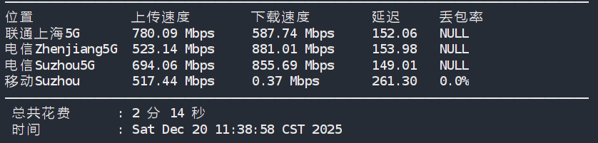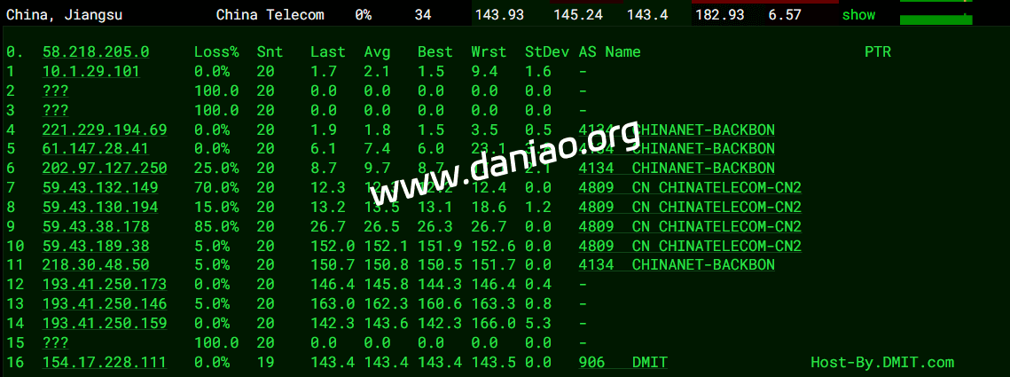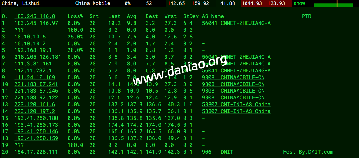五、三网回程路由(线路可能随网络负载动态变化) 北京 电信 AS906 -> 9929 地理路径:gateway -> 美国 -> 上海 -> 北京 自治系统路径:AS906 -> AS10099 -> AS9929 -> AS4134 -> AS4847 1 0.17ms 193.41.*.* AS906 [DMIT-BB] Anycast Anycast gateway DMIT.com 2 0.50ms 193.41.*.* AS906 [DMIT-BB] 美国 加利福尼亚 洛杉矶 DMIT.com 5-6 0.94ms 61.14.*.* [CUG-ASIA] * 美国 加利福尼亚 洛杉矶 中国联通(香港) 7 132.66ms 162.219.*.* AS10099 [CUG-BACKBONE] 中国 上海 chinaunicomglobal.com 联通 8 127.59ms 218.105.*.* AS9929 [CNC-BACKBONE] 中国 上海 chinaunicom.cn 联通 CUII 9 150.41ms 218.105.*.* AS9929 [CNC-BACKBONE] 中国 北京 chinaunicom.cn 联通 CUII 10 146.89ms 210.78.*.* [CNC-BACKBONE] * 中国 北京 chinaunicom.cn 联通 CUII 11 154.17ms 202.97.*.* AS4134 [CHINANET-BB] 中国 北京 chinatelecom.com.cn 电信 12 156.56ms 202.97.*.* AS4134 [CHINANET-BB] 中国 香港 chinatelecom.com.cn 14 152.00ms 36.112.*.* AS4847 中国 北京 bj.189.cn 15-16 154.69ms 219.141.*.* AS4847 [CHINATELECOM-BJ] 中国 北京 bj.189.cn 17 161.93ms 106.37.*.* AS4847 [CHINANET-HN] 中国 北京 bj.189.cn 北京 联通 AS906 -> 9929 地理路径:gateway -> 美国 -> 上海 -> 北京 自治系统路径:AS906 -> AS10099 -> AS9929 -> AS4808 1 0.19ms 193.41.*.* AS906 [DMIT-BB] Anycast Anycast gateway DMIT.com 2 0.41ms 193.41.*.* AS906 [DMIT-BB] 美国 加利福尼亚 洛杉矶 DMIT.com 5-6 0.84ms 61.14.*.* [CUG-ASIA] * 美国 加利福尼亚 洛杉矶 中国联通(香港) 7 132.61ms 162.219.*.* AS10099 [CUG-BACKBONE] 中国 上海 chinaunicomglobal.com 联通 8 133.66ms 218.105.*.* AS9929 [CNC-BACKBONE] 中国 上海 chinaunicom.cn 联通 CUII 9 156.15ms 218.105.*.* AS9929 [CNC-BACKBONE] 中国 北京 chinaunicom.cn 联通 CUII 10 157.51ms 210.78.*.* [CNC-BACKBONE] * 中国 北京 CU-CNC-Peer chinaunicom.cn 联通 CUII 13 160.17ms 61.49.*.* AS4808 中国 北京 www.bbn.com.cn 联通 14 154.42ms 61.149.*.* AS4808 [UNICOM-CN] 中国 北京市 丰台 www.bbn.com.cn 联通 19 153.05ms 123.125.*.* AS4808 [UNICOM-BJ] 中国 北京市 www.bbn.com.cn 联通 北京 移动 AS906 -> CMIN2 地理路径:gateway -> 美国 -> 上海 -> 北京 自治系统路径:AS906 -> AS58807 -> AS9808 -> AS56048 1 0.21ms 193.41.*.* AS906 [DMIT-BB] Anycast Anycast gateway DMIT.com 2 0.62ms 193.41.*.* AS906 [DMIT-BB] 美国 加利福尼亚 洛杉矶 DMIT.com 5 0.93ms 193.41.*.* AS906 [DMIT-BB] DMIT骨干网 DMIT.com 7 126.52ms 223.120.*.* AS58807 [CMIN2-NET] 美国 加利福尼亚 洛杉矶 cmi.chinamobile.com 移动 8 126.39ms 223.120.*.* AS58807 [CMIN2-NET] 中国 上海 洛杉矶-上海 cmi.chinamobile.com 移动 9-11 126.35ms 221.183.*.* AS9808 [CMNET] 中国 上海 X-I chinamobileltd.com 移动 12 150.07ms 221.183.*.* AS9808 [CMNET] 中国 北京 chinamobileltd.com 移动 14-17 153.68ms 211.136.*.* AS56048 [CMNET] 中国 北京 bj.10086.cn 移动 19 151.54ms 211.136.*.* AS56048 [CMNET] 中国 北京 bj.10086.cn 移动 上海 电信 AS906 -> 9929 地理路径:gateway -> 美国 -> 上海 自治系统路径:AS906 -> AS10099 -> AS9929 -> AS4134 -> AS4812 1 0.24ms 193.41.*.* AS906 [DMIT-BB] Anycast Anycast gateway DMIT.com 2 0.42ms 193.41.*.* AS906 [DMIT-BB] 美国 加利福尼亚 洛杉矶 DMIT.com 5-6 1.01ms 61.14.*.* [CUG-ASIA] * 美国 加利福尼亚 洛杉矶 中国联通(香港) 7 132.72ms 162.219.*.* AS10099 [CUG-BACKBONE] 中国 上海 chinaunicomglobal.com 联通 8 128.86ms 210.14.*.* [CNC-BACKBONE] * 中国 上海 联通 9 133.66ms 218.105.*.* AS9929 [CNC-BACKBONE] 中国 上海 chinaunicom.cn 联通 CUII 10 134.03ms 202.97.*.* AS4134 [CHINANET-BB] 中国 上海 chinatelecom.com.cn 电信 12-13 132.40ms 61.152.*.* AS4812 [CHINANET-SH] 中国 上海 chinatelecom.cn 电信 19 135.56ms 101.226.*.* AS4812 [CHINANET-SH] 中国 上海市 chinatelecom.cn 电信 上海 联通 AS906 -> 9929 地理路径:gateway -> 美国 -> 上海 自治系统路径:AS906 -> AS10099 -> AS9929 -> AS4837 -> AS140979 1 0.31ms 193.41.*.* AS906 [DMIT-BB] Anycast Anycast gateway DMIT.com 2 0.49ms 193.41.*.* AS906 [DMIT-BB] 美国 加利福尼亚 洛杉矶 DMIT.com 5-6 1.06ms 61.14.*.* [CUG-ASIA] * 美国 加利福尼亚 洛杉矶 中国联通(香港) 7 134.53ms 162.219.*.* AS10099 [CUG-BACKBONE] 美国 加利福尼亚 洛杉矶 chinaunicomglobal.com 联通 8 133.00ms 210.14.*.* [CNC-BACKBONE] * 中国 上海 联通 9 133.29ms 218.105.*.* AS9929 [CNC-BACKBONE] 中国 上海 chinaunicom.cn 联通 CUII 11 135.36ms 219.158.*.* AS4837 [CU169-BACKBONE] 中国 上海 chinaunicom.cn 联通 18 135.18ms 58.246.*.* AS140979 中国 上海市 chinaunicom.cn 联通 上海 移动 AS906 -> CMIN2 地理路径:gateway -> 美国 -> 上海 自治系统路径:AS906 -> AS58807 -> AS9808 1 0.24ms 193.41.*.* AS906 [DMIT-BB] Anycast Anycast gateway DMIT.com 2 0.43ms 193.41.*.* AS906 [DMIT-BB] 美国 加利福尼亚 洛杉矶 DMIT.com 5 0.90ms 193.41.*.* AS906 [DMIT-BB] DMIT骨干网 DMIT.com 7 126.80ms 223.120.*.* AS58807 [CMIN2-NET] 美国 加利福尼亚 洛杉矶 cmi.chinamobile.com 移动 8 126.25ms 223.120.*.* AS58807 [CMIN2-NET] 中国 上海 洛杉矶-上海 cmi.chinamobile.com 移动 9-12 126.24ms 221.183.*.* AS9808 [CMNET] 中国 上海 X-I chinamobileltd.com 移动 16 128.28ms 117.185.*.* AS9808 [CMNET] 中国 上海市 chinamobileltd.com 移动 广东 电信 AS906 -> 9929 地理路径:gateway -> 美国 -> 上海 -> 广东 自治系统路径:AS906 -> AS10099 -> AS9929 -> AS4134 1 0.27ms 193.41.*.* AS906 [DMIT-BB] Anycast Anycast gateway DMIT.com 2 0.57ms 193.41.*.* AS906 [DMIT-BB] 美国 加利福尼亚 洛杉矶 DMIT.com 5-6 0.89ms 61.14.*.* [CUG-ASIA] * 美国 加利福尼亚 洛杉矶 中国联通(香港) 7 132.45ms 162.219.*.* AS10099 [CUG-BACKBONE] 中国 上海 chinaunicomglobal.com 联通 8 127.04ms 210.14.*.* [CNC-BACKBONE] * 中国 上海 联通 9 159.24ms 218.105.*.* AS9929 [CNC-BACKBONE] 中国 广东 广州 chinaunicom.cn 联通 CUII 10 159.43ms 210.14.*.* [CNC-BACKBONE] * 中国 广东 广州 12 158.12ms 202.97.*.* AS4