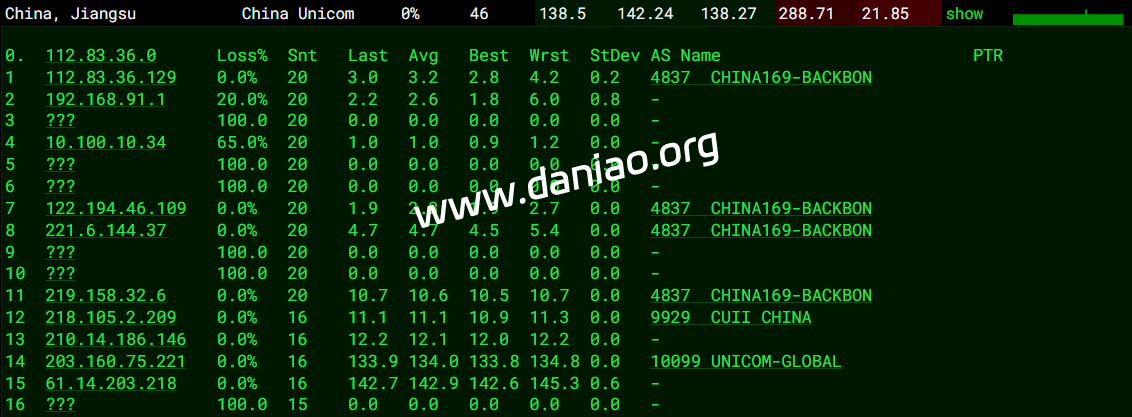 五、三网回程路由(线路可能随网络负载动态变化) 北京 电信 Unknown -> 9929 地理路径:美国 -> 上海 -> 北京 自治系统路径:AS10099 -> AS9929 -> AS4134 -> AS23724 1-5 0.68ms 2605:52c0::*:*:*:*:* * 美国 7 132.03ms 2401:8a00:fe00:*:*:*:*:* AS10099 中国 上海 LAX-SHA chinaunicomglobal.com 8 126.94ms 2408:8120:2:*:*:*:*:* AS9929 中国 上海 chinaunicom.cn 联通 CUII 9-10 155.88ms 2408:8120:2:*:*:*:*:* AS9929 中国 北京 chinaunicom.cn 联通 CUII 11 146.33ms 240e::e:*:*:*:*:* AS4134 中国 chinatelecom.com.cn 电信 12 165.11ms 240e::c:*:*:*:*:* AS4134 中国 北京 chinatelecom.com.cn 电信 13-15 154.33ms 240e:0:9000:*:*:*:*:* AS23724 中国 北京市 bjtelecom.net 电信 17 146.91ms 240e:904:800:*:*:*:*:* AS23724 中国 北京市 bjtelecom.net 电信 北京 联通 Unknown -> 9929 地理路径:美国 -> 上海 -> 北京 自治系统路径:AS10099 -> AS9929 -> AS4808 1-5 1.05ms 2605:52c0::*:*:*:*:* * 美国 7 133.09ms 2401:8a00:fe00:*:*:*:*:* AS10099 中国 上海 LAX-SHA chinaunicomglobal.com 8 132.51ms 2408:8120:2:*:*:*:*:* AS9929 中国 上海 chinaunicom.cn 联通 CUII 9-10 152.28ms 2408:8120:2:*:*:*:*:* AS9929 中国 北京 chinaunicom.cn 联通 CUII 13-14 196.66ms 2408:8000:1100:*:*:*:*:* AS4808 中国 北京 www.bbn.com.cn 联通 16 152.54ms 2408:8706:0:*:*:*:*:* AS4808 中国 北京市 www.bbn.com.cn 联通 北京 移动 Unknown -> CMIN2 地理路径:美国 -> 上海 -> 天津 自治系统路径:AS58807 -> AS9808 -> AS38019 -> AS9808 1-6 0.60ms 2605:52c0::*:*:*:*:* * 美国 7 1.37ms 2402:4f00:f002:*:*:*:*:* AS58807 美国 加利福尼亚 洛杉矶 cmi.chinamobile.com 8 126.29ms 2402:4f00:f000:*:*:*:*:* AS58807 中国 上海 cmi.chinamobile.com 9-12 126.51ms 2409:8080:0:*:*:*:*:* AS9808 中国 上海 chinamobileltd.com 移动 13-14 149.49ms 2409:8080:1:*:*:*:*:* AS9808 中国 天津市 chinamobileltd.com 移动 15 158.63ms 2409:8002:48:*:*:*:*:* AS38019 中国 天津 天津 tj.10086.cn 19 154.51ms 2409:8c02:11c:*:*:*:*:* AS9808 中国 天津市 chinamobileltd.com 移动 上海 电信 Unknown -> 9929 地理路径:美国 -> 上海 自治系统路径:AS10099 -> AS9929 -> AS4134 -> AS4812 1-5 0.60ms 2605:52c0::*:*:*:*:* * 美国 7 132.29ms 2401:8a00:fe00:*:*:*:*:* AS10099 中国 上海 LAX-SHA chinaunicomglobal.com 8-9 132.95ms 2408:8120:2:*:*:*:*:* AS9929 中国 上海 chinaunicom.cn 联通 CUII 10-11 128.54ms 240e::e:*:*:*:*:* AS4134 中国 上海 chinatelecom.com.cn 电信 12-14 140.36ms 240e:18:10:*:*:*:*:* AS4812 中国 上海 chinatelecom.cn 15 128.95ms 240e:96c:6000:*:*:*:*:* AS4812 中国 上海市 chinatelecom.cn 电信 上海 联通 Unknown -> 9929 地理路径:美国 -> 上海 -> 江苏 自治系统路径:AS10099 -> AS9929 -> AS4837 1-5 0.65ms 2605:52c0::*:*:*:*:* * 美国 7 131.99ms 2401:8a00:fe00:*:*:*:*:* AS10099 中国 上海 LAX-SHA chinaunicomglobal.com 8-9 133.12ms 2408:8120:2:*:*:*:*:* AS9929 中国 上海 chinaunicom.cn 联通 CUII 11 158.85ms 2408:8000:2:*:*:*:*:* AS4837 中国 chinaunicom.cn 联通 12-14 146.42ms 2408:8000:2:*:*:*:*:* AS4837 中国 江苏 南京 上海-江苏 chinaunicom.cn 联通 16 162.57ms 2408:873c:6810:*:*:*:*:* AS4837 中国 江苏省 泰州市 chinaunicom.cn 联通 上海 移动 Unknown -> CMIN2 地理路径:美国 -> 上海 自治系统路径:AS58807 -> AS9808 -> AS24400 -> AS9808 1-6 0.54ms 2605:52c0::*:*:*:*:* * 美国 7 1.71ms 2402:4f00:f002:*:*:*:*:* AS58807 美国 加利福尼亚 洛杉矶 cmi.chinamobile.com 8 126.24ms 2402:4f00:f000:*:*:*:*:* AS58807 中国 上海 cmi.chinamobile.com 9-12 126.37ms 2409:8080:0:*:*:*:*:* AS9808 中国 上海 chinamobileltd.com 移动 13 132.48ms 2409:801e:f0:*:*:*:*:* AS24400 中国 上海市 sh.10086.cn 移动 18 129.24ms 2409:8c1e:8fc0:*:*:*:*:* AS9808 中国 上海市 chinamobileltd.com 移动 广东 电信 Unknown -> 9929 地理路径:美国 -> 上海 -> 广东 自治系统路径:AS10099 -> AS9929 -> AS4134 -> AS4816 1-5 0.48ms 2605:52c0::*:*:*:*:* * 美国 7 131.92ms 2401:8a00:fe00:*:*:*:*:* AS10099 中国 上海 LAX-SHA chinaunicomglobal.com 8 132.52ms 2408:8120:2:*:*:*:*:* AS9929 中国 上海 chinaunicom.cn 联通 CUII 9 158.85ms 2408:8120:2:*:*:*:*:* AS9929 中国 广东 广州 chinaunicom.cn 联通 CUII 10 159.96ms 2408:8120:2:*:*:*:*:* AS9929 中国 北京 chinaunicom.cn 联通 CUII 11-12 158.85ms 240e::e:*:*:*:*:* AS4134 中国 广东 广州 chinatelecom.com.cn 电信 13-14 153.37ms 240e:1f:6000:*:*:*:*:* AS4816 中国 广东 深圳 电信 17 157.84ms 240e:97c:4008:*:*:*:*:* AS4816 中国 广东省 深圳市 电信 广东 联通 Unknown -> 9929 地理路径:美国 -> 上海 -> 广东 自治系统路径:AS10099 -> AS9929 -> AS4837 -> AS135061 -> AS17623 -> AS135061 1-5 0.70ms 2605:52c0::*:*:*:*:* * 美国 7 132.00ms 2401:8a00:fe00:*:*:*:*:* AS10099 中国 上海 LAX-SHA chinaunicomglobal.com 8 132.66ms 2408:8120:2:*:*:*:*:* AS9929 中国 上海 chinaunicom.cn 联通 CUII 9 158.44ms 2408:8120:2:*:*:*:*:* AS9929 中国 广东 广州 chinaunicom.cn 联通 CUII 10 159.64ms 2408:8120:2:*:*:*:*:* AS9929 中国 北京市 chinaunicom.cn 联通 CUII 12 146.23ms 2408:8000:2:*:*:*:*:* AS4837 中国 chinaunicom.cn 联通 13 177.18ms 2408:8001:3171:*:*:*:*:* AS135061 中国 广东 深圳 chinaunicom.cn 14 160.61ms 2408:8001:3071:*:*:*:*:* AS17623 中国 广东 深圳 chinaunicom.cn 16 148.52ms 2408:8756:2cef:*:*:*:*:* AS135061 中国 广东省 深圳市 chinaunicom.cn 联通 广东 移动 Unknown -> CMIN2 地理路径:美国 -> 上海 -> 广东 自治系统路径:AS58807 -> AS9808 -> AS56040 -> AS9808 1-6 0.77ms 2605:52c0::*:*:*:*:* * 美国 7 4.52ms 2402:4f00:f002:*:*:*:*:* AS58807 美国 加利福尼亚 洛杉矶 cmi.chinamobile.com 8 126.33ms 2402:4f00:f000:*:*:*:*:* AS58807 中国 上海 cmi.chinamobile.com 9-11 127.85ms 2409:8080:0:*:*:*:*:* AS9808 中国 上海 chinamobileltd.com 移动 12-13 165.25ms 2409:8080:1:*:*:*:*:* AS9808 中国 广东 广州 chinamobileltd.com 移动 14-15 163.84ms 2409:8055:3010:*:*:*:*:* AS56040 中国 广东 深圳 gd.10086.cn 17 