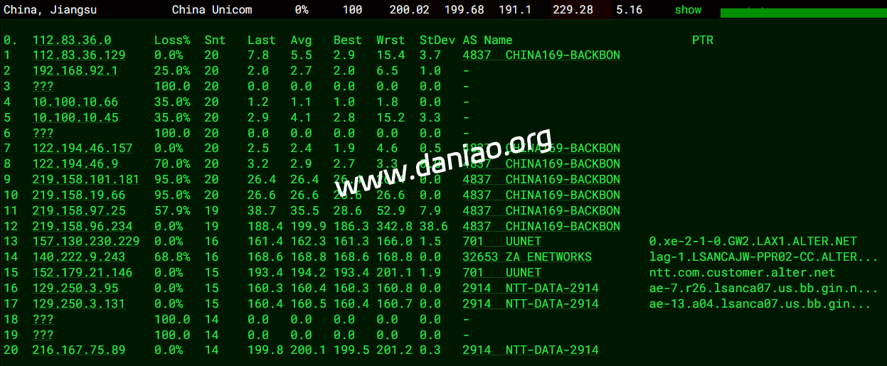 联通去程:直连联通美国洛杉矶节点,然后接alter.Net再转NTT去机房