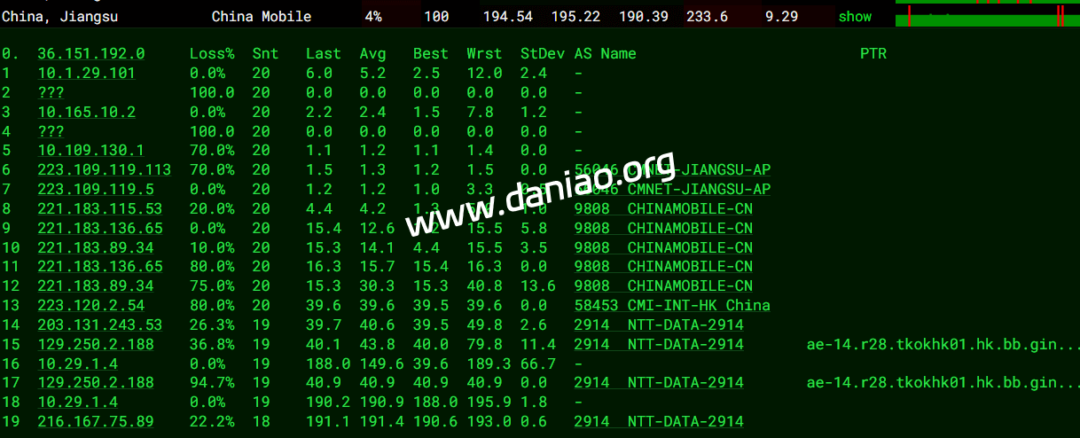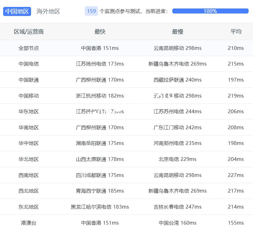 五、三网回程路由(线路可能随网络负载动态变化) 北京 电信 Unknown -> 4837 地理路径:香港 -> 广东 -> 北京 自治系统路径:AS4837 -> AS4847 2-3 0.47ms 10.52.*.* * RFC1918 6 9.48ms 61.14.*.* * 中国 香港 8 170.62ms 219.158.*.* AS4837 [CU169-BACKBONE] 中国 广东 广州 chinaunicom.cn 联通 14 170.26ms 36.112.*.* AS4847 中国 北京 bj.189.cn 15-16 165.24ms 219.141.*.* AS4847 [CHINATELECOM-BJ] 中国 北京 bj.189.cn 17 200.14ms 219.141.*.* AS4847 [CHINATELECOM-BJ] 中国 北京 bj.189.cn 北京 联通 Unknown -> 4837 地理路径:香港 -> 广东 -> 北京 自治系统路径:AS4837 -> AS4808 2-3 1.35ms 10.52.*.* * RFC1918 6 9.75ms 61.14.*.* * 中国 香港 7-8 167.50ms 219.158.*.* AS4837 [CU169-BACKBONE] 中国 广东 广州 chinaunicom.cn 联通 10 194.81ms 219.158.*.* AS4837 [CU169-BACKBONE] 中国 北京 chinaunicom.cn 联通 11-12 199.98ms 124.64.*.* AS4808 [UNICOM-BJ] 中国 北京 北京 www.bbn.com.cn 20 214.26ms 123.125.*.* AS4808 [UNICOM-BJ] 中国 北京市 www.bbn.com.cn 联通 北京 移动 Unknown -> 4837 地理路径:香港 -> 北京 自治系统路径:AS4837 -> AS9808 -> AS56048 2-3 0.51ms 10.52.*.* * RFC1918 5 177.34ms 61.14.*.* * 中国 香港 7-8 190.42ms 219.158.*.* AS4837 [CU169-BACKBONE] 中国 北京 chinaunicom.cn 10 207.98ms 221.183.*.* AS9808 [CMNET] 中国 北京 chinamobileltd.com 移动 13-15 213.69ms 211.136.*.* AS56048 [CMNET] 中国 北京 bj.10086.cn 移动 18 209.92ms 211.136.*.* AS56048 [CMNET] 中国 北京 bj.10086.cn 移动 上海 电信 Unknown -> 4837 地理路径:香港 -> 北京 -> 广东 -> 上海 自治系统路径:AS4837 -> AS4812 2-3 0.97ms 10.52.*.* * RFC1918 6 11.47ms 61.14.*.* * 中国 香港 7-8 176.05ms 219.158.*.* AS4837 [CU169-BACKBONE] 中国 北京 chinaunicom.cn 联通 9 165.58ms 219.158.*.* AS4837 [CU169-BACKBONE] 中国 广东 广州 chinaunicom.cn 联通 15 161.78ms 101.95.*.* AS4812 [CHINANET-SH] 中国 上海 chinatelecom.cn 电信 21 159.62ms 101.226.*.* AS4812 [CHINANET-SH] 中国 上海市 chinatelecom.cn 电信 上海 联通 Unknown -> 4837 地理路径:香港 -> 北京 -> 上海 自治系统路径:AS4837 -> AS140979 2-3 0.45ms 10.52.*.* * RFC1918 5 175.58ms 61.14.*.* * 中国 香港 6-8 168.33ms 219.158.*.* AS4837 [CU169-BACKBONE] 中国 北京 chinaunicom.cn 联通 16 180.43ms 112.64.*.* AS140979 [APNIC-AP] 中国 上海市 闵行 chinaunicom.cn 联通 上海 移动 Unknown -> 4837 地理路径:香港 -> 北京 -> 上海 自治系统路径:AS4837 -> AS9808 2-3 0.69ms 10.52.*.* * RFC1918 5 176.43ms 61.14.*.* * 中国 香港 6-7 167.99ms 219.158.*.* AS4837 [CU169-BACKBONE] 中国 北京 chinaunicom.cn 联通 11-12 171.26ms 221.183.*.* AS9808 [CMNET] 中国 上海 chinamobileltd.com 移动 17 174.05ms 117.185.*.* AS9808 [CMNET] 中国 上海市 chinamobileltd.com 移动 广东 电信 Unknown -> 4837 地理路径:香港 -> 广东 自治系统路径:AS4837 -> AS4134 2-3 0.49ms 10.52.*.* * RFC1918 6 10.74ms 61.14.*.* * 中国 香港 7 164.29ms 219.158.*.* AS4837 [CU169-BACKBONE] 中国 广东 广州 chinaunicom.cn 联通 8 170.18ms 219.158.*.* AS4837 [CU169-BACKBONE] 中国 北京 chinaunicom.cn 联通 20 191.78ms 183.47.*.* AS4134 [APNIC-AP] 中国 广东省 广州市 chinatelecom.com.cn 电信 广东 联通 Unknown -> 4837 地理路径:香港 -> 广东 自治系统路径:AS4837 -> AS136958 2-3 0.68ms 10.52.*.* * RFC1918 6 10.98ms 61.14.*.* * 中国 香港 7-9 161.70ms 219.158.*.* AS4837 [CU169-BACKBONE] 中国 广东 广州 chinaunicom.cn 联通 16 163.11ms 157.148.*.* AS136958 [UNICOM-GD] 中国 广东省 广州市 chinaunicom.cn 联通 广东 移动 Unknown -> 4837 地理路径:香港 -> 北京 -> 广东 自治系统路径:AS4837 -> AS9808 -> AS56040 2-3 0.60ms 10.52.*.* * RFC1918 5 175.85ms 61.14.*.* * 中国 香港 6-8 177.28ms 219.158.*.* AS4837 [CU169-BACKBONE] 中国 北京 chinaunicom.cn 联通 11-13 194.73ms 221.183.*.* AS9808 [CMNET] 中国 广东 广州 chinamobileltd.com 移动 14-17 209.80ms 183.235.*.* AS56040 [APNIC-AP] 中国 广东 广州 gd.10086.cn 移动 20 205.79ms 211.139.*.* AS56040 [CMNET] 中国 广东 广州 gd.10086.cn 移动