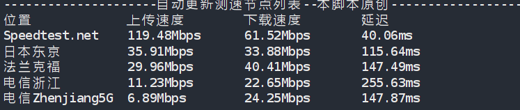 CPU Model : Intel(R) Xeon(R) Gold 6133 CPU @ 2.50GHz CPU Cores : 2 @ 2494.140 MHz CPU Cache : 28160 KB AES-NI : ✓ Enabled VM-x/AMD-V : ✓ Enabled Total Disk : 29.5 GB (627.3 MB Used) Total Mem : 1.9 GB (59.7 MB Used) System uptime : 0 days, 3 hour 13 min Load average : 0.00, 0.00, 0.00 OS : Debian GNU/Linux 11 Arch : x86_64 (64 Bit) Kernel : 5.10.0-14-cloud-amd64 TCP CC : bbr Virtualization : KVM IPv4/IPv6 : ✓ Online / ✗ Offline Organization : AS2914 NTT America, Inc. Location : Yorba Linda / US Region : California ---------------------------------------------------------------------- I/O Speed(1st run) : 150 MB/s I/O Speed(2nd run) : 398 MB/s I/O Speed(3rd run) : 289 MB/s I/O Speed(average) : 279.0 MB/s ---------------------------------------------------------------------- Node Name Upload Speed Download Speed Latency Speedtest.net 792.77 Mbps 66.18 Mbps 39.58 ms Paris, FR 570.06 Mbps 101.48 Mbps 136.49 ms Shanghai, CN 244.75 Mbps 89.78 Mbps 173.06 ms Hong Kong, CN 3.31 Mbps 3.20 Mbps 224.59 ms Singapore, SG 68.24 Mbps 96.61 Mbps 182.85 ms Tokyo, JP 708.35 Mbps 100.94 Mbps 117.65 ms