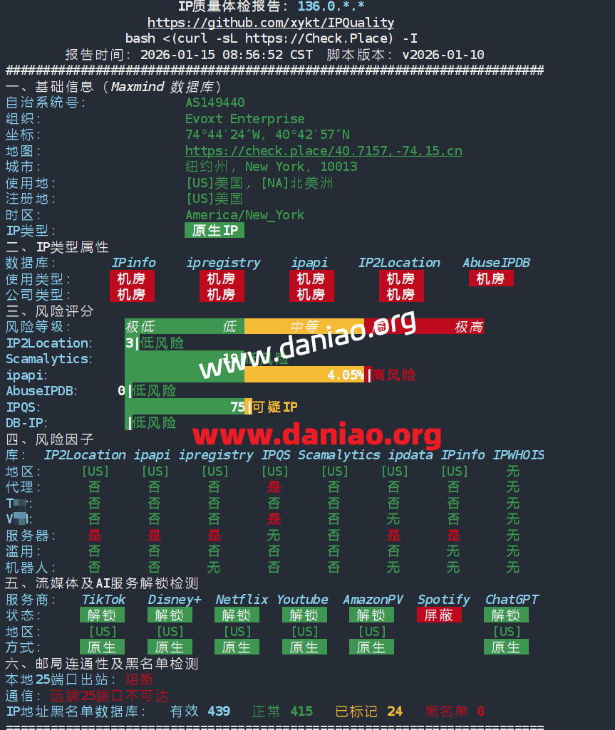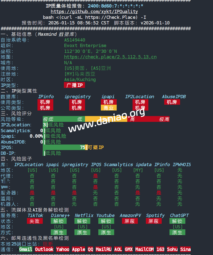 测试的IP为原生IP,IPv6为广播IP。原生IP解锁能力不错。