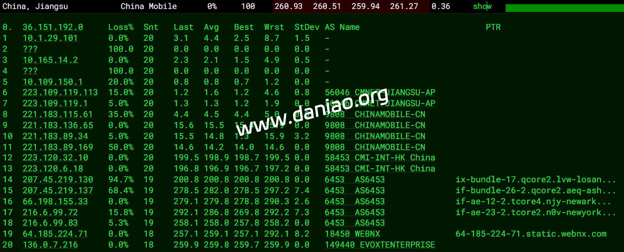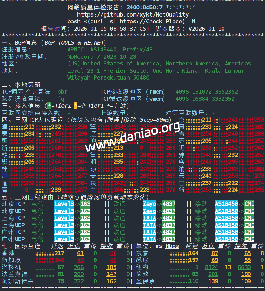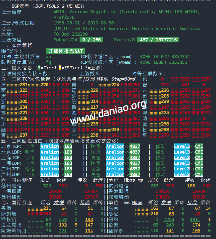 北京 电信 Level3 -> 163 地理路径:美国 -> 北京 自治系统路径:AS149440 -> AS18450 -> AS3356 -> AS4134 -> AS23724 1 0.80ms 2400:8d60:7:*:*:*:*:* AS149440 美国 纽约州 纽约 evoxt.com 2 0.22ms 2607:f2d8:2000:*:*:*:*:* AS18450 美国 纽约州 纽约 WebNX.com 3 1.12ms 2001:1900:2100:*:*:*:*:* AS3356 美国 纽约 纽约 lumen.com 4 68.13ms 2001:1900::*:*:*:*:* AS3356 美国 加利福尼亚 圣何塞 Level3-CT-PoP lumen.com 5 12.47ms 2605:9d80:8021:*:*:*:*:* AS4134 美国 弗吉尼亚州 阿什本 chinatelecom.com.cn 电信 6-8 206.40ms 240e:0:a:*:*:*:*:* AS4134 中国 北京 chinatelecom.com.cn 电信 9-12 214.04ms 240e:0:9000:*:*:*:*:* AS23724 中国 北京 bjtelecom.net 电信 13 213.89ms 240e:904:800:*:*:*:*:* AS23724 中国 北京市 bjtelecom.net 电信 北京 联通 Zayo -> 4837 地理路径:美国 -> 北京 自治系统路径:AS149440 -> AS18450 -> AS3356 -> AS6461 -> AS4837 -> AS4808 1 0.74ms 2400:8d60:7:*:*:*:*:* AS149440 美国 纽约州 纽约 evoxt.com 2 2.05ms 2607:f2d8:2000:*:*:*:*:* AS18450 美国 纽约州 纽约 WebNX.com 3 1.64ms 2001:1900:2100:*:*:*:*:* AS3356 美国 纽约 纽约 lumen.com 4 62.28ms 2001:438:ffff:*:*:*:*:* AS6461 美国 加利福尼亚 洛杉矶 zayo.com 7 249.35ms 2408:8000:2:*:*:*:*:* AS4837 中国 北京 chinaunicom.cn 联通 9-10 233.88ms 2408:8000:1100:*:*:*:*:* AS4808 中国 北京 www.bbn.com.cn 联通 12 233.37ms 2408:8706:0:*:*:*:*:* AS4808 中国 北京市 www.bbn.com.cn 联通 北京 移动 AS18450 -> CMI 地理路径:美国 -> 香港 -> 广东 -> 北京 自治系统路径:AS149440 -> AS18450 -> AS58453 -> AS9808 1 1.05ms 2400:8d60:7:*:*:*:*:* AS149440 美国 纽约州 纽约 evoxt.com 2-3 0.32ms 2607:f2d8:2000:*:*:*:*:* AS18450 美国 纽约州 纽约 WebNX.com 6 226.28ms 2402:4f00:1000:*:*:*:*:* AS58453 中国 香港 cmi.chinamobile.com 7-10 217.33ms 2409:8080:0:*:*:*:*:* AS9808 中国 广东 广州 chinamobileltd.com 移动 11-13 254.94ms 2409:8080:0:*:*:*:*:* AS9808 中国 北京市 chinamobileltd.com 移动 14 253.74ms 2409:8c00:7821:*:*:*:*:* AS9808 中国 北京市 chinamobileltd.com 移动 上海 电信 Level3 -> 163 地理路径:美国 -> 上海 自治系统路径:AS149440 -> AS18450 -> AS3356 -> AS4134 -> AS4812 1 0.80ms 2400:8d60:7:*:*:*:*:* AS149440 美国 纽约州 纽约 evoxt.com 2 1.09ms 2607:f2d8:2000:*:*:*:*:* AS18450 美国 纽约州 纽约 WebNX.com 3 1.13ms 2001:1900:2100:*:*:*:*:* AS3356 美国 纽约 纽约 lumen.com 4 67.47ms 2001:1900::*:*:*:*:* AS3356 美国 加利福尼亚 圣何塞 Level3-CT-PoP lumen.com 5 11.03ms 2605:9d80:8021:*:*:*:*:* AS4134 美国 弗吉尼亚州 阿什本 chinatelecom.com.cn 电信 6-9 199.56ms 240e:0:a:*:*:*:*:* AS4134 中国 上海 chinatelecom.com.cn 电信 10-12 210.47ms 240e:18:10:*:*:*:*:* AS4812 中国 上海 chinatelecom.cn 13 202.08ms 240e:96c:6000:*:*:*:*:* AS4812 中国 上海市 chinatelecom.cn 电信 上海 联通 TATA -> 4837 地理路径:美国 -> 江苏 -> 北京 自治系统路径:AS149440 -> AS18450 -> AS6453 -> AS4837 1 1.18ms 2400:8d60:7:*:*:*:*:* AS149440 美国 纽约州 纽约 evoxt.com 2 0.35ms 2607:f2d8:2000:*:*:*:*:* AS18450 美国 纽约州 纽约 WebNX.com 3 0.54ms 2001:5a0:400:*:*:*:*:* AS6453 美国 纽约 纽约 tatacommunications.com 4-5 5.77ms 2001:5a0:4500:*:*:*:*:* AS6453 美国 新泽西州 纽瓦克 tatacommunications.com 7-8 21.09ms 2001:5a0:4201:*:*:*:*:* AS6453 美国 伊利诺伊 芝加哥 tatacommunications.com 9 64.47ms 2001:5a0:3e02:*:*:*:*:* AS6453 美国 加利福尼亚 圣何塞 tatacommunications.com 10 259.94ms 2408:8000:a009:*:*:*:*:* AS4837 中国 江苏 泰州 chinaunicom.cn 11-12 260.41ms 2408:8000:2:*:*:*:*:* AS4837 中国 北京 chinaunicom.cn 联通 13 266.00ms 2408:8000:2:*:*:*:*:* AS4837 中国 北京 chinaunicom.cn 联通 上海 移动 AS18450 -> CMI 地理路径:美国 -> 上海 自治系统路径:AS149440 -> AS18450 -> AS58453 -> AS9808 1 0.89ms 2400:8d60:7:*:*:*:*:* AS149440 美国 纽约州 纽约 evoxt.com 2-3 0.38ms 2607:f2d8:2000:*:*:*:*:* AS18450 美国 纽约州 纽约 WebNX.com 4 61.47ms 2001:504:1:*:*:*:*:* AS58453 美国 纽约州 纽约 NYIIX New York - China Mobile International - 100Gbps cmi.chinamobile.com 6 264.95ms 2402:4f00:1000:*:*:*:*:* AS58453 中国 上海 cmi.chinamobile.com 移动 7 245.67ms 2402:4f00:1000:*:*:*:*:* AS58453 中国 香港 cmi.chinamobile.com 8-12 254.12ms 2409:8080:0:*:*:*:*:* AS9808 中国 上海 chinamobileltd.com 移动 14 249.56ms 2409:8c1e:68e0:*:*:*:*:* AS9808 中国 上海市 chinamobileltd.com 移动 广东 电信 Level3 -> 163 地理路径:美国 -> 广东 自治系统路径:AS149440 -> AS18450 -> AS3356 -> AS4134 -> AS4816 1 1.14ms 2400:8d60:7:*:*:*:*:* AS149440 美国 纽约州 纽约 evoxt.com 2 0.29ms 2607:f2d8:2000:*:*:*:*:* AS18450 美国 纽约州 纽约 WebNX.com 3 1.32ms 2001:1900:2100:*:*:*:*:* AS3356 美国 纽约 纽约 lumen.com 4 88.95ms 2001:1900::*:*:*:*:* AS3356 美国 加利福尼亚 圣何塞 Level3-CT-PoP lumen.com 6-8 213.13ms 240e:0:a:*:*:*:*:* AS4134 中国 广东 广州 chinatelecom.com.cn 电信 9-11 219.54ms 240e:1f:6000:*:*:*:*:* AS4816 中国 广东 深圳 电信 13 217.21ms 240e:97c:4008:*:*:*:*:* AS4816 中国 广东省 深圳市 电信 广东 联通 TATA -> 4837 地理路径:美国 -> 广东 自治系统路径:AS149440 -> AS18450 -> AS6453 -> AS4837 -> AS6453 -> AS135061 -> AS17623 -> AS4837 -> AS135061 1 0.92ms 2400:8d60:7:*:*:*:*:* AS149440 美国 纽约州 纽约 evoxt.com 2 0.32ms 2607:f2d8:2000:*:*:*:*:* AS18450 美国 纽约州 纽约 WebNX.com 3 0.42ms 2001:5a0:400:*:*:*:*:* AS6453 美国 纽约 纽约 tatacommunications.com 4-5 5.70ms 2001:5a0:4500:*:*:*:*:* AS6453 美国 新泽西州 纽瓦克 tatacommunications.com 6 207.37ms 2408:8000:2:*:*:*:*:* AS4837 中国 北京 chinaunicom.cn 联通 7-8 21.68ms 2001:5a0:4201:*:*:*:*:* AS6453 美国 伊利诺伊 芝加哥 tatacommunications.com 9 65.03ms 2001:5a0:3e02:*:*:*:*:* AS6453 美国 加利福尼亚 圣何塞 tatacommunications.com 10 276.60ms 2408:8001:3171:*:*:*:*:* AS135061 