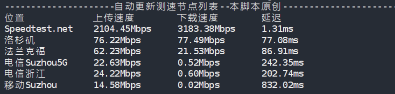 iperf3 Network Speed Tests (IPv4): --------------------------------- Provider | Location (Link) | Send Speed | Recv Speed | Ping ----- | ----- | ---- | ---- | ---- Clouvider | London, UK (10G) | 1.88 Gbits/sec | 1.44 Gbits/sec | 73.8 ms Eranium | Amsterdam, NL (100G) | 1.75 Gbits/sec | 1.32 Gbits/sec | 76.2 ms Uztelecom | Tashkent, UZ (10G) | busy | 392 Mbits/sec | 146 ms Leaseweb | Singapore, SG (10G) | 451 Mbits/sec | 385 Mbits/sec | 245 ms Clouvider | Los Angeles, CA, US (10G) | 2.04 Gbits/sec | 1.46 Gbits/sec | 61.0 ms Leaseweb | NYC, NY, US (10G) | 9.33 Gbits/sec | 9.27 Gbits/sec | 1.59 ms Edgoo | Sao Paulo, BR (1G) | 1.15 Gbits/sec | 897 Mbits/sec | 110 ms iperf3 Network Speed Tests (IPv6): --------------------------------- Provider | Location (Link) | Send Speed | Recv Speed | Ping ----- | ----- | ---- | ---- | ---- Clouvider | London, UK (10G) | 1.85 Gbits/sec | 1.38 Gbits/sec | 73.8 ms Eranium | Amsterdam, NL (100G) | 1.75 Gbits/sec | 1.32 Gbits/sec | 76.2 ms Uztelecom | Tashkent, UZ (10G) | 821 Mbits/sec | 651 Mbits/sec | 146 ms Leaseweb | Singapore, SG (10G) | 441 Mbits/sec | 362 Mbits/sec | 245 ms Clouvider | Los Angeles, CA, US (10G) | 2.23 Gbits/sec | 1.70 Gbits/sec | 61.0 ms Leaseweb | NYC, NY, US (10G) | 9.24 Gbits/sec | 9.11 Gbits/sec | 1.60 ms Edgoo | Sao Paulo, BR (1G) | 1.14 Gbits/sec | 906 Mbits/sec | 110 ms