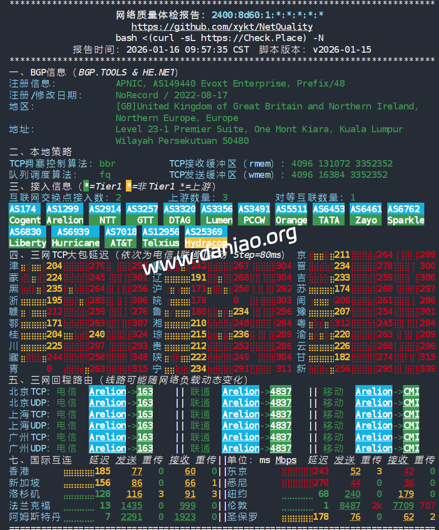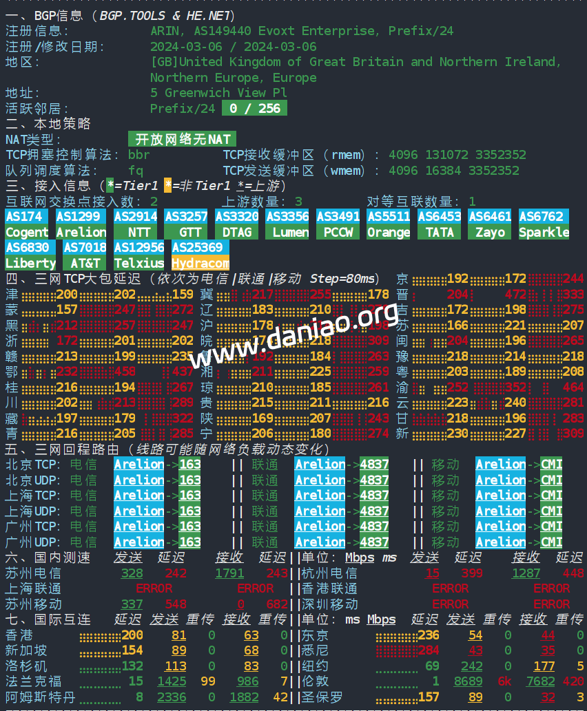 网络质量体检报告:2400:8d60:1:*:*:*:*:* 五、三网回程路由(线路可能随网络负载动态变化) 北京 电信 Arelion -> 163 地理路径:英国 -> 荷兰 -> 北京 自治系统路径:AS149440 -> AS25369 -> AS1299 -> AS4134 -> AS23724 1 0.47ms 2400:8d60:1:*:*:*:*:* AS149440 英国 英格兰 伦敦 evoxt.com 2-3 0.47ms 2a01:4020:0:*:*:*:*:* AS25369 英国 英格兰 布里斯托尔 bandwidth.co.uk 4-5 1.14ms 2001:2035:0:*:*:*:*:* AS1299 英国 英格兰 伦敦 arelion.com 6-7 8.67ms 2001:2034:1:*:*:*:*:* AS1299 荷兰 北荷兰省 阿姆斯特丹 arelion.com 9-11 132.53ms 240e:0:a:*:*:*:*:* AS4134 中国 北京 chinatelecom.com.cn 电信 12-14 247.26ms 240e:0:9000:*:*:*:*:* AS23724 中国 北京市 bjtelecom.net 电信 16 244.15ms 240e:904:800:*:*:*:*:* AS23724 中国 北京市 bjtelecom.net 电信 北京 联通 Arelion -> 4837 地理路径:英国 -> 法国 -> 德国 -> 北京 自治系统路径:AS149440 -> AS25369 -> AS1299 -> AS4837 -> AS4808 1 3.80ms 2400:8d60:1:*:*:*:*:* AS149440 英国 英格兰 伦敦 evoxt.com 2-3 0.42ms 2a01:4020:0:*:*:*:*:* AS25369 英国 英格兰 布里斯托尔 bandwidth.co.uk 4-5 0.93ms 2001:2035:0:*:*:*:*:* AS1299 英国 英格兰 伦敦 arelion.com 6 7.08ms 2001:2034:1:*:*:*:*:* AS1299 法国 法兰西岛大区 巴黎 arelion.com 7 16.08ms 2001:2034:1:*:*:*:*:* AS1299 德国 黑森州 美因河畔法兰克福 arelion.com 8-9 16.69ms 2408:8000:3:*:*:*:*:* AS4837 德国 黑森 美因河畔法兰克福 chinaunicom.cn 联通 10 251.06ms 2408:8000:2:*:*:*:*:* AS4837 中国 chinaunicom.cn 联通 11 277.62ms 2408:8000:2:*:*:*:*:* AS4837 中国 北京 chinaunicom.cn 联通 12 223.65ms 2408:8000:2:*:*:*:*:* AS4837 中国 广东 广州 chinaunicom.cn 联通 13-15 234.79ms 2408:8000:1100:*:*:*:*:* AS4808 中国 北京 www.bbn.com.cn 联通 16 213.72ms 2408:8706:0:*:*:*:*:* AS4808 中国 北京市 www.bbn.com.cn 联通 北京 移动 Arelion -> CMI 地理路径:英国 -> 香港 -> 上海 -> 北京 自治系统路径:AS149440 -> AS25369 -> AS1299 -> AS58453 -> AS9808 1 0.64ms 2400:8d60:1:*:*:*:*:* AS149440 英国 英格兰 伦敦 evoxt.com 2-3 0.55ms 2a01:4020:0:*:*:*:*:* AS25369 英国 英格兰 布里斯托尔 bandwidth.co.uk 4-6 1.17ms 2001:2035:0:*:*:*:*:* AS1299 英国 英格兰 伦敦 arelion.com 8 135.55ms 2402:4f00:2000:*:*:*:*:* AS58453 中国 香港 cmi.chinamobile.com 移动 9 290.44ms 2402:4f00:2000:*:*:*:*:* AS58453 中国 上海 cmi.chinamobile.com 移动 10-13 287.86ms 2409:8080:0:*:*:*:*:* AS9808 中国 上海 chinamobileltd.com 移动 14-16 299.62ms 2409:8080:0:*:*:*:*:* AS9808 中国 北京 chinamobileltd.com 移动 17 290.53ms 2409:8c00:7821:*:*:*:*:* AS9808 中国 北京市 chinamobileltd.com 移动 上海 电信 Arelion -> 163 地理路径:英国 -> 荷兰 -> 欧洲 -> 上海 自治系统路径:AS149440 -> AS25369 -> AS1299 -> AS4134 -> AS4812 1 0.74ms 2400:8d60:1:*:*:*:*:* AS149440 英国 英格兰 伦敦 evoxt.com 2-3 0.55ms 2a01:4020:0:*:*:*:*:* AS25369 英国 英格兰 布里斯托尔 bandwidth.co.uk 4-5 0.93ms 2001:2035:0:*:*:*:*:* AS1299 英国 英格兰 伦敦 arelion.com 6-7 8.31ms 2001:2034:1:*:*:*:*:* AS1299 荷兰 北荷兰省 阿姆斯特丹 arelion.com 8 9.59ms 2001:2035:0:*:*:*:*:* AS1299 欧洲 arelion.com 9-10 166.72ms 240e:0:a:*:*:*:*:* AS4134 中国 chinatelecom.com.cn 电信 11 169.74ms 240e::f:*:*:*:*:* AS4134 中国 上海 chinatelecom.com.cn 电信 12-15 172.38ms 240e:18:10:*:*:*:*:* AS4812 中国 上海 chinatelecom.cn 16 183.83ms 240e:96c:6000:*:*:*:*:* AS4812 中国 上海市 chinatelecom.cn 电信 上海 联通 Arelion -> 4837 地理路径:英国 -> 法国 -> 德国 -> 北京 -> 江苏 自治系统路径:AS149440 -> AS25369 -> AS1299 -> AS4837 1 0.64ms 2400:8d60:1:*:*:*:*:* AS149440 英国 英格兰 伦敦 evoxt.com 2-3 0.54ms 2a01:4020:0:*:*:*:*:* AS25369 英国 英格兰 布里斯托尔 bandwidth.co.uk 4-5 0.94ms 2001:2035:0:*:*:*:*:* AS1299 英国 英格兰 伦敦 arelion.com 6-7 11.21ms 2001:2034:1:*:*:*:*:* AS1299 法国 法兰西岛大区 巴黎 arelion.com 8-9 16.04ms 2408:8000:3:*:*:*:*:* AS4837 德国 黑森 美因河畔法兰克福 chinaunicom.cn 联通 10-11 240.56ms 2408:8000:2:*:*:*:*:* AS4837 中国 北京 chinaunicom.cn 联通 13-15 272.12ms 2408:8000:2:*:*:*:*:* AS4837 中国 江苏 南京 广东→江苏 chinaunicom.cn 联通 17 262.50ms 2408:873c:6810:*:*:*:*:* AS4837 中国 江苏省 泰州市 chinaunicom.cn 联通 上海 移动 Arelion -> CMI 地理路径:英国 -> 上海 自治系统路径:AS149440 -> AS25369 -> AS1299 -> AS58453 -> AS9808 1 0.81ms 2400:8d60:1:*:*:*:*:* AS149440 英国 英格兰 伦敦 evoxt.com 2-3 0.87ms 2a01:4020:0:*:*:*:*:* AS25369 英国 英格兰 布里斯托尔 bandwidth.co.uk 4-6 0.81ms 2001:2035:0:*:*:*:*:* AS1299 英国 英格兰 伦敦 arelion.com 10 286.82ms 2402:4f00:2000:*:*:*:*:* AS58453 中国 上海 cmi.chinamobile.com 移动 11-15 288.58ms 2409:8080:0:*:*:*:*:* AS9808 中国 上海 chinamobileltd.com 移动 18 293.23ms 2409:8c1e:68e0:*:*:*:*:* AS9808 中国 上海市 chinamobileltd.com 移动 广东 电信 Arelion -> 163 地理路径:英国 -> 荷兰 -> 广东 自治系统路径:AS149440 -> AS25369 -> AS1299 -> AS4134 -> AS4816 1 17.84ms 2400:8d60:1:*:*:*:*:* AS149440 英国 英格兰 伦敦 evoxt.com 2-3 8.00ms 2a01:4020:0:*:*:*:*:* AS25369 英国 英格兰 布里斯托尔 bandwidth.co.uk 4-5 1.01ms 2001:2035:0:*:*:*:*:* AS1299 英国 英格兰 伦敦 arelion.com 6-7 8.71ms 2001:2034:1:*:*:*:*:* AS1299 荷兰 北荷兰省 阿姆斯特丹 arelion.com 9-10 210.85ms 240e:0:a:*:*:*:*:* AS4134 中国 chinatelecom.com.cn 电信 11 200.15ms 240e:0:a:*:*:*:*:* AS4134 中国 广东 广州 chinatelecom.com.cn 电信 12-13 204.00ms 240e:1f:6000:*:*:*:*:* AS4816 中国 广东 深圳 电信 16 208.12ms 240e:97c:4008:*:*:*:*:* AS4816 中国 广东省 深圳市 电信 广东 联通 Arelion -> 4837 地理路径:英国 -> 法国 -> 德国 -> 广东 自治系统路径:AS149440 -> AS25369 -> AS1299 -> AS4837 -> AS135061 -> AS17623 -> AS135061 1 0.58ms 2400:8d60:1:*:*:*:*: