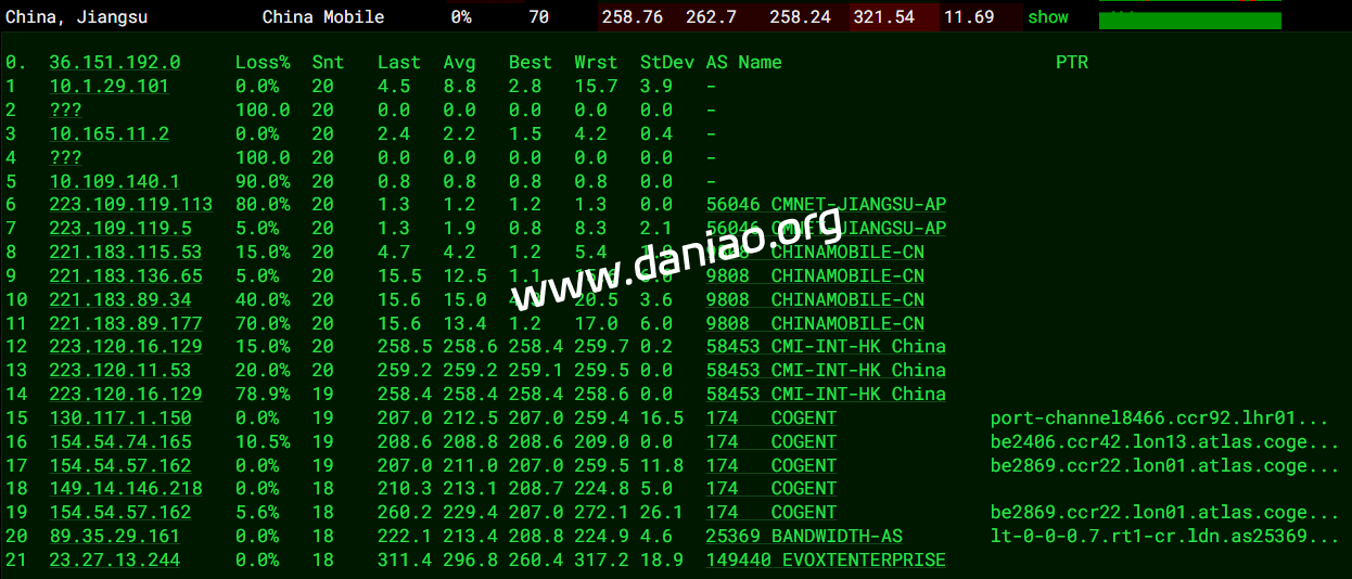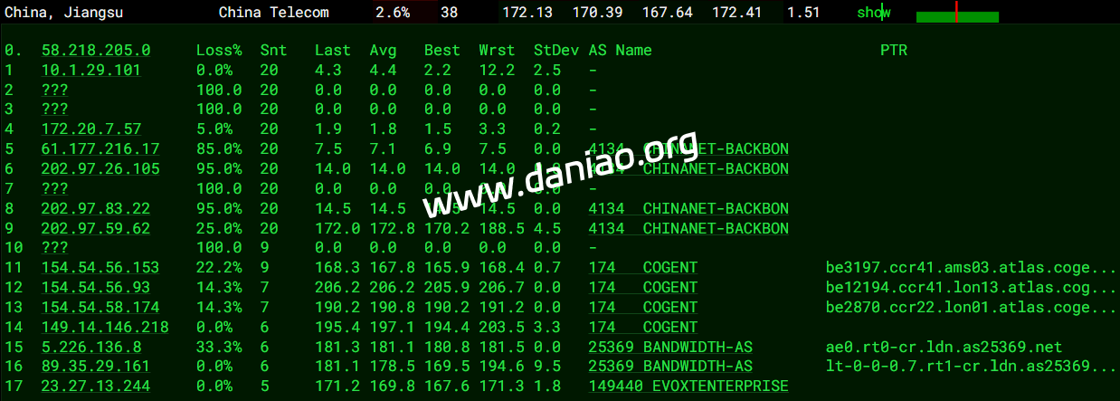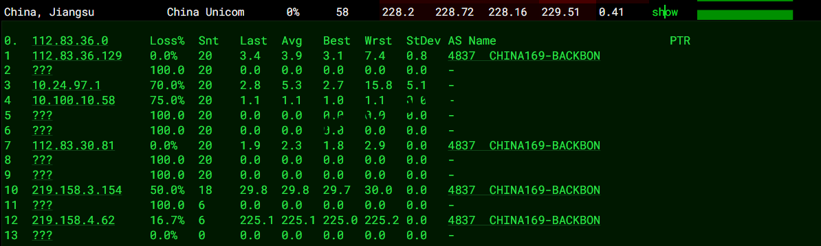 北京 电信 Arelion -> 163 地理路径:英国 -> 荷兰 -> 北京 自治系统路径:AS25369 -> AS1299 -> AS4134 -> AS4847 1-3 0.92ms 5.226.*.* AS25369 英国 英格兰 伦敦 bandwidth.co.uk 4-5 1.17ms 62.115.*.* AS1299 [ARELION-NET] 英国 英格兰 伦敦 arelion.com 6-7 7.12ms 62.115.*.* AS1299 [ARELION-NET] 荷兰 北荷兰省 阿姆斯特丹 arelion.com 8 8.48ms 62.115.*.* AS1299 [ARELION-NET] 荷兰 弗莱福兰省 莱利斯塔德 arelion.com 9-11 200.46ms 202.97.*.* AS4134 [CHINANET-BB] 中国 北京 chinatelecom.com.cn 电信 13 155.72ms 36.112.*.* AS4847 中国 北京 bj.189.cn 14-15 164.56ms 219.141.*.* AS4847 [CHINATELECOM-BJ] 中国 北京 bj.189.cn 16 247.06ms 106.37.*.* AS4847 [CHINANET-HN] 中国 北京 bj.189.cn 北京 联通 Arelion -> 4837 地理路径:英国 -> 法国 -> 德国 -> 广东 -> 北京 自治系统路径:AS25369 -> AS1299 -> AS4837 -> AS4808 1-3 0.33ms 5.226.*.* AS25369 英国 英格兰 伦敦 bandwidth.co.uk 4-5 0.83ms 62.115.*.* AS1299 [ARELION-NET] 英国 英格兰 伦敦 arelion.com 6 8.02ms 62.115.*.* AS1299 [ARELION-NET] 法国 法兰西岛大区 巴黎 arelion.com 7-9 16.09ms 62.115.*.* AS1299 [ARELION-NET] 德国 黑森州 美因河畔法兰克福 arelion.com 10-12 188.96ms 219.158.*.* AS4837 [CU169-BACKBONE] 中国 广东 广州 chinaunicom.cn 联通 13-14 204.88ms 124.64.*.* AS4808 [UNICOM-BJ] 中国 北京 北京 www.bbn.com.cn 18 195.51ms 221.222.*.* AS4808 [UNICOM-BJ] 中国 北京 海淀 www.bbn.com.cn 北京 移动 Arelion -> CMI 地理路径:英国 -> 美国 -> 北京 自治系统路径:AS25369 -> AS1299 -> AS58453 -> AS9808 -> AS56048 1-3 0.36ms 5.226.*.* AS25369 英国 英格兰 伦敦 bandwidth.co.uk 4-5 0.87ms 62.115.*.* AS1299 [ARELION-NET] 英国 英格兰 伦敦 arelion.com 6 69.99ms 62.115.*.* AS1299 [ARELION-NET] 美国 纽约 纽约 arelion.com 7 134.06ms 62.115.*.* AS1299 [ARELION-NET] 美国 伊利诺伊 芝加哥 arelion.com 9-12 140.39ms 62.115.*.* AS1299 [ARELION-NET] 美国 加利福尼亚 圣何塞 arelion.com 13-14 241.28ms 223.120.*.* AS58453 [CMI-INT] 中国 北京 cmi.chinamobile.com 移动 15-16 241.41ms 221.183.*.* AS9808 [CMNET] 中国 北京 I-C chinamobileltd.com 移动 19-22 244.48ms 211.136.*.* AS56048 [CMNET] 中国 北京 bj.10086.cn 移动 23 244.04ms 211.136.*.* AS56048 [CMNET] 中国 北京 bj.10086.cn 移动 上海 电信 Arelion -> 163 地理路径:英国 -> 荷兰 -> 上海 自治系统路径:AS25369 -> AS1299 -> AS4134 -> AS4812 1-3 0.54ms 5.226.*.* AS25369 英国 英格兰 伦敦 bandwidth.co.uk 4-5 1.10ms 62.115.*.* AS1299 [ARELION-NET] 英国 英格兰 伦敦 arelion.com 6-7 7.32ms 62.115.*.* AS1299 [ARELION-NET] 荷兰 北荷兰省 阿姆斯特丹 arelion.com 8 8.89ms 62.115.*.* AS1299 [ARELION-NET] 荷兰 弗莱福兰省 莱利斯塔德 arelion.com 9 7.61ms 202.97.*.* AS4134 [CHINANET-BB] 荷兰 北荷兰省 阿姆斯特丹 chinatelecom.com.cn 电信 10-12 170.31ms 202.97.*.* AS4134 [CHINANET-BB] 中国 上海 chinatelecom.com.cn 电信 13 206.75ms 101.95.*.* AS4812 [CHINANET-SH] 中国 上海 chinatelecom.cn 电信 18 171.76ms 101.226.*.* AS4812 [CHINANET-SH] 中国 上海市 chinatelecom.cn 电信 上海 联通 Arelion -> 4837 地理路径:英国 -> 法国 -> 德国 -> 广东 -> 北京 -> 上海 自治系统路径:AS25369 -> AS1299 -> AS4837 -> AS140979 1-3 0.86ms 5.226.*.* AS25369 英国 英格兰 伦敦 bandwidth.co.uk 4-5 1.11ms 62.115.*.* AS1299 [ARELION-NET] 英国 英格兰 伦敦 arelion.com 6 7.68ms 62.115.*.* AS1299 [ARELION-NET] 法国 法兰西岛大区 巴黎 arelion.com 7-8 15.95ms 62.115.*.* AS1299 [ARELION-NET] 德国 黑森州 美因河畔法兰克福 arelion.com 9-10 23.37ms 219.158.*.* AS4837 [CU169-BACKBONE] 德国 黑森 美因河畔法兰克福 chinaunicom.cn 11 192.40ms 219.158.*.* AS4837 [CU169-BACKBONE] 中国 广东 广州 chinaunicom.cn 联通 12 185.31ms 219.158.*.* AS4837 [CU169-BACKBONE] 中国 北京 chinaunicom.cn 联通 20 168.46ms 112.64.*.* AS140979 [APNIC-AP] 中国 上海市 闵行 chinaunicom.cn 联通 上海 移动 Arelion -> CMI 地理路径:英国 -> 香港 -> 上海 自治系统路径:AS25369 -> AS1299 -> AS58453 -> AS9808 1-3 14.11ms 5.226.*.* AS25369 英国 英格兰 伦敦 bandwidth.co.uk 4-7 1.27ms 62.115.*.* AS1299 [ARELION-NET] 英国 英格兰 伦敦 arelion.com 8 2.45ms 223.120.*.* AS58453 [CMI-INT] 英国 英格兰 伦敦 cmi.chinamobile.com 移动 9 194.23ms 223.120.*.* AS58453 [CMI-INT] 中国 香港 cmi.chinamobile.com 移动 10-12 246.09ms 221.183.*.* AS9808 [CMNET] 中国 上海 X-I chinamobileltd.com 移动 16 198.05ms 117.185.*.* AS9808 [CMNET] 中国 上海市 chinamobileltd.com 移动 广东 电信 Arelion -> 163 地理路径:英国 -> 荷兰 -> 河南 -> 广东 自治系统路径:AS25369 -> AS1299 -> AS4134 1-3 0.57ms 5.226.*.* AS25369 英国 英格兰 伦敦 bandwidth.co.uk 4-5 0.93ms 62.115.*.* AS1299 [ARELION-NET] 英国 英格兰 伦敦 arelion.com 6-7 7.45ms 62.115.*.* AS1299 [ARELION-NET] 荷兰 北荷兰省 阿姆斯特丹 arelion.com 8 7.44ms 62.115.*.* AS1299 [ARELION-NET] 荷兰 弗莱福兰省 莱利斯塔德 arelion.com 9 203.09ms 202.97.*.* AS4134 [CHINANET-BB] 中国 河南省 郑州市 chinatelecom.com.cn 10-11 203.07ms 202.97.*.* AS4134 [CHINANET-BB] 中国 广东 广州 chinatelecom.com.cn 电信 18 208.65ms 183.47.*.* AS4134 [APNIC-AP] 中国 广东省 广州市 chinatelecom.com.cn 电信 广东 联通 Arelion -> 4837 地理路径:英国 -> 法国 -> 德国 -> 北京 -> 广东 自治系统路径:AS25369 -> AS1299 -> AS4837 -> AS17816 -> AS136958 1-3 16.18ms 5.226.*.* AS25369 英国 英格兰 伦敦 bandwidth.co.uk 4-5 1.15ms 62.115.*.* AS1299 [ARELION-NET] 英国 英格兰 伦敦 arelion.com 6 7.45ms 62.115.*.* AS1299 [ARELION-NET] 法国 法兰西岛大区 巴黎 arelion.com 7-8 16.29ms 62.115.*.* AS1299 [ARELION-NET] 德国 黑森州 美因河畔法兰克福 arelion.com 9 15.97ms 219.158.*.* AS4837 [CU169-BACKBONE] 德国 黑森 美因河畔法兰克福 chinaunicom.cn 联通 10-12 188.51ms 219.158.*.* AS4837 [CU169-