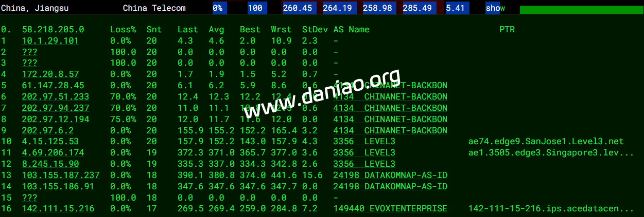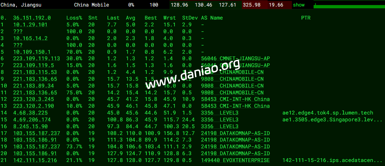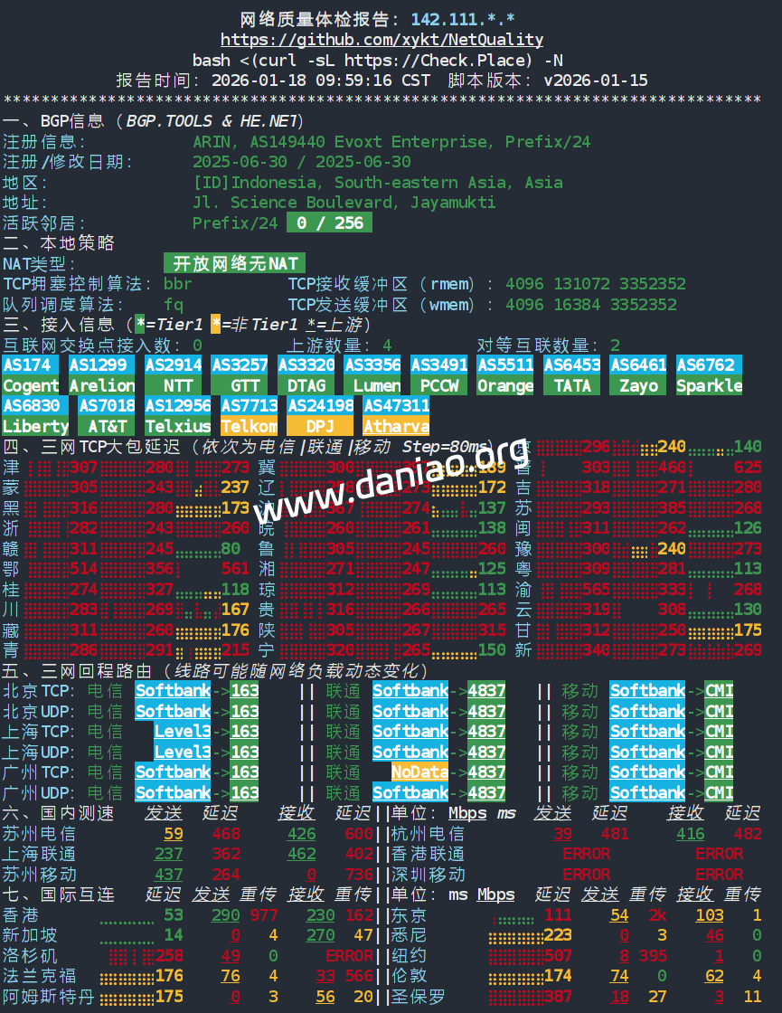 五、三网回程路由(线路可能随网络负载动态变化) 北京 电信 Softbank -> 163 地理路径:马来西亚 -> 上海 -> 北京 自治系统路径:AS149440 -> AS17676 -> AS4134 -> AS4847 1 0.18ms 142.111.*.* AS149440 马来西亚 吉隆坡联邦直辖区 吉隆坡 evoxt.com 14 278.32ms 221.111.*.* AS17676 [BBTEC] 中国 上海 softbank.jp 15-16 285.22ms 202.97.*.* AS4134 [CHINANET-BB] 中国 上海 chinatelecom.com.cn 电信 17 298.73ms 202.97.*.* AS4134 [CHINANET-BB] 中国 北京 chinatelecom.com.cn 电信 19 309.09ms 36.112.*.* AS4847 中国 北京 bj.189.cn 20-21 376.70ms 219.141.*.* AS4847 [CHINATELECOM-BJ] 中国 北京 bj.189.cn 22 299.69ms 106.37.*.* AS4847 [CHINANET-HN] 中国 北京 bj.189.cn 北京 联通 AS149440 -> 4837 地理路径:马来西亚 -> 北京 自治系统路径:AS149440 -> AS4837 -> AS4808 1 0.17ms 142.111.*.* AS149440 马来西亚 吉隆坡联邦直辖区 吉隆坡 evoxt.com 15 233.66ms 219.158.*.* AS4837 [CU169-BACKBONE] 中国 北京 chinaunicom.cn 18 237.61ms 61.51.*.* AS4808 中国 北京市 延庆 www.bbn.com.cn 联通 22 271.12ms 221.222.*.* AS4808 [UNICOM-BJ] 中国 北京 海淀 www.bbn.com.cn 北京 移动 Softbank -> CMI 地理路径:马来西亚 -> 日本 -> 北京 自治系统路径:AS149440 -> AS17676 -> AS58453 -> AS9808 -> AS56048 1 0.20ms 142.111.*.* AS149440 马来西亚 吉隆坡联邦直辖区 吉隆坡 evoxt.com 14 84.57ms 221.111.*.* AS17676 [BBTEC] 日本 东京都 东京 softbank.jp 15 276.94ms 223.120.*.* AS58453 [CMI-INT] 中国 北京 cmi.chinamobile.com 移动 16-17 136.79ms 221.183.*.* AS9808 [CMNET] 中国 北京 X-I chinamobileltd.com 移动 20-22 139.37ms 211.136.*.* AS56048 [CMNET] 中国 北京 bj.10086.cn 移动 25 139.41ms 211.136.*.* AS56048 [CMNET] 中国 北京 bj.10086.cn 移动 上海 电信 Level3 -> 163 地理路径:马来西亚 -> 印度尼西亚 -> 新加坡 -> 英国 -> 上海 自治系统路径:AS149440 -> AS24198 -> AS3356 -> AS4134 -> AS4812 1 0.17ms 142.111.*.* AS149440 马来西亚 吉隆坡联邦直辖区 吉隆坡 evoxt.com 2 0.37ms 10.87.*.* * RFC1918 3 0.52ms 103.155.*.* AS24198 印度尼西亚 雅加达 datakom.id 4 12.43ms 103.155.*.* AS24198 印度尼西亚 廖内群岛 巴淡岛 datakom.id 5 12.35ms 8.245.*.* AS3356 新加坡 lumen.com 7 258.59ms 212.133.*.* AS3356 英国 lumen.com 8-10 364.33ms 202.97.*.* AS4134 [CHINANET-BB] 中国 上海 chinatelecom.com.cn 电信 11 368.26ms 101.95.*.* AS4812 [CHINANET-SH] 中国 上海 chinatelecom.cn 电信 17 366.51ms 101.226.*.* AS4812 [CHINANET-SH] 中国 上海市 chinatelecom.cn 电信 上海 联通 Softbank -> 4837 地理路径:马来西亚 -> 北京 -> 上海 自治系统路径:AS149440 -> AS17676 -> AS4837 -> AS140979 1 0.19ms 142.111.*.* AS149440 马来西亚 吉隆坡联邦直辖区 吉隆坡 evoxt.com 14 234.09ms 221.111.*.* AS17676 [BBTEC] 中国 北京 BBTEC-CU-Peer softbank.jp 15-16 268.50ms 219.158.*.* AS4837 [CU169-BACKBONE] 中国 北京 chinaunicom.cn 联通 24 257.10ms 58.246.*.* AS140979 中国 上海市 chinaunicom.cn 联通 上海 移动 Softbank -> CMI 地理路径:马来西亚 -> 日本 -> 上海 自治系统路径:AS149440 -> AS17676 -> AS58453 -> AS9808 1 0.33ms 142.111.*.* AS149440 马来西亚 吉隆坡联邦直辖区 吉隆坡 evoxt.com 14 85.08ms 221.111.*.* AS17676 [BBTEC] 日本 东京都 东京 softbank.jp 15 124.74ms 223.120.*.* AS58453 [CMI-INT] 日本 东京都 东京 cmi.chinamobile.com 移动 16-18 116.36ms 221.183.*.* AS9808 [CMNET] 中国 上海 X-I chinamobileltd.com 移动 23 121.34ms 117.185.*.* AS9808 [CMNET] 中国 上海市 chinamobileltd.com 移动 广东 电信 Softbank -> 163 地理路径:马来西亚 -> 上海 -> 广东 自治系统路径:AS149440 -> AS17676 -> AS4134 1 2.71ms 142.111.*.* AS149440 马来西亚 吉隆坡联邦直辖区 吉隆坡 evoxt.com 14 275.26ms 221.111.*.* AS17676 [BBTEC] 中国 上海 softbank.jp 16 287.47ms 202.97.*.* AS4134 [CHINANET-BB] 中国 上海 chinatelecom.com.cn 电信 17 298.59ms 202.97.*.* AS4134 [CHINANET-BB] 中国 广东 广州 chinatelecom.com.cn 电信 24 317.88ms 183.47.*.* AS4134 [APNIC-AP] 中国 广东省 广州市 chinatelecom.com.cn 电信 广东 联通 Softbank -> 4837 地理路径:马来西亚 -> 北京 -> 广东 自治系统路径:AS149440 -> AS17676 -> AS4837 -> AS17816 -> AS136958 1 0.41ms 142.111.*.* AS149440 马来西亚 吉隆坡联邦直辖区 吉隆坡 evoxt.com 14 233.81ms 221.111.*.* AS17676 [BBTEC] 中国 北京 BBTEC-CU-Peer softbank.jp 15 255.13ms 219.158.*.* AS4837 [CU169-BACKBONE] 中国 北京 chinaunicom.cn 联通 17 320.56ms 219.158.*.* AS4837 [CU169-BACKBONE] 中国 广东 广州 chinaunicom.cn 联通 18 307.81ms 120.81.*.* AS17816 [APNIC-AP] 中国 广东 广州 China Unicom IP network China169 Guangdong province 24 299.95ms 157.148.*.* AS136958 [UNICOM-GD] 中国 广东省 广州市 chinaunicom.cn 联通 广东 移动 AS149440 -> CMI 地理路径:马来西亚 -> 广东 自治系统路径:AS149440 -> AS58453 -> AS9808 -> AS56040 1 0.24ms 142.111.*.* AS149440 马来西亚 吉隆坡联邦直辖区 吉隆坡 evoxt.com 16 250.23ms 223.120.*.* AS58453 [CMI-INT] 中国 广东 广州 cmi.chinamobile.com 移动 17-20 98.36ms 221.183.*.* AS9808 [CMNET] 中国 广东 广州 X-I chinamobileltd.com 移动 21-24 110.53ms 183.235.*.* AS56040 [APNIC-AP] 中国 广东 广州 gd.10086.cn 移动 27 156.75ms 211.139.*.* AS56040 [CMNET] 中国 广东 广州 gd.10086.cn 移动