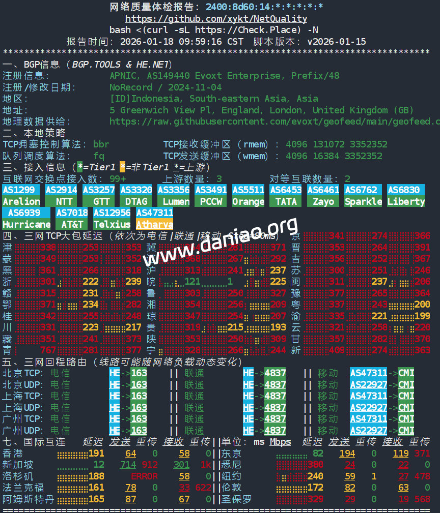 五、三网回程路由(线路可能随网络负载动态变化) 北京 电信 HE -> 163 地理路径:马来西亚 -> 印度尼西亚 -> 法国 -> 上海 -> 北京 自治系统路径:AS149440 -> AS47311 -> AS6939 -> AS4134 -> AS23724 1 0.19ms 2400:8d60:14:*:*:*:*:* AS149440 马来西亚 evoxt.com 2 0.38ms 2a06:9f44:f170:*:*:*:*:* AS47311 印度尼西亚 雅加达 byod.id 7-8 156.01ms 2001:470:0:*:*:*:*:* AS6939 法国 法兰西岛大区 巴黎 he.net 9 314.50ms 240e:0:a:*:*:*:*:* AS4134 中国 chinatelecom.com.cn 电信 10-11 324.42ms 240e:0:a:*:*:*:*:* AS4134 中国 上海 chinatelecom.com.cn 电信 12 339.62ms 240e::1:*:*:*:*:* AS4134 中国 北京 chinatelecom.com.cn 电信 13-15 339.06ms 240e:0:9000:*:*:*:*:* AS23724 中国 北京市 bjtelecom.net 电信 17 339.24ms 240e:904:800:*:*:*:*:* AS23724 中国 北京市 bjtelecom.net 电信 北京 联通 HE -> 4837 地理路径:马来西亚 -> 印度尼西亚 -> 德国 -> 广东 -> 北京 自治系统路径:AS149440 -> AS47311 -> AS6939 -> AS4837 -> AS4808 1 0.21ms 2400:8d60:14:*:*:*:*:* AS149440 马来西亚 evoxt.com 2 0.52ms 2a06:9f44:f170:*:*:*:*:* AS47311 印度尼西亚 雅加达 byod.id 7 212.86ms 2001:470:0:*:*:*:*:* AS6939 德国 黑森 美因河畔法兰克福 he.net 8-10 212.65ms 2408:8000:2:*:*:*:*:* AS4837 中国 广东 广州 chinaunicom.cn 联通 11 273.59ms 2408:8000:2:*:*:*:*:* AS4837 中国 北京 chinaunicom.cn 联通 12-13 274.92ms 2408:8000:1100:*:*:*:*:* AS4808 中国 北京 www.bbn.com.cn 联通 15 268.41ms 2408:8706:0:*:*:*:*:* AS4808 中国 北京市 www.bbn.com.cn 联通 北京 移动 AS47311 -> CMI 地理路径:马来西亚 -> 印度尼西亚 -> 法国 -> 德国 -> 香港 -> 上海 -> 北京 自治系统路径:AS149440 -> AS47311 -> AS58453 -> AS9808 1 0.28ms 2400:8d60:14:*:*:*:*:* AS149440 马来西亚 evoxt.com 2 0.64ms 2a06:9f44:f170:*:*:*:*:* AS47311 印度尼西亚 雅加达 byod.id 7 166.05ms 2001:7f8:54:*:*:*:*:* AS58453 法国 法兰西岛大区 巴黎 France-IX Paris - China Mobile International - 20Gbps cmi.chinamobile.com 8 164.31ms 2402:4f00:2000:*:*:*:*:* AS58453 德国 黑森 美因河畔法兰克福 cmi.chinamobile.com 9-10 172.54ms 2402:4f00:2000:*:*:*:*:* AS58453 中国 香港 cmi.chinamobile.com 11-14 200.52ms 2409:8080:0:*:*:*:*:* AS9808 中国 上海 chinamobileltd.com 移动 15-17 336.93ms 2409:8080:0:*:*:*:*:* AS9808 中国 北京 chinamobileltd.com 移动 18 338.63ms 2409:8c00:7821:*:*:*:*:* AS9808 中国 北京市 chinamobileltd.com 移动 上海 电信 HE -> 163 地理路径:马来西亚 -> 印度尼西亚 -> 法国 -> 上海 自治系统路径:AS149440 -> AS47311 -> AS6939 -> AS4134 -> AS4812 1 0.23ms 2400:8d60:14:*:*:*:*:* AS149440 马来西亚 evoxt.com 2 0.43ms 2a06:9f44:f170:*:*:*:*:* AS47311 印度尼西亚 雅加达 byod.id 7 156.84ms 2001:470:0:*:*:*:*:* AS6939 法国 法兰西岛大区 巴黎 he.net 9 314.55ms 240e:0:a:*:*:*:*:* AS4134 中国 chinatelecom.com.cn 电信 10-11 324.28ms 240e:2:a:*:*:*:*:* AS4134 中国 上海 chinatelecom.com.cn 电信 12-14 345.42ms 240e:18:10:*:*:*:*:* AS4812 中国 上海 chinatelecom.cn 16 323.62ms 240e:96c:6000:*:*:*:*:* AS4812 中国 上海市 chinatelecom.cn 电信 上海 联通 HE -> 4837 地理路径:马来西亚 -> 印度尼西亚 -> 德国 -> 广东 -> 江苏 自治系统路径:AS149440 -> AS47311 -> AS6939 -> AS4837 1 0.28ms 2400:8d60:14:*:*:*:*:* AS149440 马来西亚 evoxt.com 2 0.93ms 2a06:9f44:f170:*:*:*:*:* AS47311 印度尼西亚 雅加达 byod.id 7 213.01ms 2001:470:0:*:*:*:*:* AS6939 德国 黑森 美因河畔法兰克福 he.net 8-10 236.28ms 2408:8000:2:*:*:*:*:* AS4837 中国 广东 广州 chinaunicom.cn 联通 11-13 247.56ms 2408:8000:2:*:*:*:*:* AS4837 中国 江苏 南京 广东-江苏 chinaunicom.cn 联通 15 238.17ms 2408:873c:6810:*:*:*:*:* AS4837 中国 江苏省 泰州市 chinaunicom.cn 联通 上海 移动 AS47311 -> CMI 地理路径:马来西亚 -> 印度尼西亚 -> 德国 -> 香港 -> 上海 自治系统路径:AS149440 -> AS47311 -> AS58453 -> AS9808 1 0.23ms 2400:8d60:14:*:*:*:*:* AS149440 马来西亚 evoxt.com 2 0.79ms 2a06:9f44:f170:*:*:*:*:* AS47311 印度尼西亚 雅加达 byod.id 8-9 165.72ms 2402:4f00:2000:*:*:*:*:* AS58453 德国 黑森 美因河畔法兰克福 cmi.chinamobile.com 10 237.20ms 2402:4f00:2000:*:*:*:*:* AS58453 中国 香港 cmi.chinamobile.com 移动 11-15 237.89ms 2409:8080:0:*:*:*:*:* AS9808 中国 上海 chinamobileltd.com 移动 18 239.26ms 2409:8c1e:68e0:*:*:*:*:* AS9808 中国 上海市 chinamobileltd.com 移动 广东 电信 HE -> 163 地理路径:马来西亚 -> 印度尼西亚 -> 法国 -> 广东 自治系统路径:AS149440 -> AS47311 -> AS6939 -> AS4134 -> AS4816 1 0.34ms 2400:8d60:14:*:*:*:*:* AS149440 马来西亚 evoxt.com 2 0.54ms 2a06:9f44:f170:*:*:*:*:* AS47311 印度尼西亚 雅加达 byod.id 7-8 155.61ms 2001:470:0:*:*:*:*:* AS6939 法国 法兰西岛大区 巴黎 he.net 9 342.30ms 240e:0:a:*:*:*:*:* AS4134 中国 chinatelecom.com.cn 电信 10-11 338.05ms 240e:0:a:*:*:*:*:* AS4134 中国 广东 广州 chinatelecom.com.cn 电信 12-13 340.05ms 240e:1f:6000:*:*:*:*:* AS4816 中国 广东 深圳 电信 16 348.77ms 240e:97c:4008:*:*:*:*:* AS4816 中国 广东省 深圳市 电信 广东 联通 HE -> 4837 地理路径:马来西亚 -> 印度尼西亚 -> 德国 -> 广东 自治系统路径:AS149440 -> AS47311 -> AS6939 -> AS4837 -> AS135061 -> AS17623 -> AS135061 1 0.20ms 2400:8d60:14:*:*:*:*:* AS149440 马来西亚 evoxt.com 2 0.32ms 2a06:9f44:f170:*:*:*:*:* AS47311 印度尼西亚 雅加达 byod.id 7 213.25ms 2001:470:0:*:*:*:*:* AS6939 德国 黑森 美因河畔法兰克福 he.net 8-10 230.29ms 2408:8000:2:*:*:*:*:* AS4837 中国 广东 广州 chinaunicom.cn 联通 11 215.63ms 2408:8001:3171:*:*:*:*:* AS135061 中国 广东 深圳 chinaunicom.cn 联通 12 224.49ms 2408:8001:3071:*:*:*:*:* AS17623 中国 广东 深圳 chinaunicom.cn 14 247.84ms 2408:8756:2cef:*:*:*:*:* AS135061 中国 广东省 深圳市 chinaunicom.cn 联通 广东 移动 AS47311 -> CMI 地理路径:马来西