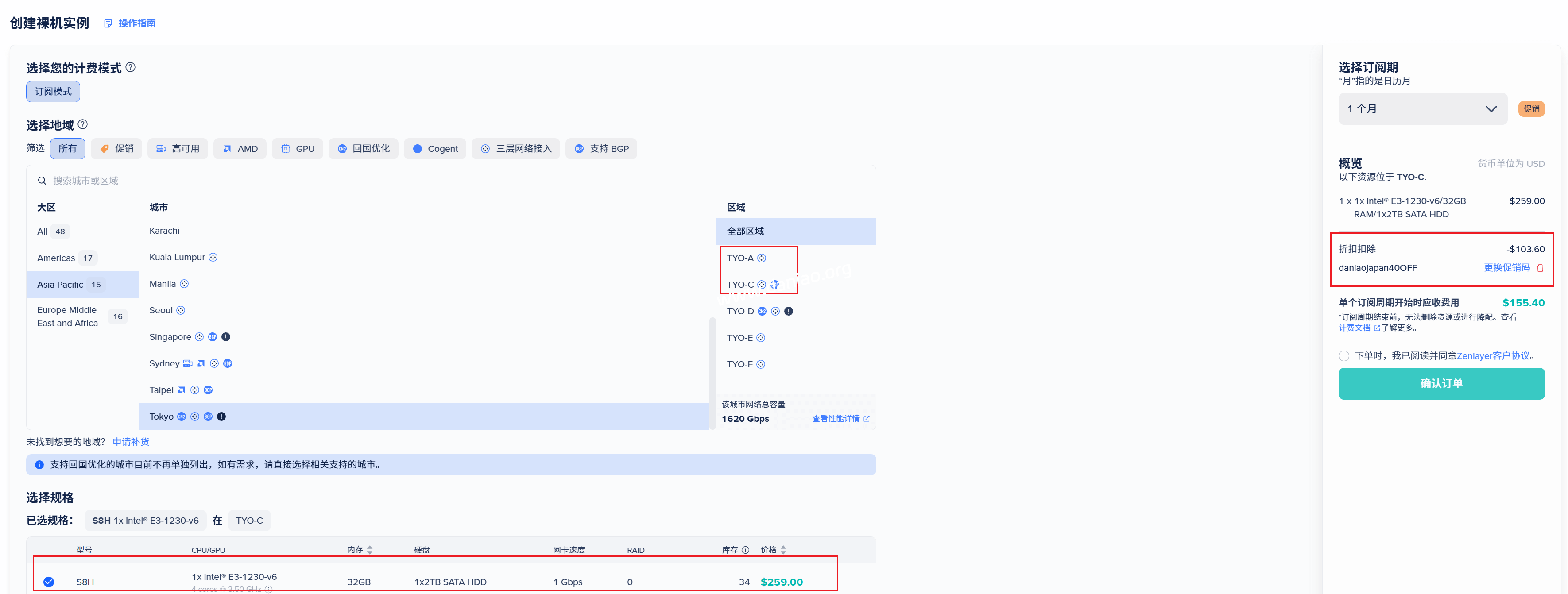 2)选择有优惠的区域,这里是tyo-a和tyo-c的S8H机型有6折优惠