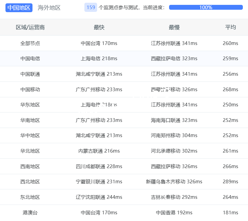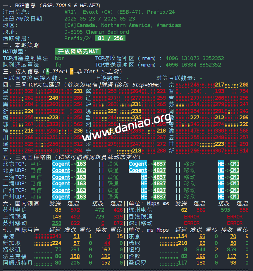 五、三网回程路由(线路可能随网络负载动态变化) 北京 电信 Cogent -> 163 地理路径:加拿大 -> 英国 -> 荷兰 -> 北京 自治系统路径:AS149440 -> AS174 -> AS4134 -> AS4847 1 0.29ms 166.0.*.* AS149440 加拿大 魁北克省 蒙特利尔 evoxt.com 2 0.50ms 10.255.*.* * RFC1918 5-6 1.81ms 154.24.*.* AS174 [COGENT-BONE] 加拿大 魁北克 蒙特利尔 cogentco.com 7 71.50ms 154.54.*.* AS174 [COGENT-BONE] 英国 默西赛德郡 南码头 cogentco.com 8-9 80.90ms 154.54.*.* AS174 [COGENT-BONE] 荷兰 北荷兰省 阿姆斯特丹 cogentco.com 11-13 219.36ms 202.97.*.* AS4134 [CHINANET-BB] 中国 北京 chinatelecom.com.cn 电信 15-17 267.84ms 219.141.*.* AS4847 [CHINATELECOM-BJ] 中国 北京 bj.189.cn 18 268.86ms 106.37.*.* AS4847 [CHINANET-HN] 中国 北京 bj.189.cn 北京 联通 Cogent -> 4837 地理路径:加拿大 -> 美国 -> 北京 自治系统路径:AS174 -> AS4837 -> AS4808 2 0.44ms 10.255.*.* * RFC1918 5-6 1.55ms 154.24.*.* AS174 [COGENT-BONE] 加拿大 魁北克 蒙特利尔 cogentco.com 7 8.73ms 154.54.*.* AS174 [COGENT-BONE] 加拿大 安大略 多伦多 cogentco.com 8 13.45ms 154.54.*.* AS174 [COGENT-BONE] 美国 俄亥俄 克里夫兰 cogentco.com 9 21.18ms 154.54.*.* AS174 [COGENT-BONE] 美国 伊利诺伊州 芝加哥 cogentco.com 10 29.04ms 154.54.*.* AS174 [COGENT-BONE] 美国 内布拉斯加 奥马哈 cogentco.com 11 69.50ms 154.54.*.* AS174 [COGENT-BONE] 美国 科罗拉多 丹佛 cogentco.com 12 50.32ms 154.54.*.* AS174 [COGENT-BONE] 美国 犹他 盐湖城 cogentco.com 13-15 64.63ms 154.54.*.* AS174 [COGENT-BONE] 美国 加利福尼亚 洛杉矶 cogentco.com 16 271.27ms 38.88.*.* AS174 美国 加利福尼亚 洛杉矶 cogentco.com 17-18 289.04ms 219.158.*.* AS4837 [CU169-BACKBONE] 中国 北京 chinaunicom.cn 联通 20 248.34ms 61.49.*.* AS4808 中国 北京 www.bbn.com.cn 联通 21 292.15ms 125.33.*.* AS4808 [UNICOM-BJ] 中国 北京 通州 www.bbn.com.cn 25 249.85ms 221.222.*.* AS4808 [UNICOM-BJ] 中国 北京 海淀 www.bbn.com.cn 北京 移动 HE -> CMI 地理路径:加拿大 -> 美国 -> 北京 自治系统路径:AS6939 -> AS58453 -> AS9808 -> AS56048 2 0.65ms 10.255.*.* * RFC1918 4 1.06ms 216.66.*.* AS6939 [HURRICANE-6] 加拿大 魁北克 蒙特利尔 he.net 5 8.98ms 184.104.*.* AS6939 [HURRICANE-11] 加拿大 安大略 多伦多 he.net 6 18.54ms 184.105.*.* AS6939 [HURRICANE-11] 美国 伊利诺伊 芝加哥 he.net 7 43.76ms 184.105.*.* AS6939 [HURRICANE-11] 加拿大 艾伯塔省 卡尔加里 he.net 8 53.91ms 184.104.*.* AS6939 [HURRICANE-11] 加拿大 不列颠哥伦比亚 温哥华 he.net 9 57.77ms 223.121.*.* AS58453 [CMI-INT] 美国 加利福尼亚 洛杉矶 cmi.chinamobile.com 10-11 71.48ms 223.120.*.* AS58453 [CMI-INT] 美国 华盛顿州 西雅图 cmi.chinamobile.com 移动 12-16 235.04ms 221.183.*.* AS9808 [CMNET] 中国 北京 X-I chinamobileltd.com 移动 17-19 244.20ms 211.136.*.* AS56048 [CMNET] 中国 北京 bj.10086.cn 移动 21 236.94ms 211.136.*.* AS56048 [CMNET] 中国 北京 bj.10086.cn 移动 上海 电信 Cogent -> 163 地理路径:加拿大 -> 英国 -> 荷兰 -> 上海 自治系统路径:AS174 -> AS4134 -> AS4812 2 0.44ms 10.255.*.* * RFC1918 5-6 1.95ms 154.24.*.* AS174 [COGENT-BONE] 加拿大 魁北克 蒙特利尔 cogentco.com 7 71.56ms 154.54.*.* AS174 [COGENT-BONE] 英国 默西赛德郡 南码头 cogentco.com 8-9 80.81ms 154.54.*.* AS174 [COGENT-BONE] 荷兰 北荷兰省 阿姆斯特丹 cogentco.com 11-13 217.17ms 202.97.*.* AS4134 [CHINANET-BB] 中国 上海 X-I chinatelecom.com.cn 电信 14 233.38ms 101.95.*.* AS4812 [CHINANET-SH] 中国 上海 chinatelecom.cn 电信 20 215.67ms 101.226.*.* AS4812 [CHINANET-SH] 中国 上海市 chinatelecom.cn 电信 上海 联通 HE -> 4837 地理路径:加拿大 -> 美国 -> 上海 自治系统路径:AS6939 -> AS4837 -> AS140979 2 0.48ms 10.255.*.* * RFC1918 4 4.90ms 216.66.*.* AS6939 [HURRICANE-6] 加拿大 魁北克 蒙特利尔 he.net 5 8.08ms 184.104.*.* AS6939 [HURRICANE-11] 加拿大 安大略 多伦多 he.net 7-8 70.21ms 184.104.*.* AS6939 [HURRICANE-11] 美国 加利福尼亚州 弗里蒙特 he.net 9 244.61ms 64.71.*.* AS6939 美国 加利福尼亚 圣何塞 he.net 10-11 253.91ms 219.158.*.* AS4837 [CU169-BACKBONE] 中国 上海 chinaunicom.cn 联通 19 211.00ms 112.64.*.* AS140979 [APNIC-AP] 中国 上海市 闵行 chinaunicom.cn 联通 上海 移动 HE -> CMI 地理路径:加拿大 -> 美国 -> 上海 自治系统路径:AS6939 -> AS58453 -> AS9808 2 0.50ms 10.255.*.* * RFC1918 4 0.91ms 216.66.*.* AS6939 [HURRICANE-6] 加拿大 魁北克 蒙特利尔 he.net 5 8.25ms 184.104.*.* AS6939 [HURRICANE-11] 加拿大 安大略 多伦多 he.net 6 29.60ms 184.105.*.* AS6939 [HURRICANE-11] 加拿大 曼尼托巴 温尼伯 he.net 7 31.26ms 184.104.*.* AS6939 [HURRICANE-11] 美国 明尼苏达州 明尼阿波利斯 he.net 8 54.28ms 184.104.*.* AS6939 [HURRICANE-11] 加拿大 不列颠哥伦比亚 温哥华 he.net 9 57.24ms 184.104.*.* AS6939 [HURRICANE-11] 美国 华盛顿 西雅图 he.net 10 57.27ms 223.121.*.* AS58453 [CMI-INT] 美国 加利福尼亚 洛杉矶 cmi.chinamobile.com 11 69.36ms 223.120.*.* AS58453 [CMI-INT] 美国 华盛顿州 西雅图 cmi.chinamobile.com 移动 12-15 256.98ms 221.183.*.* AS9808 [CMNET] 中国 上海 X-I chinamobileltd.com 移动 18 262.68ms 117.185.*.* AS9808 [CMNET] 中国 上海市 chinamobileltd.com 移动 广东 电信 Cogent -> 163 地理路径:加拿大 -> 英国 -> 荷兰 -> 香港 -> 广东 自治系统路径:AS174 -> AS4134 2 0.59ms 10.255.*.* * RFC1918 5-6 1.48ms 154.24.*.* AS174 [COGENT-BONE] 加拿大 魁北克 蒙特利尔 cogentco.com 7 72.02ms 154.54.*.* AS174 [COGENT-BONE] 英国 默西赛德郡 南码头 cogentco.com 8-9 80.76ms 154.54.*.* AS174 [COGENT-BONE] 荷兰 北荷兰省 阿姆斯特丹 cogentco.com 11 229.01ms 202.97.*.* AS4134 [CHINANET-BB] 中国 香港 chinatelecom.com.cn 电信 12 227.55ms 202.97.*.* AS4134 [CHINANET-BB] 中国 广东 广州 chinatelecom.com.cn 电信 20 229.54ms 183.47.*.* AS4134 [APNIC-A