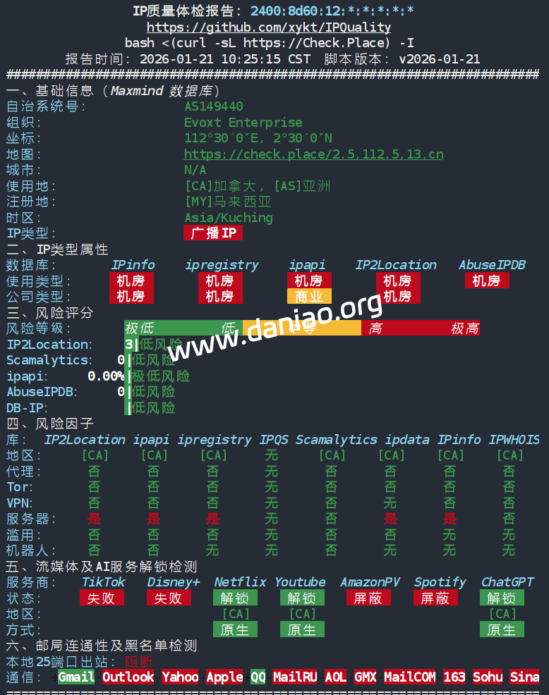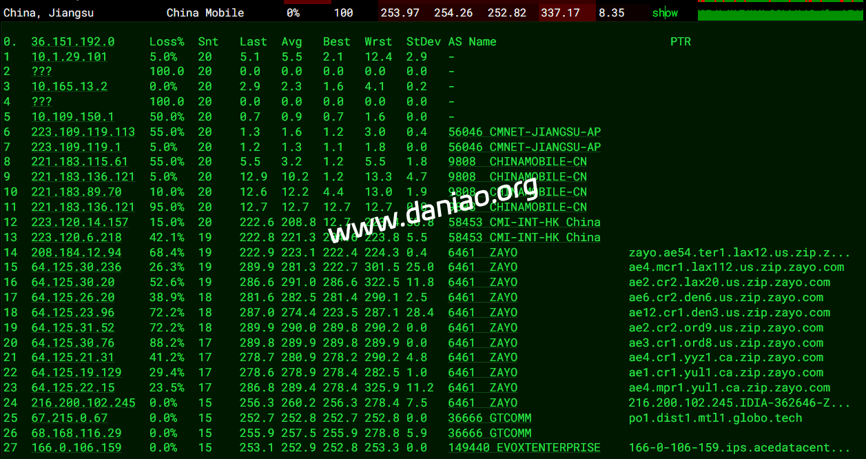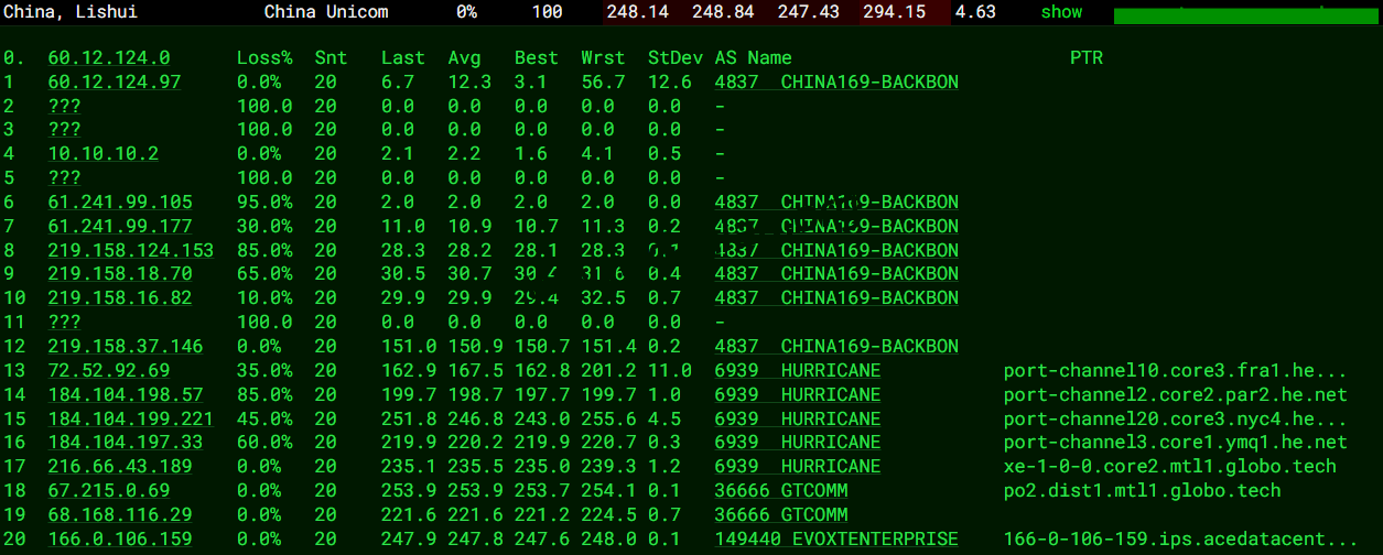 五、三网回程路由(线路可能随网络负载动态变化) 北京 电信 AS36666 -> 163 地理路径:马来西亚 -> 加拿大 -> 美国 -> 北京 自治系统路径:AS149440 -> AS36666 -> AS4134 -> AS23724 1 0.39ms 2400:8d60:12:*:*:*:*:* AS149440 马来西亚 evoxt.com 2 0.63ms 2001:19c0:1:*:*:*:*:* AS36666 加拿大 globo.tech 7 14.45ms 2001:504:36:*:*:*:*:* AS4134 美国 纽约 纽约 DE-CIX New York - China Telecom - 10Gbps chinatelecom.com.cn 9-11 225.96ms 240e:0:a:*:*:*:*:* AS4134 中国 北京 chinatelecom.com.cn 电信 12-14 225.88ms 240e:0:9000:*:*:*:*:* AS23724 中国 北京 bjtelecom.net 电信 16 220.42ms 240e:904:800:*:*:*:*:* AS23724 中国 北京市 bjtelecom.net 电信 北京 联通 Zayo -> 4837 地理路径:马来西亚 -> 加拿大 -> 美国 -> 上海 -> 北京 自治系统路径:AS149440 -> AS36666 -> AS6461 -> AS6939 -> AS6461 -> AS4837 -> AS4808 1 0.45ms 2400:8d60:12:*:*:*:*:* AS149440 马来西亚 evoxt.com 2 0.80ms 2001:19c0:1:*:*:*:*:* AS36666 加拿大 globo.tech 4 0.98ms 2001:438:8000:*:*:*:*:* AS6461 美国 zayo.com 5 59.44ms 2001:438:ffff:*:*:*:*:* AS6461 加拿大 魁北克省 蒙特利尔 zayo.com 6 8.86ms 2001:470:0:*:*:*:*:* AS6939 加拿大 安大略 多伦多 he.net 11 254.99ms 2001:470:0:*:*:*:*:* AS6939 美国 加利福尼亚 圣何塞 he.net 12 60.03ms 2001:438:ffff:*:*:*:*:* AS6461 美国 加利福尼亚 洛杉矶 zayo.com 13 236.90ms 2408:8000:2:*:*:*:*:* AS4837 中国 上海 chinaunicom.cn 联通 14-16 206.47ms 2408:8000:2:*:*:*:*:* AS4837 中国 北京 chinaunicom.cn 联通 17-18 237.57ms 2408:8000:1f10:*:*:*:*:* AS4808 中国 北京 www.bbn.com.cn 联通 19 236.56ms 2408:8706:0:*:*:*:*:* AS4808 中国 北京市 www.bbn.com.cn 联通 北京 移动 Cogent -> CMI 地理路径:马来西亚 -> 加拿大 -> 英国 -> 香港 -> 上海 -> 北京 自治系统路径:AS149440 -> AS36666 -> AS174 -> AS58453 -> AS9808 1 0.41ms 2400:8d60:12:*:*:*:*:* AS149440 马来西亚 evoxt.com 2 0.61ms 2001:19c0:1:*:*:*:*:* AS36666 加拿大 globo.tech 4-5 1.30ms 2001:550:2:*:*:*:*:* AS174 加拿大 魁北克 蒙特利尔 cogentco.com 8 75.90ms 2001:550:0:*:*:*:*:* AS174 英国 英格兰 斯劳 cogentco.com 12 283.17ms 2402:4f00:2000:*:*:*:*:* AS58453 中国 香港 cmi.chinamobile.com 13-15 264.75ms 2409:8080:0:*:*:*:*:* AS9808 中国 上海 chinamobileltd.com 移动 16-19 305.11ms 2409:8080:0:*:*:*:*:* AS9808 中国 北京 chinamobileltd.com 移动 20 298.27ms 2409:8c00:7821:*:*:*:*:* AS9808 中国 北京市 chinamobileltd.com 移动 上海 电信 AS36666 -> 163 地理路径:马来西亚 -> 加拿大 -> 美国 -> 上海 自治系统路径:AS149440 -> AS36666 -> AS4134 -> AS4812 1 0.52ms 2400:8d60:12:*:*:*:*:* AS149440 马来西亚 evoxt.com 2 0.52ms 2001:19c0:1:*:*:*:*:* AS36666 加拿大 globo.tech 7 20.56ms 2001:504:36:*:*:*:*:* AS4134 美国 纽约 纽约 DE-CIX New York - China Telecom - 10Gbps chinatelecom.com.cn 9 194.31ms 240e:0:a:*:*:*:*:* AS4134 中国 chinatelecom.com.cn 电信 11 208.62ms 240e::f:*:*:*:*:* AS4134 中国 上海 chinatelecom.com.cn 电信 12-14 198.45ms 240e:18:10:*:*:*:*:* AS4812 中国 上海 chinatelecom.cn 16 199.45ms 240e:96c:6000:*:*:*:*:* AS4812 中国 上海市 chinatelecom.cn 电信 上海 联通 Cogent -> 4837 地理路径:马来西亚 -> 加拿大 -> 美国 -> 北京 -> 江苏 自治系统路径:AS149440 -> AS36666 -> AS174 -> AS4837 1 0.60ms 2400:8d60:12:*:*:*:*:* AS149440 马来西亚 evoxt.com 2 1.14ms 2001:19c0:1:*:*:*:*:* AS36666 加拿大 globo.tech 4-6 1.53ms 2001:550:2:*:*:*:*:* AS174 加拿大 魁北克省 蒙特利尔 cogentco.com 8 13.81ms 2001:550:0:*:*:*:*:* AS174 美国 俄亥俄 克里夫兰 cogentco.com 9 20.86ms 2001:550:0:*:*:*:*:* AS174 美国 伊利诺伊州 芝加哥 cogentco.com 11 42.16ms 2001:550:0:*:*:*:*:* AS174 美国 德克萨斯 达拉斯 cogentco.com 12 53.54ms 2001:550:0:*:*:*:*:* AS174 美国 得克萨斯州 埃尔帕索 cogentco.com 17-19 271.78ms 2408:8000:2:*:*:*:*:* AS4837 中国 北京 chinaunicom.cn 联通 20-22 260.72ms 2408:8000:2:*:*:*:*:* AS4837 中国 江苏 南京 chinaunicom.cn 联通 24 291.85ms 2408:873c:6810:*:*:*:*:* AS4837 中国 江苏省 泰州市 chinaunicom.cn 联通 上海 移动 Zayo -> CMI 地理路径:马来西亚 -> 加拿大 -> 美国 -> 上海 自治系统路径:AS149440 -> AS36666 -> AS6461 -> AS9808 -> AS6461 -> AS9808 -> AS58453 -> AS9808 1 0.71ms 2400:8d60:12:*:*:*:*:* AS149440 马来西亚 evoxt.com 2 0.63ms 2001:19c0:1:*:*:*:*:* AS36666 加拿大 globo.tech 4 8.89ms 2001:438:8000:*:*:*:*:* AS6461 美国 zayo.com 5 59.66ms 2001:438:ffff:*:*:*:*:* AS6461 加拿大 魁北克省 蒙特利尔 zayo.com 6 59.52ms 2001:438:ffff:*:*:*:*:* AS6461 加拿大 安大略 多伦多 zayo.com 9-10 60.10ms 2001:438:ffff:*:*:*:*:* AS6461 美国 科罗拉多 丹佛 zayo.com 11 223.26ms 2409:8080:0:*:*:*:*:* AS9808 中国 上海 chinamobileltd.com 移动 12 59.60ms 2001:438:ffff:*:*:*:*:* AS6461 美国 加利福尼亚 洛杉矶 zayo.com 16 235.69ms 2402:4f00:1000:*:*:*:*:* AS58453 中国 香港 cmi.chinamobile.com 移动 18 262.75ms 2409:8c1e:68e0:*:*:*:*:* AS9808 中国 上海市 chinamobileltd.com 移动 广东 电信 AS36666 -> 163 地理路径:马来西亚 -> 加拿大 -> 广东 自治系统路径:AS149440 -> AS36666 -> AS4134 -> AS4816 1 0.58ms 2400:8d60:12:*:*:*:*:* AS149440 马来西亚 evoxt.com 2 0.85ms 2001:19c0:1:*:*:*:*:* AS36666 加拿大 globo.tech 9-10 227.17ms 240e:0:a:*:*:*:*:* AS4134 中国 chinatelecom.com.cn 电信 11 223.51ms 240e::f:*:*:*:*:* AS4134 中国 广东 广州 chinatelecom.com.cn 电信 12-13 235.48ms 240e:1f:6000:*:*:*:*:* AS4816 中国 广东 深圳 电信 16 223.11ms 240e:97c:4008:*:*:*:*:* AS4816 中国 广东省 深圳市 电信 广东 联通 Zayo -> 4837 地理路径:马来西亚 -> 加拿大 -> 美国 -> 北京 -> 广东 自治系统路径:AS149440 -> AS36666 -> AS6461 -> AS6939 -> AS6461 -> AS4837 -> AS17623 -> AS135061 -> AS17623 1 0.59ms 2400:8d60:12:*:*:*:*:* AS149440 马来西亚 evoxt.com 2 0.93ms 2001:19c0:1:*:*:*:*:* AS36666 加拿大 gl