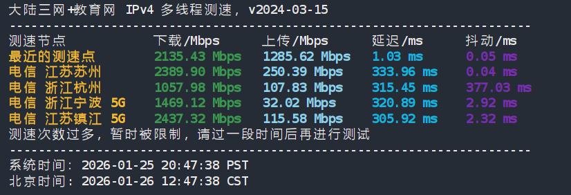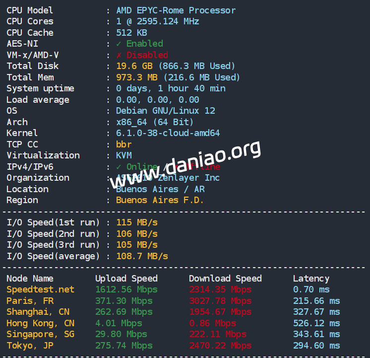zenlayer的阿根廷(布宜诺斯艾利斯)云服务器有原生IP和广播IP业务可供选择,云服务器按时计费,新加坡弹性云$0.007/小时,$5.716/月。配置为1核/1G内存/20G SSD,带宽可选固定带宽计费 、流量包计费 、合并突发 95 计费 、合并带宽组计费。其中流量包计费方式,默认带宽为10000 Mbps,建议设置公网带宽上限,控制流量使用,以防产生过高的费用。如果不设置,您的带宽上限将是默认值也就是10000 Mbps。这篇文章就来测评该商家的新加坡弹性云服务器(原生ip),分享下具体的测评数据~~~